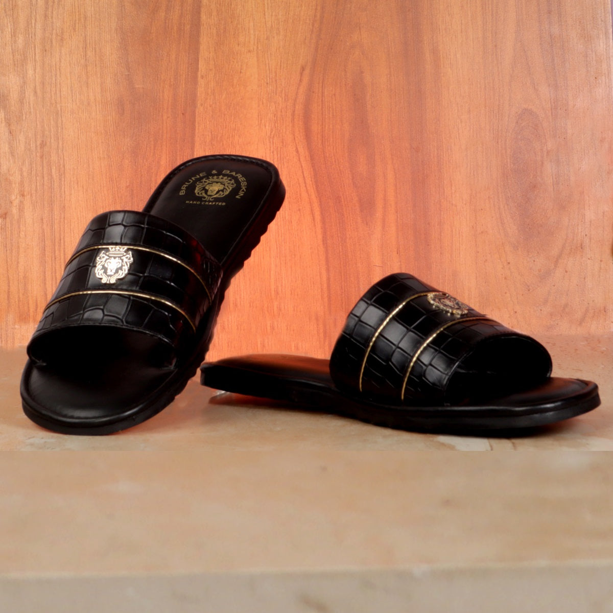 When it comes to Slippers, comfortably is the highest priority. These genuine leather Slippers are the luxurious piece of beauty from Brune & Bareskin. The Combination of cut croco slippers are crafted with precisely selected deep cut croco leather around the slippers. The metal lion logo on the Black leather strap makes these slippers a perfect choice. The Golden stripes and the Brune & Bareskin Lion logo on Black color uplifting its elegance. These slide-in slippers build especially for the folks who like to stay in style always. Experience the utmost comfort while walking with gel Injected extra cushioned memory foam. Just slide in your feet and feels the utmost comfort with vogue. Club these slides of Black Golden Collection with Jeans, Shorts, and other casual wear to complete your look. A high-quality sole makes it more durable with a whole day-long wear.