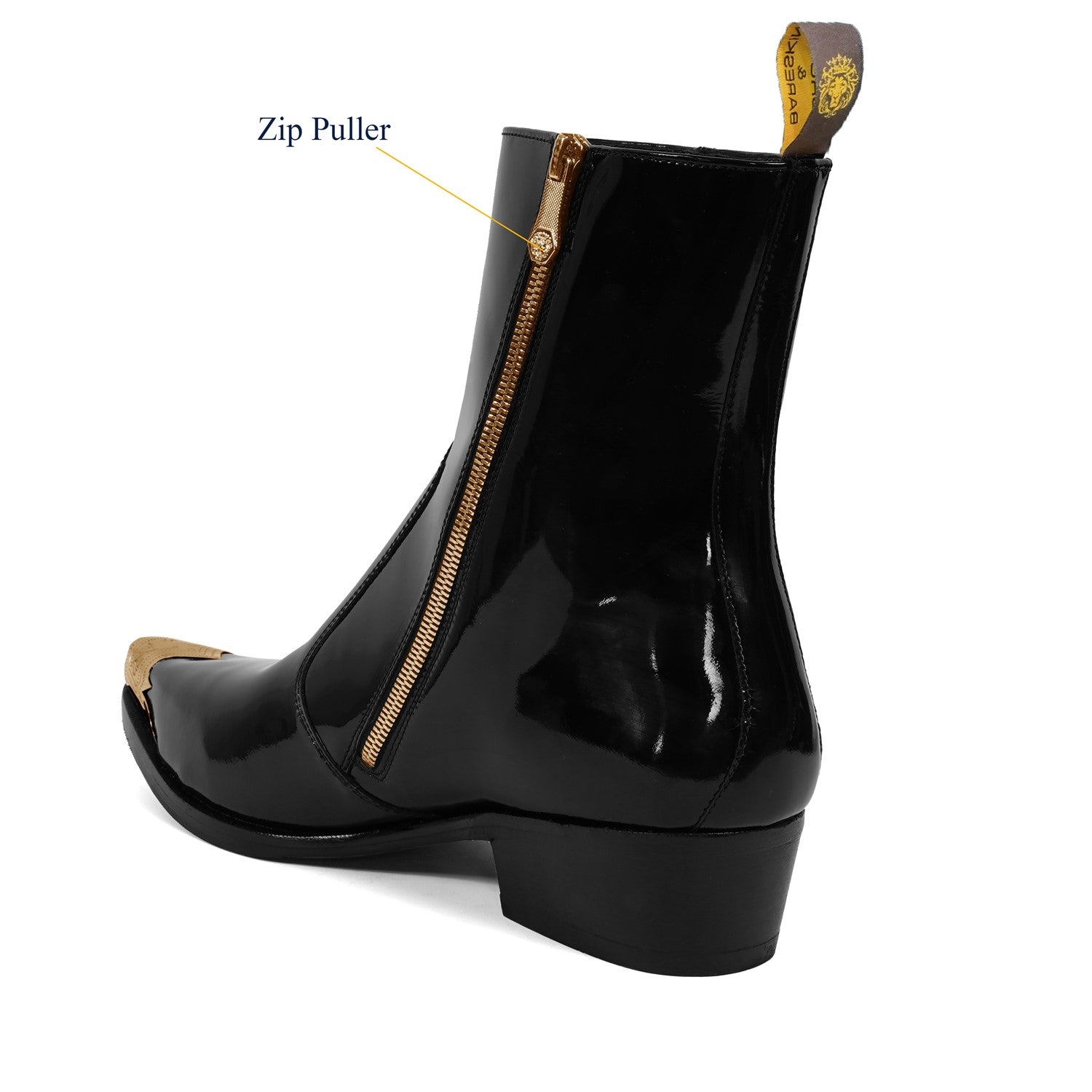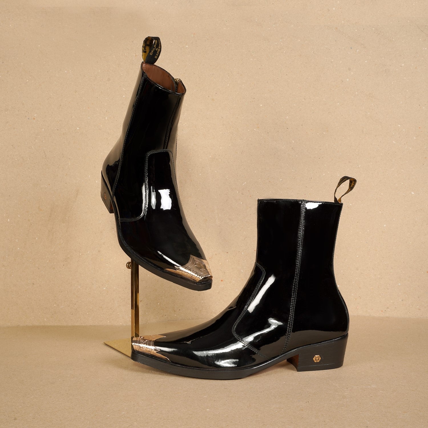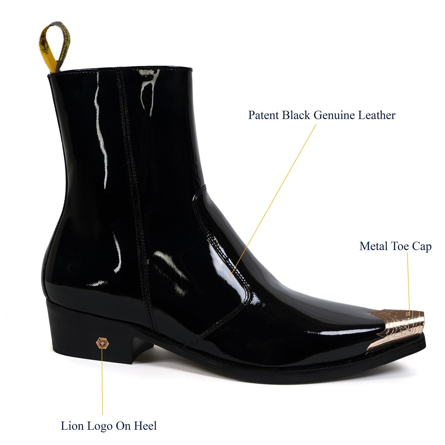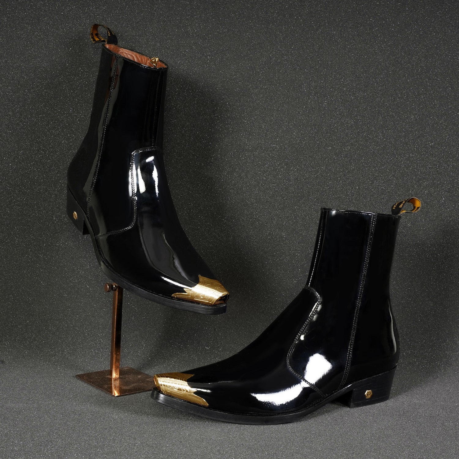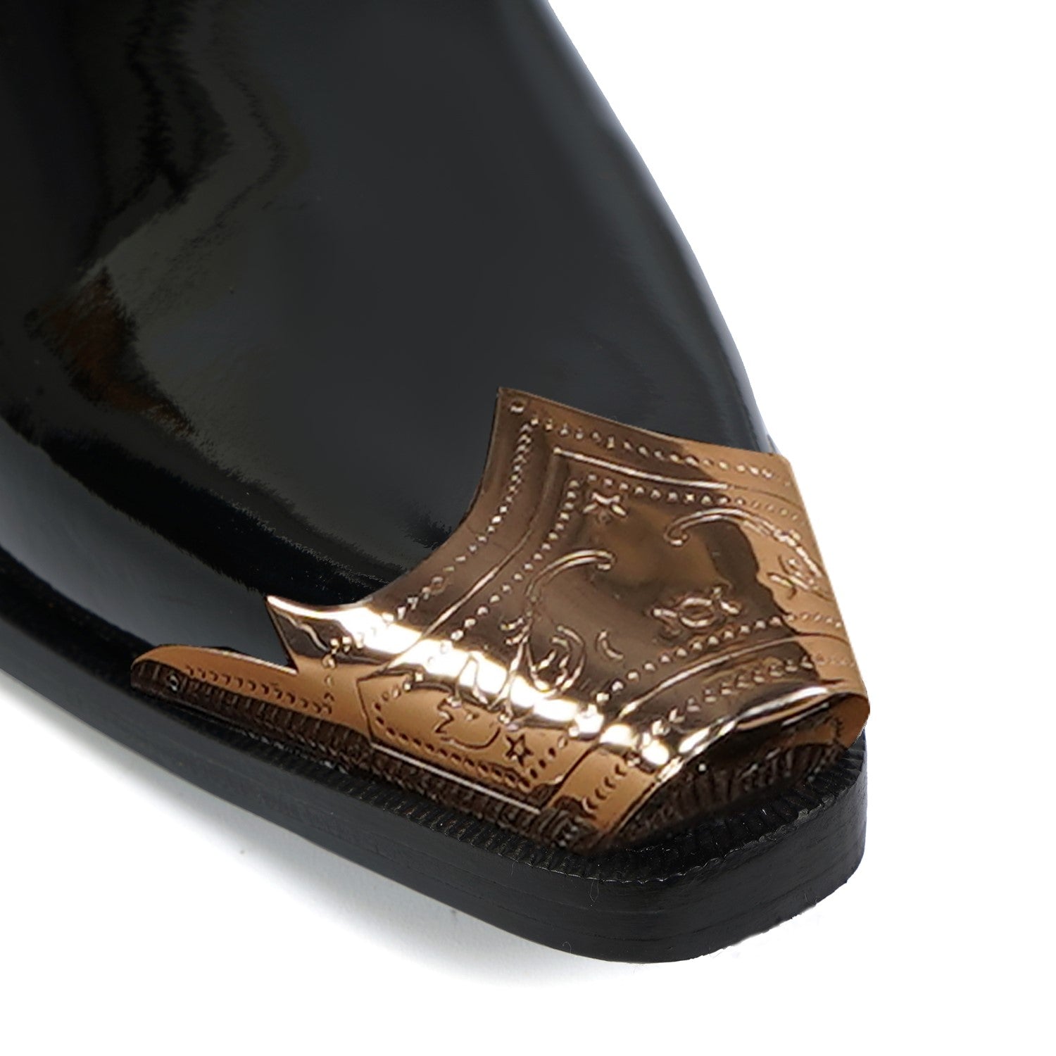 Black Patent Golden Metal Toe Cap Cuban Heel Leather Boots