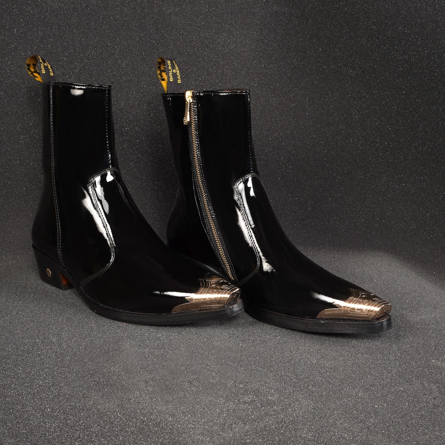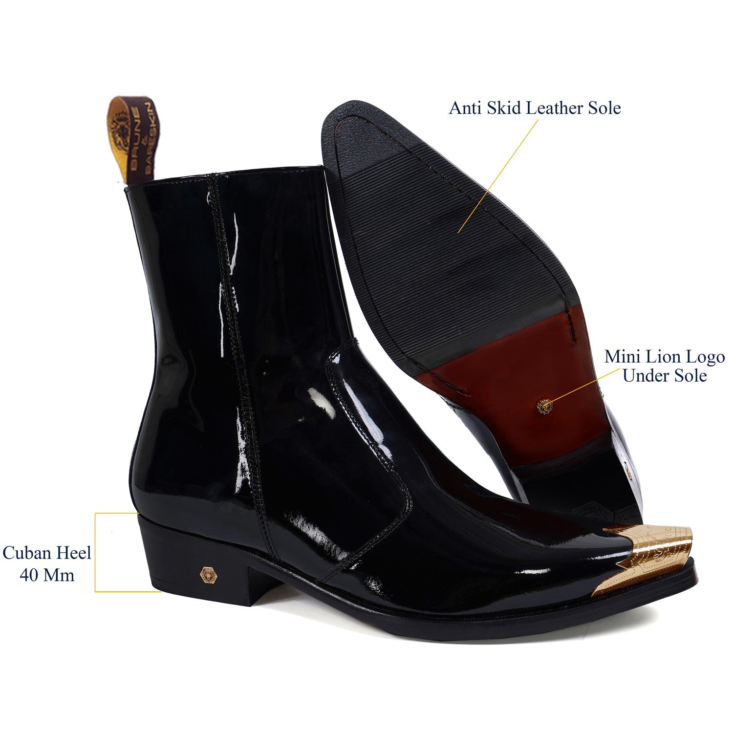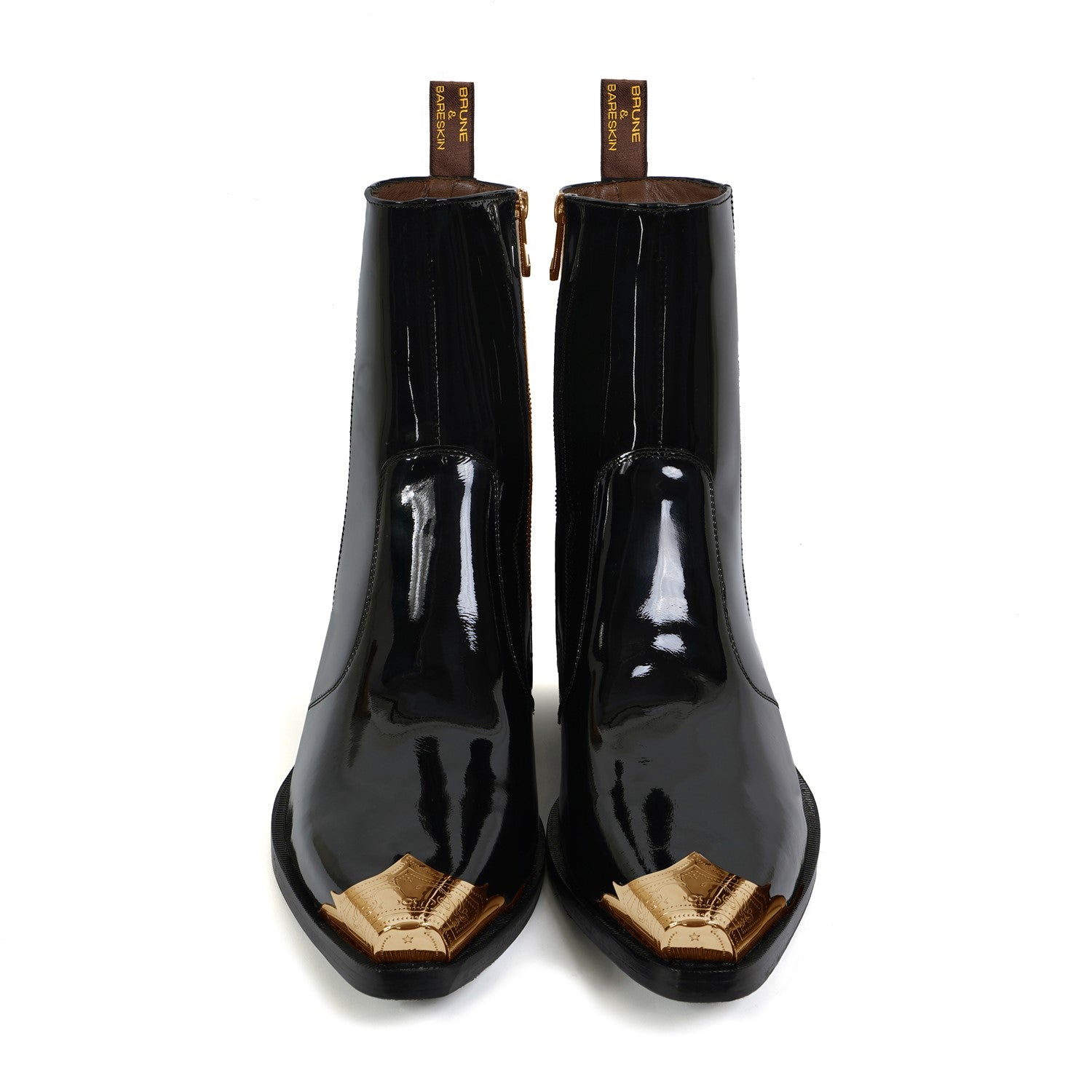 Make a bold impression with these premium boots from Brune & Bareskin, designed to elevate any outfit with a touch of class and attitude. Crafted from high-shine black patent genuine leather, these boots offer a sleek and polished look that effortlessly stands out. The distinct golden metal toe cap features intricate detailing that adds an edgy, fashion-forward twist to a timeless silhouette.