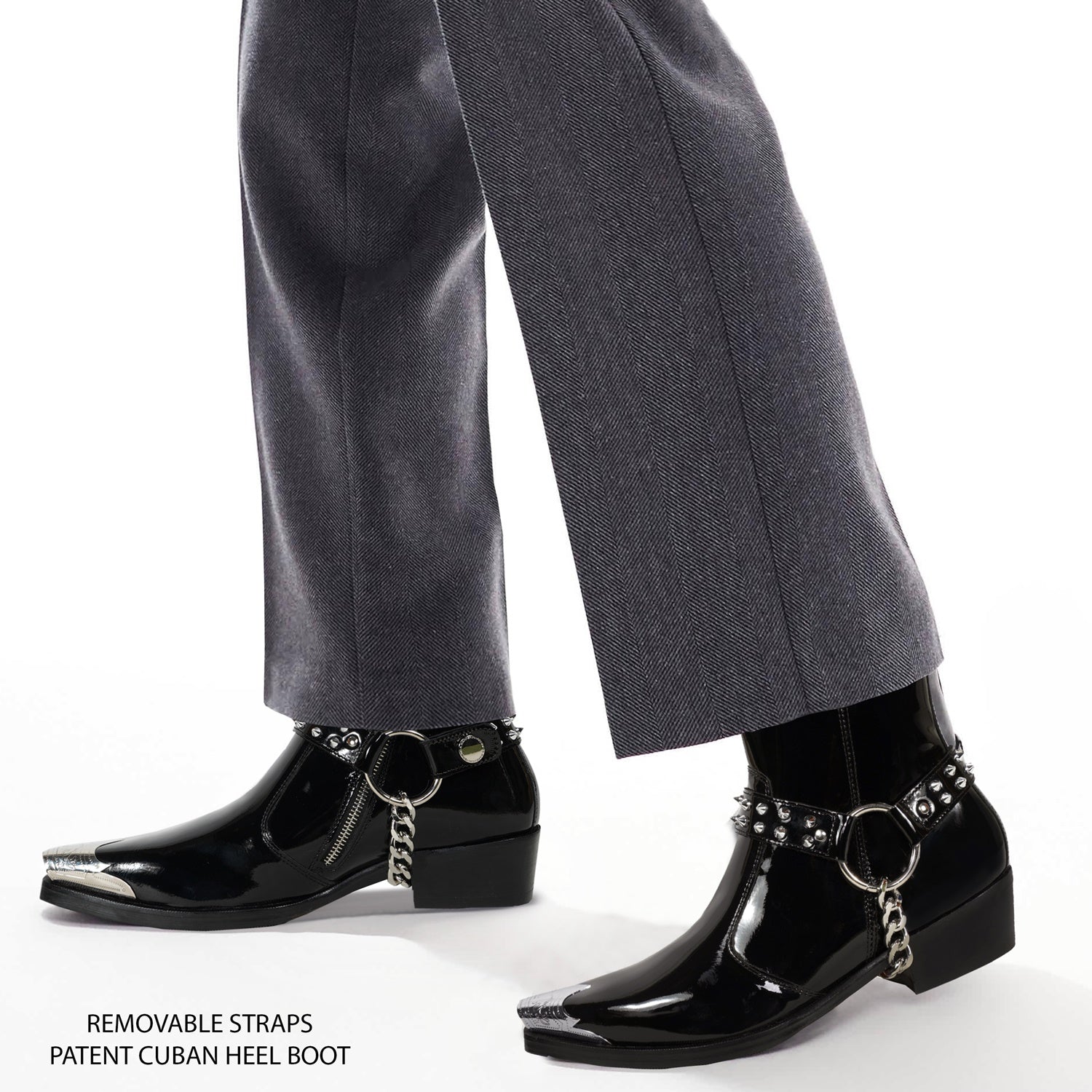 Black Patent Metal Toe Cap Cuban Heel Leather Boots with Removable Straps