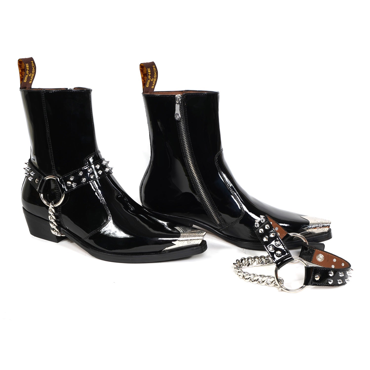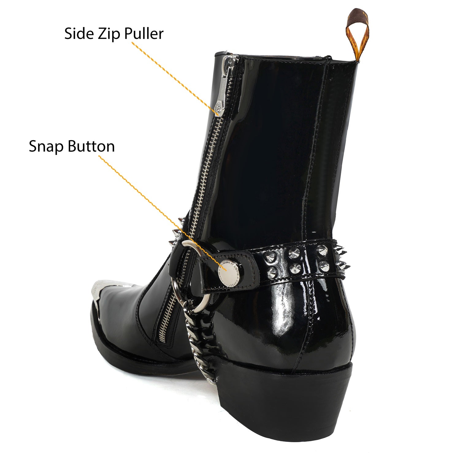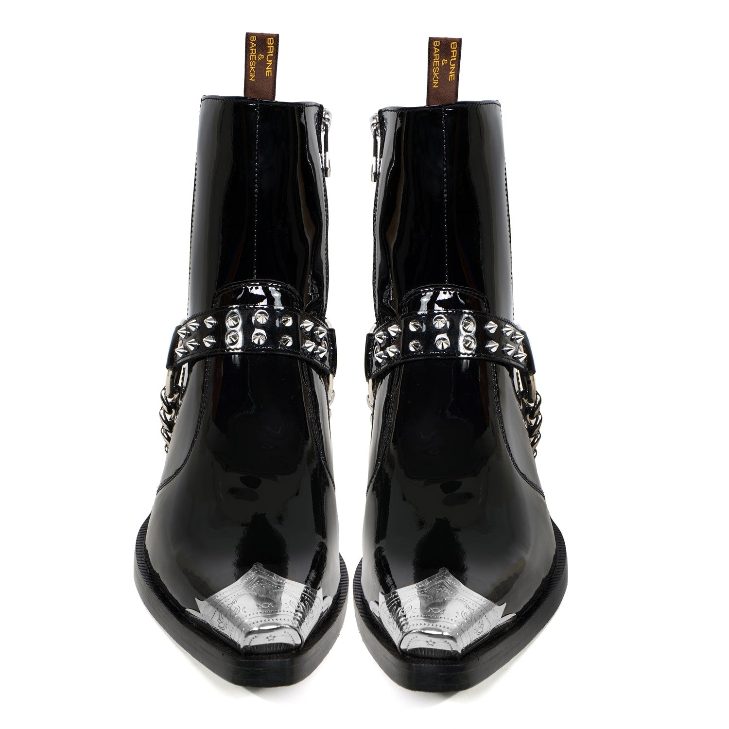 Elevate your footwear game with these black patent Cuban heel boots, designed for those who appreciate bold and statement-making style. The sleek, high-gloss finish adds a sophisticated touch, while the pointed toe is accentuated by a striking metal cap for a distinctive edge. A standout feature of these boots is the removable studded harness strap, complete with metal ring and chain detailing, allowing for versatile styling options. The side zipper ensures easy wear, while the low Cuban heel provides both comfort and a subtle lift. Perfectly blending rockstar attitude with Western influences, these boots pair effortlessly with jeans, tailored trousers, or edgy evening wear, making them an essential addition to any fashion-forward wardrobe.