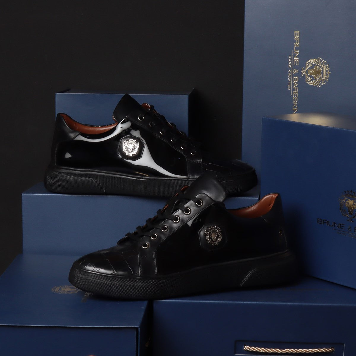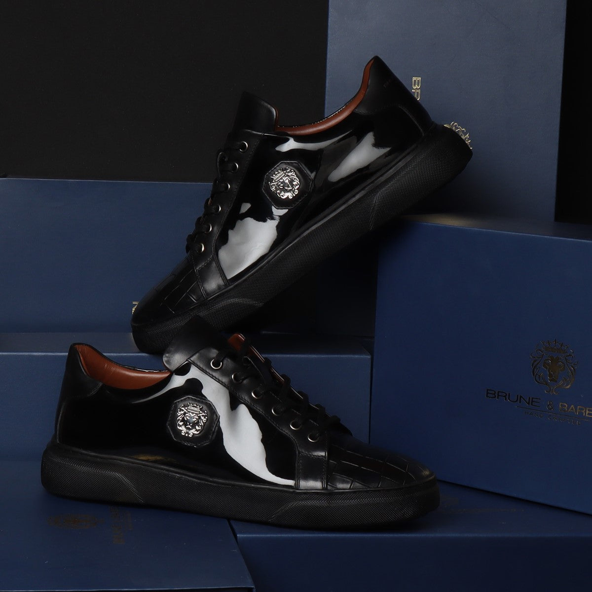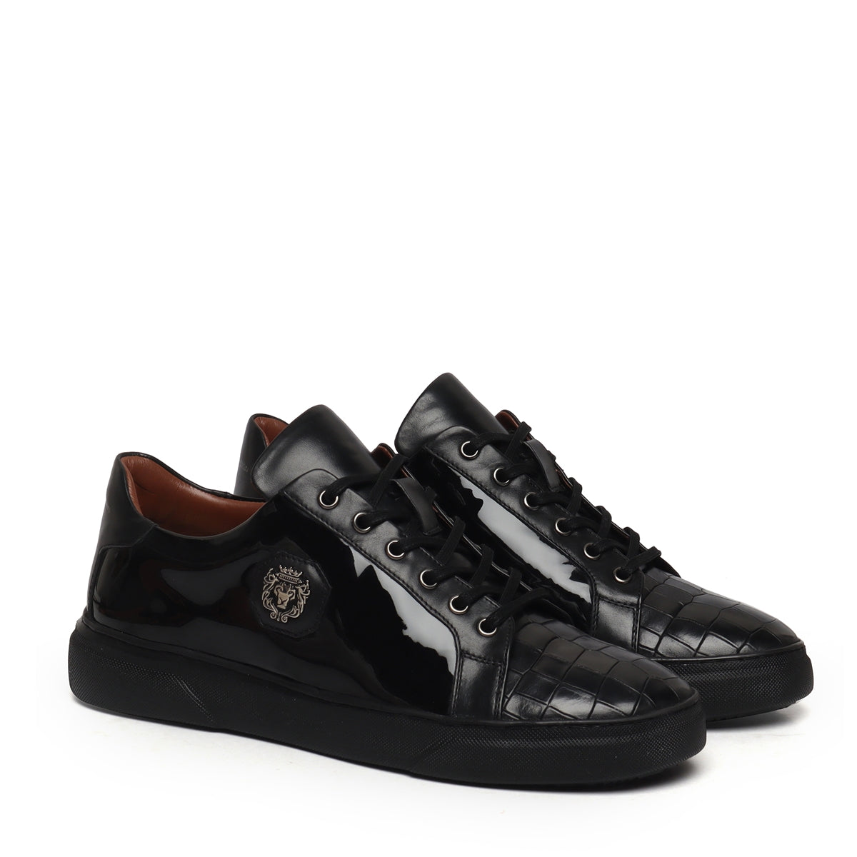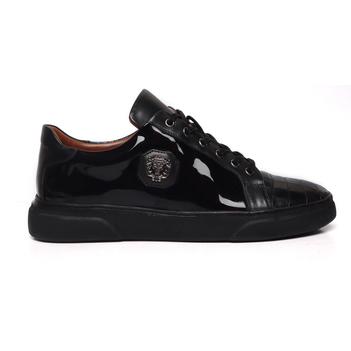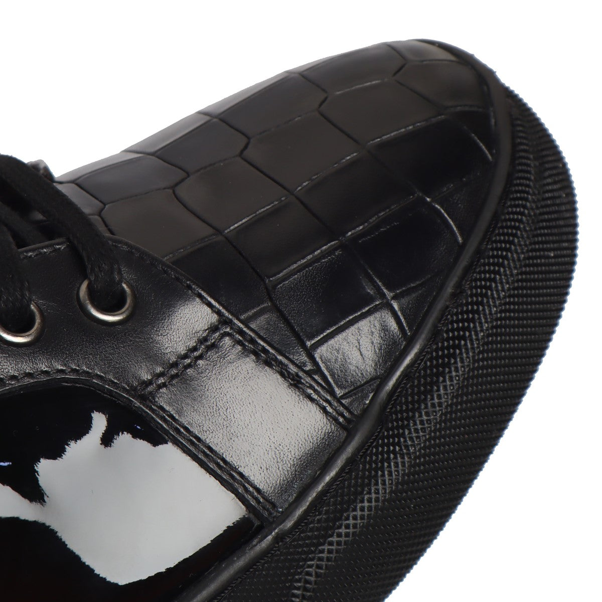 Black Low-Top Sneakers Patent with Deep Cut Croco Toe Leather
