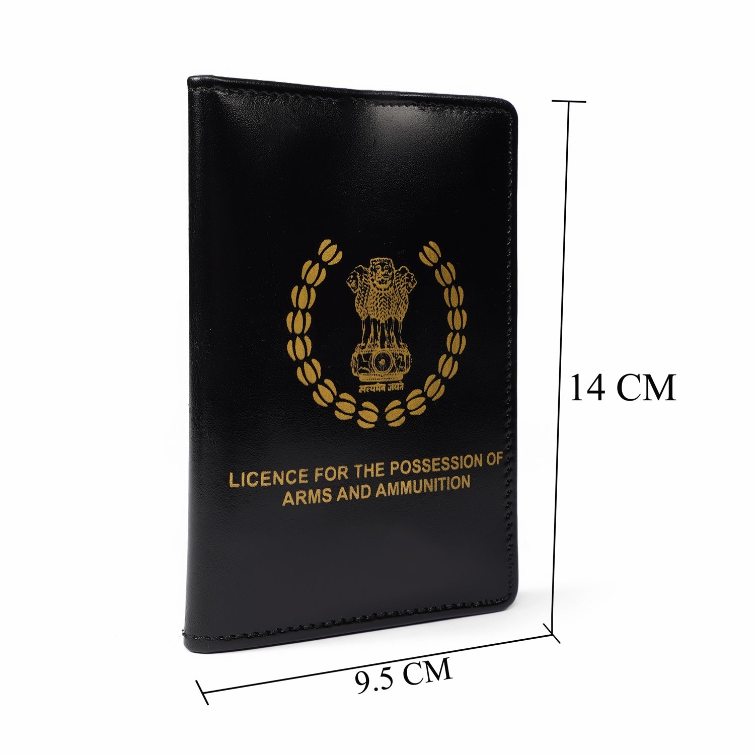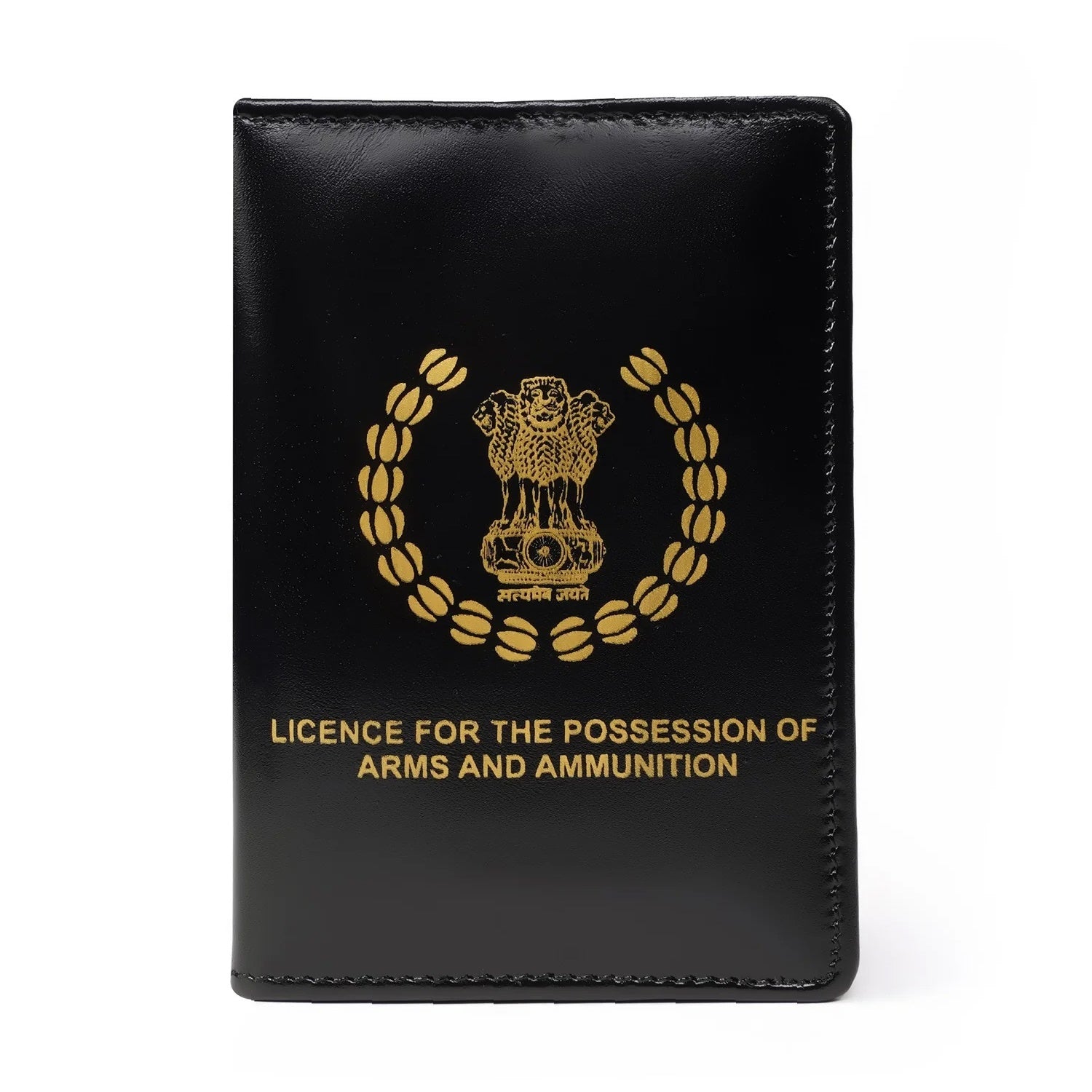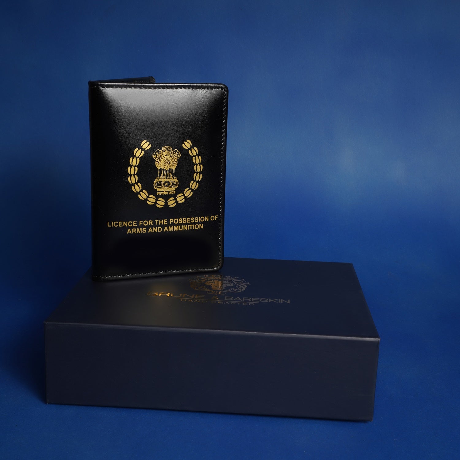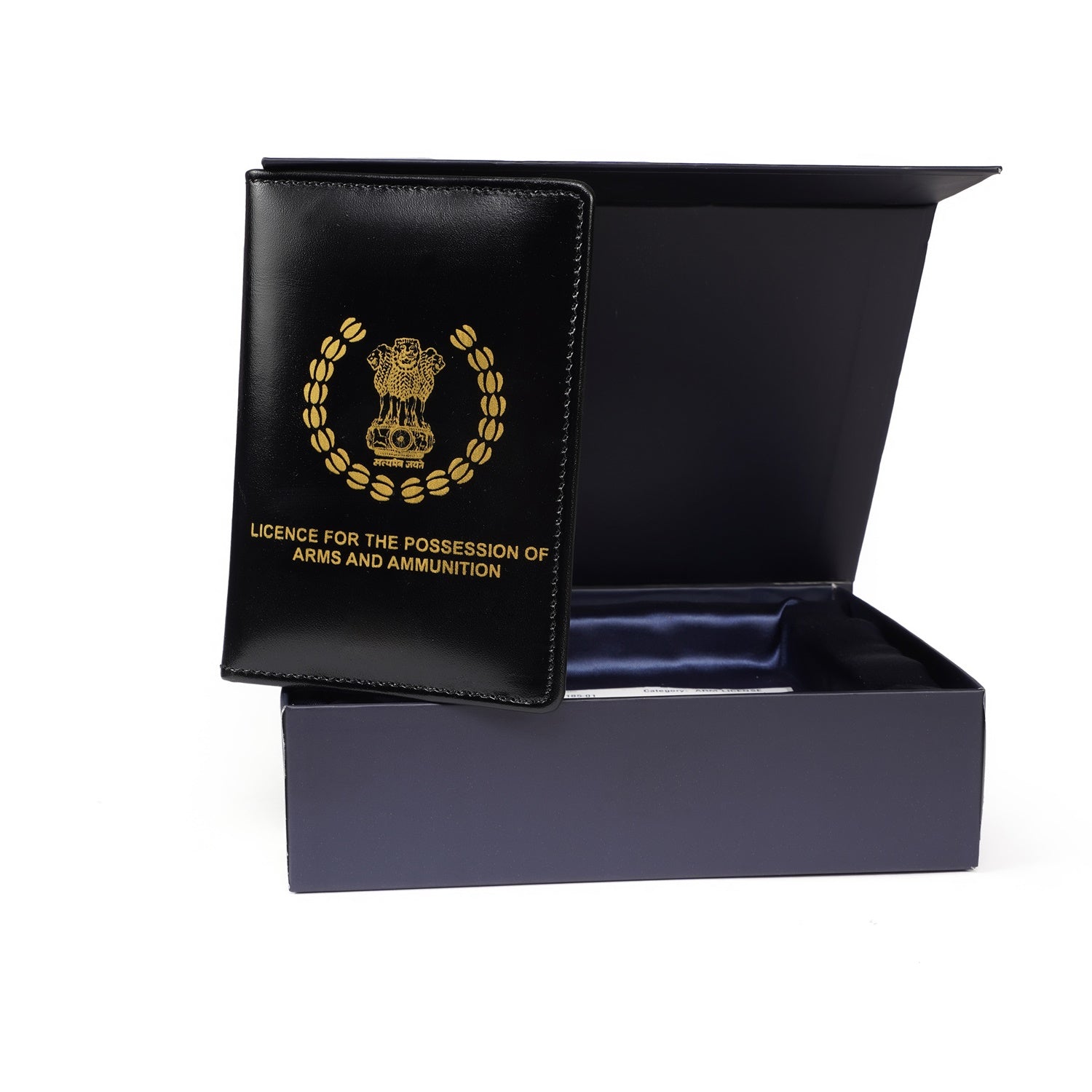 This premium black leather holder is designed to keep your arms and ammunition license secure, protected, and easily accessible. Crafted from high-quality leather, it features an elegant golden emblem, giving it a sophisticated and professional look. The durable material ensures long-lasting protection against wear and tear, while the sleek design adds a touch of style to your essential document. Perfect for responsible firearm owners, this holder combines functionality and elegance, making it an ideal choice for both professional and personal use.