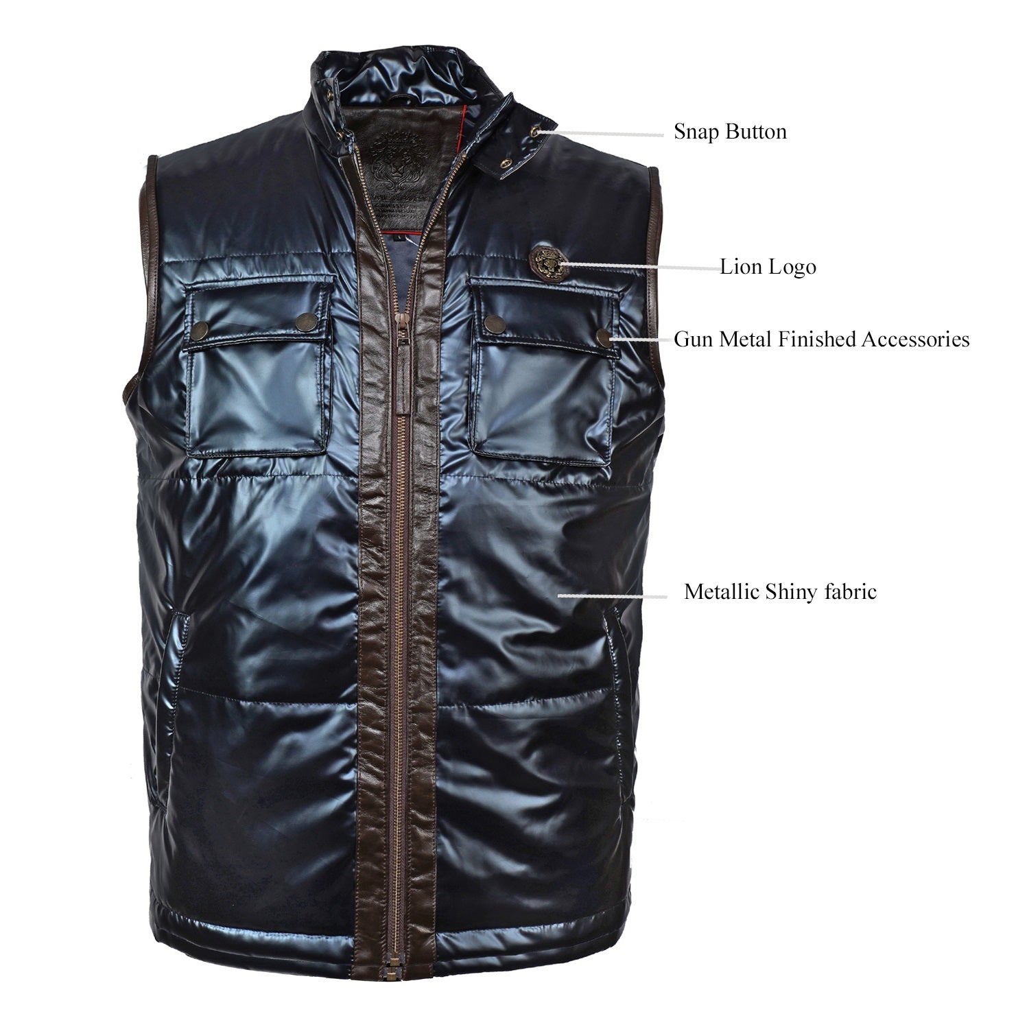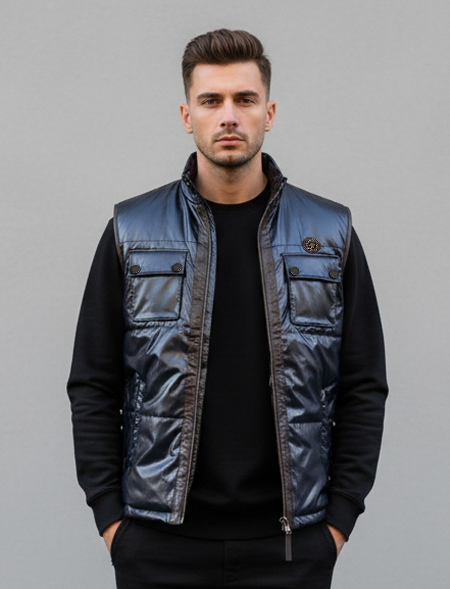 This Metallic finish Vest redefines modern sophistication with its sleek design and functional details. Featuring a front zipper closure and two flap pockets, it blends contemporary style with everyday practicality. The metallic finish adds a bold, premium edge — perfect for those who love to make a statement while staying effortlessly comfortable.