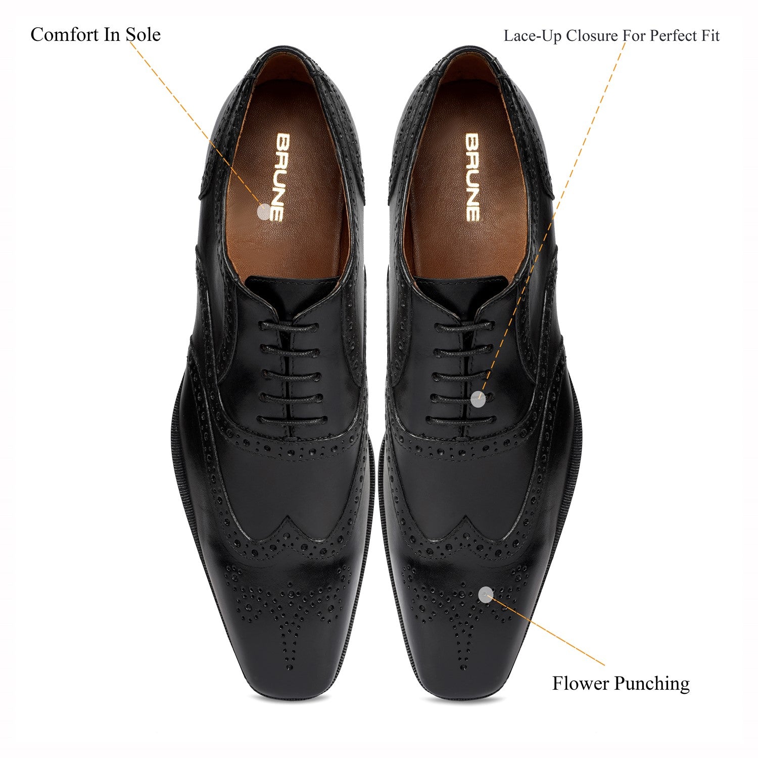 These are the full punching brogue wingtip formal Shoes with Oxford lace-up closure. The smart punching Brogue goes from front to end looks astonishing. The black full brogue design makes it party-friendly Shoes. This leather Lace Up Formal Oxford shoe is a very elegant pair by BRUNE & BARESKIN. It is a pair of hand finished Italian leather with sure to be satisfied fit and style. Rubber injected leather sole strengthens the grip and style statement further. Adds an element of perfect style and ensures a snug fit as well as foot balance. This astonishing pair is very comfortable to wear. Match it with your favorite Suits and be prepared to be the show-stopper at any party.