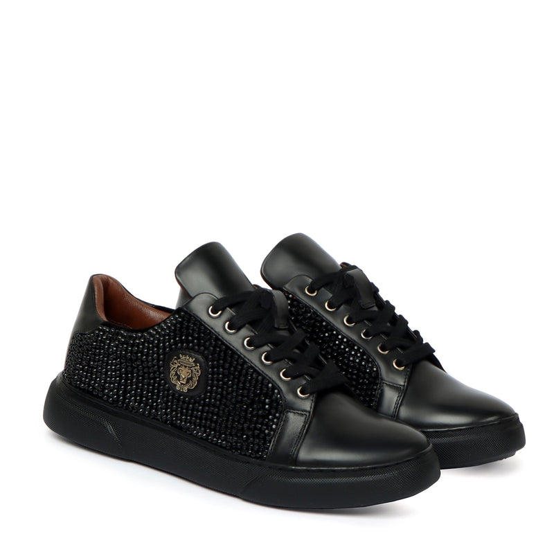 The black rhinestones on grey leather sneakers look astonishing. These handmade sneakers spell the fashion quotient on every event. Black rhinestones on quarters compliment the genuine grey leather shade of the shoe. Lace-up closure makes it very convenient to adjust the sneakers according to your feet. Black rubberized sole enhances the grip on different terrains. A padded footbed provides extra comfort while walking.