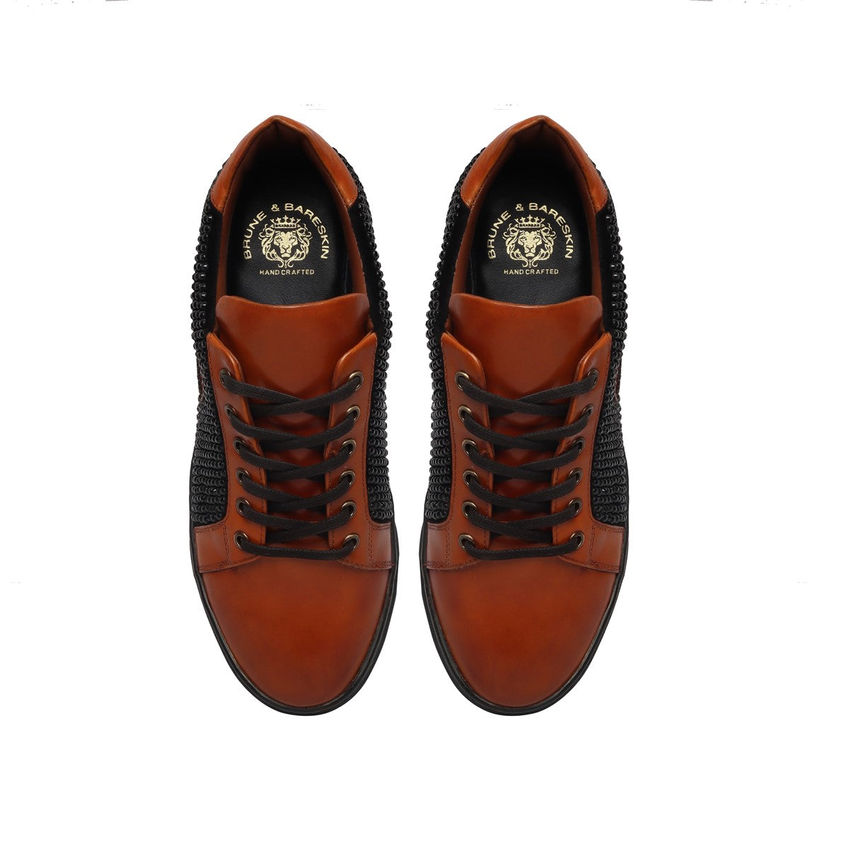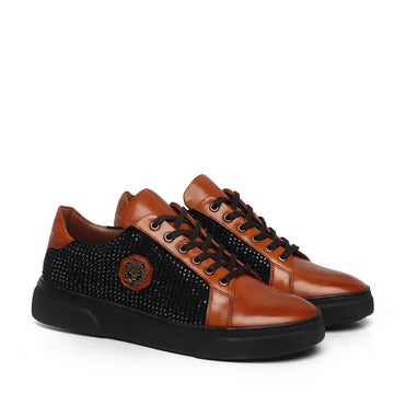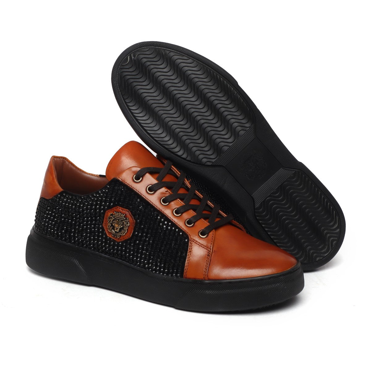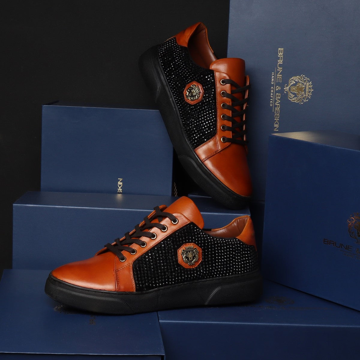 Low Top Sneakers Black Rhinestones Tan Leather by Brune & Bareskin