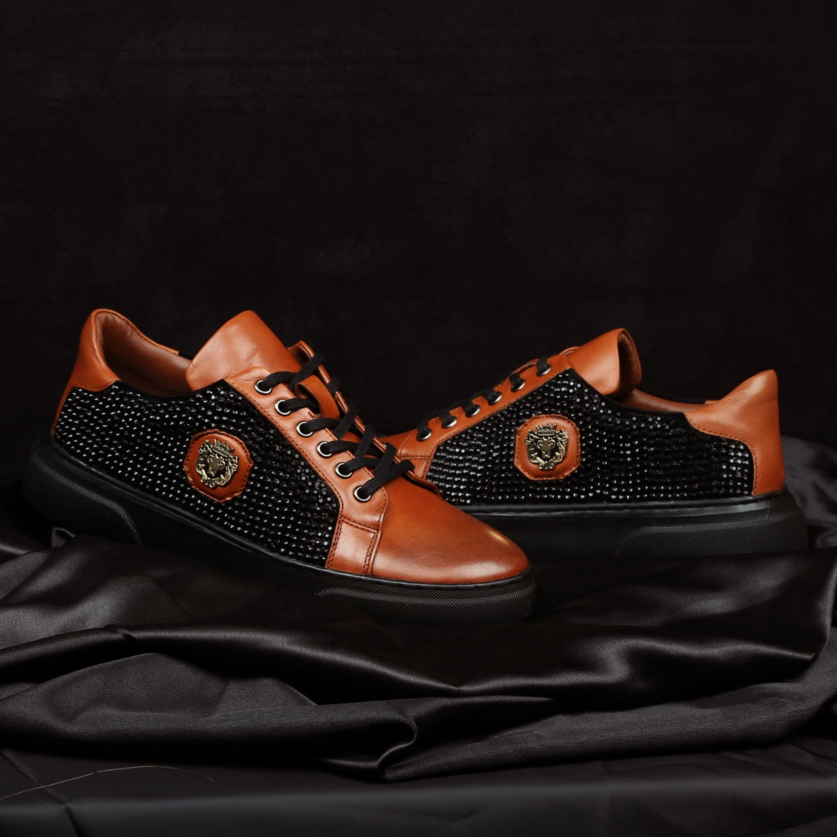 The black rhinestones on tan leather sneakers looks astonishing. This handmade sneakers spells the fashion quotient on every event. Black rhinestones on quarters compliment the genuine tan leather shade of shoe. Lace up closure makes it very convenient to adjust the sneakers according to your feet. Black rubberized sole enhances the grip on different terrains. Padded footbed provides the extra comfort while walking.