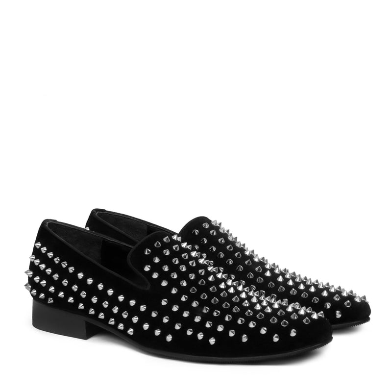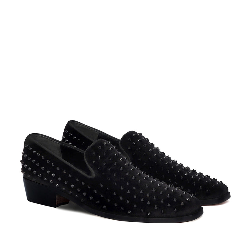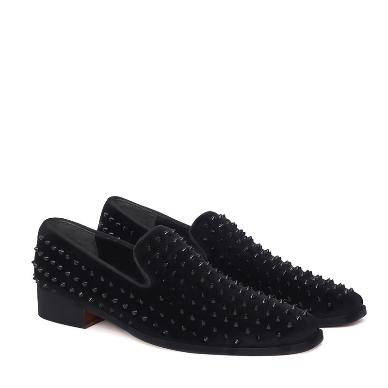 This elegant pair of Black Arrowhead Stud on a Black Suede Leather Loafer is a must-have for every fashion enthusiast out there. This type of styling bring the uniqueness to your looks. Black color leather Loafer with Black studs detailing makes this Slip-on first choice of every Fashionista. Black arrow head studs on black leather upper provides a unique swanky look. When you wear this shoe with a studded classic watch and accessories, it just leads all the gaze on you. Once you slip your foot inside the shoe, you will forget about studs and will enjoy the comfort of an extra padded insole. Padded foot-bed provides the extra comfort to the foot. The company "Brune & Bareskin" complements the fashion statement in a unique way to help customers cherry-pick from the collection & feel better & look better.