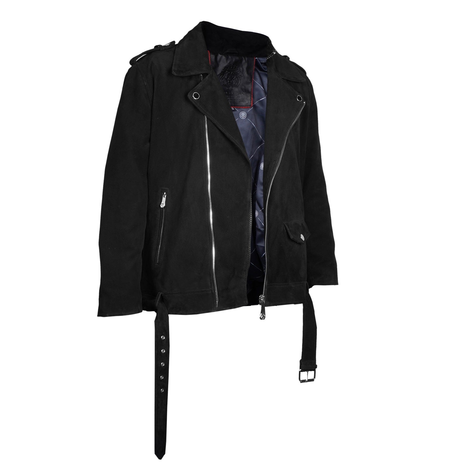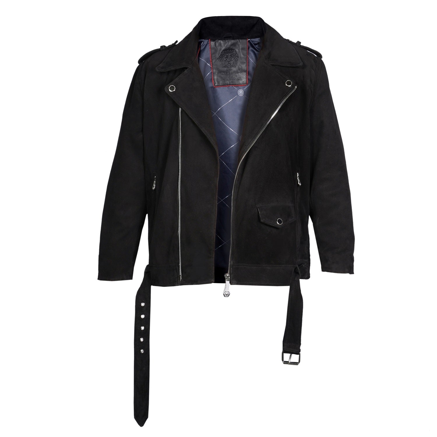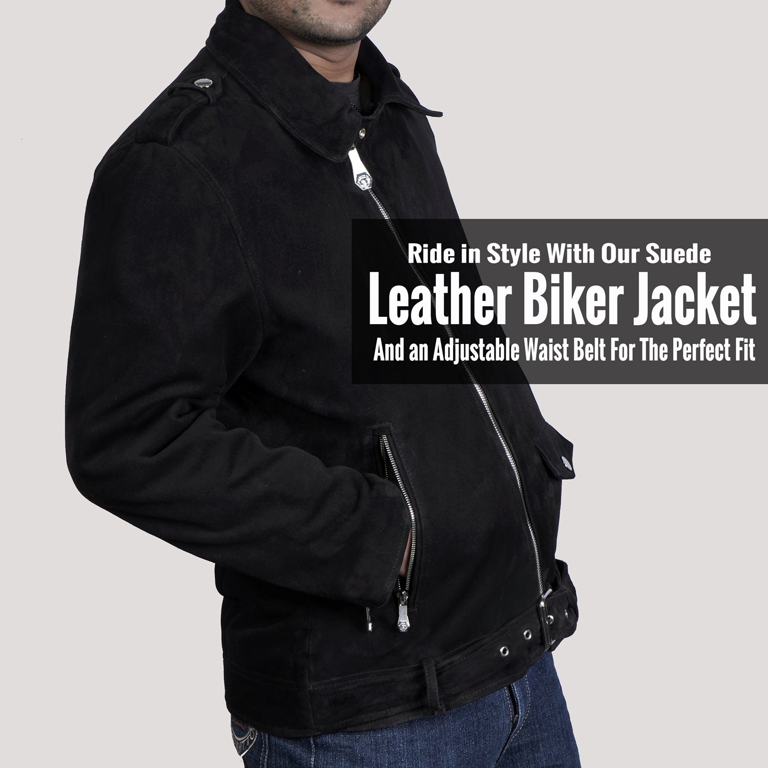 Black Suede Leather Biker Jacket with Adjustable Waist Belt by Brune & Bareskin