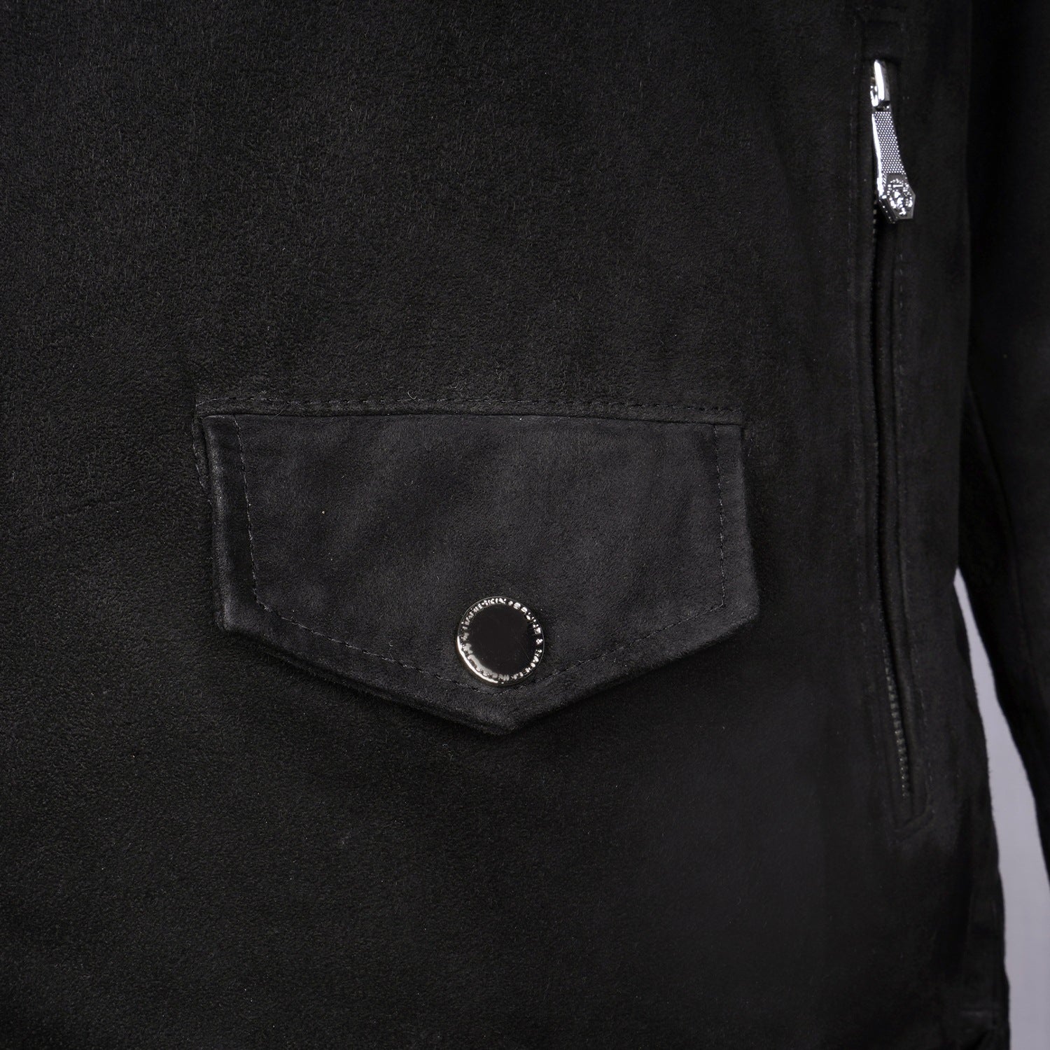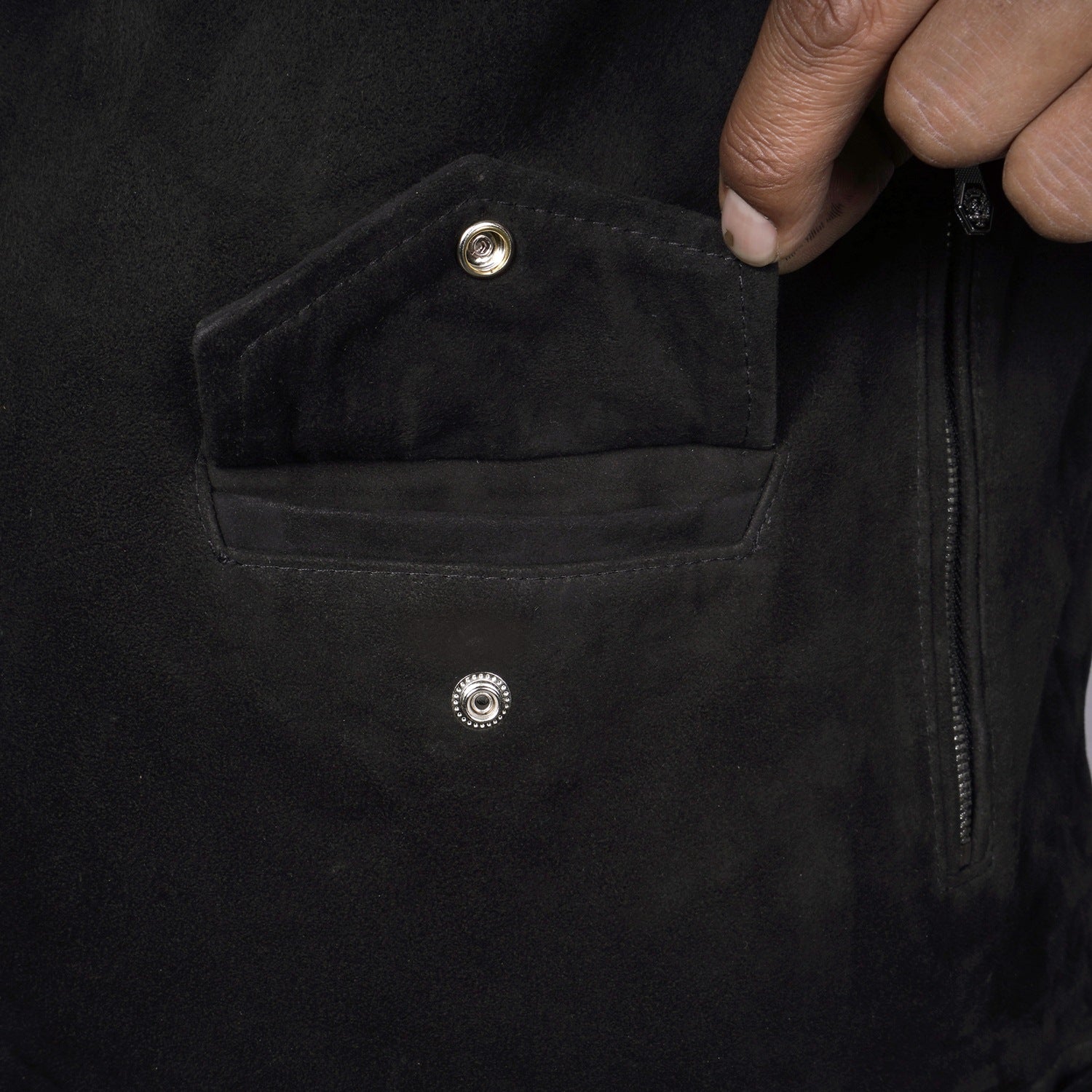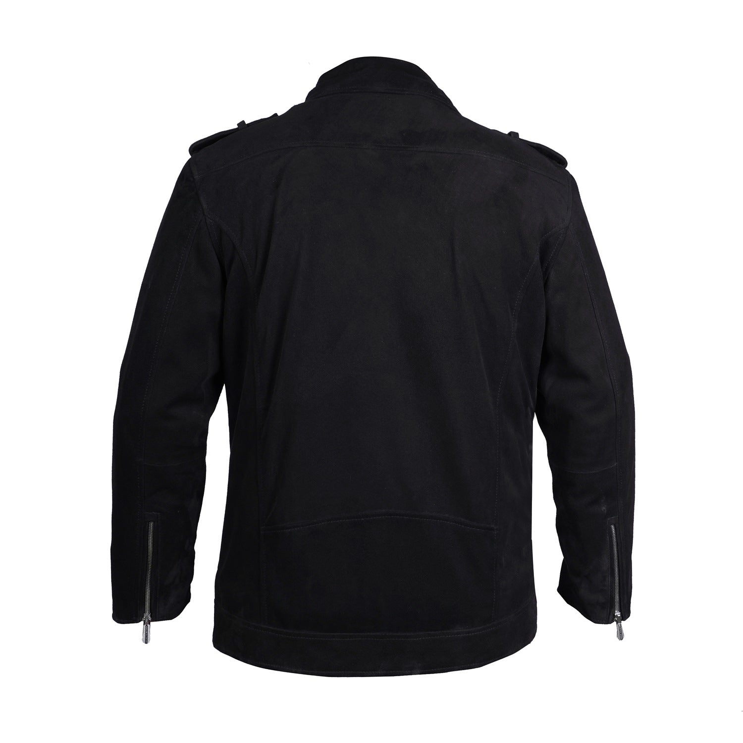 Black Suede Leather Biker Jacket with Adjustable Waist Belt by Brune & Bareskin