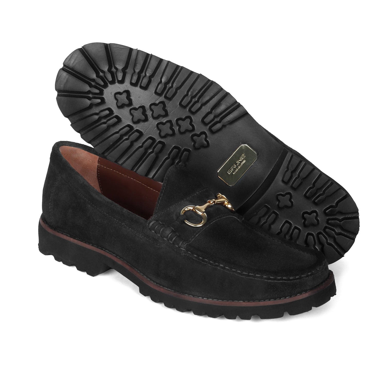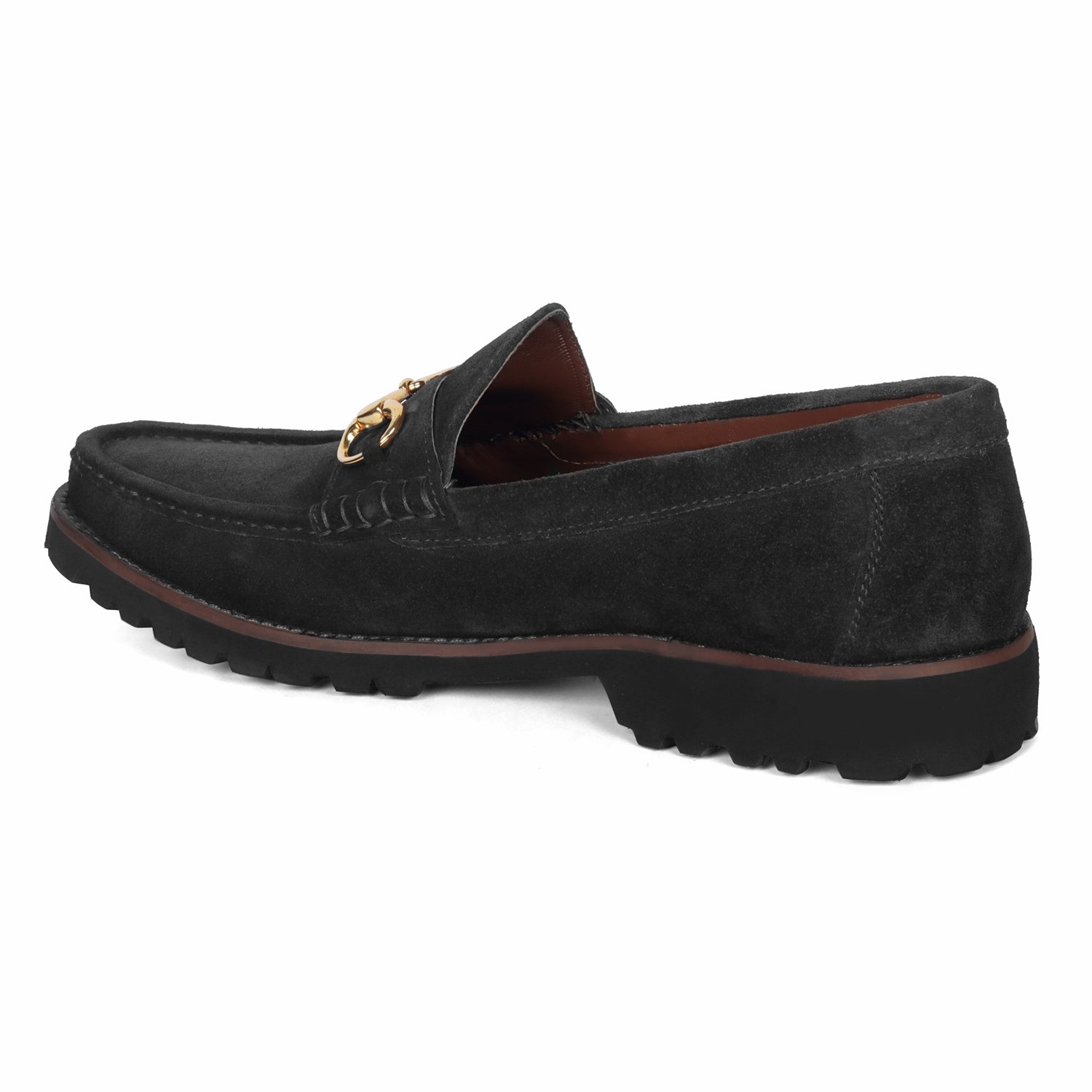Make your everyday special with these classy men's loafers. It is the best shoe category for any men's closet. Loafers remain the favorite style of shoes, as they are convenient to use and spell minimum fuss. Black suede leather enhances its look with golden metal horse-bit buckle on it. And when they are made of exemplary fitting and finish as that of the brand Brune & Bareskin, you can be sure that the shoes are nothing short of excellence. This is a very light in weight lug sole shoes and feels soft while walking. The extra cushioned in-sole provides the utmost comfort. This is a must-have pair in your footwear collection. The company "Brune & Bareskin" complements the fashion statement in a unique way to help customers cherry-pick from the collection & feel better & look better. You can get it made in your favorite color with our bespoke services.