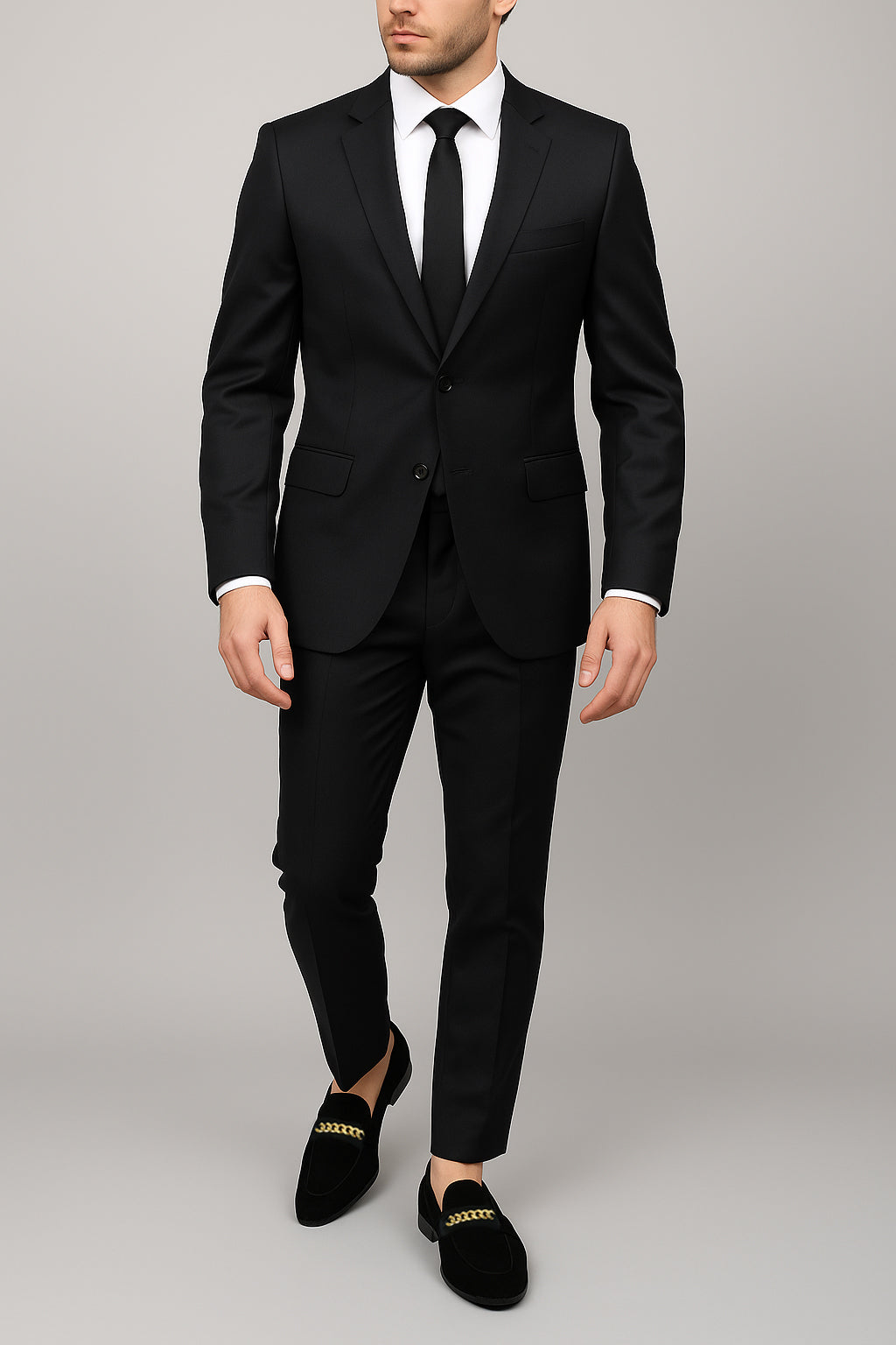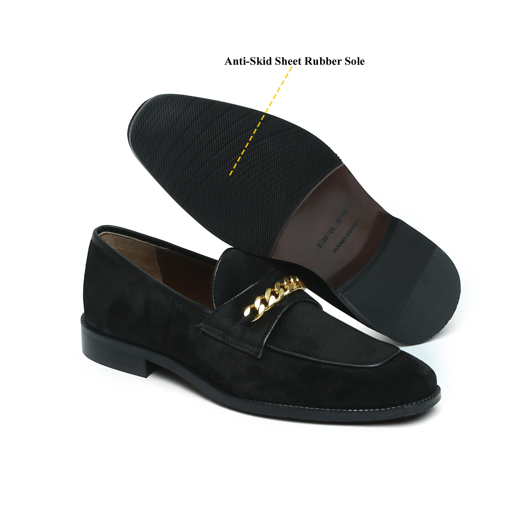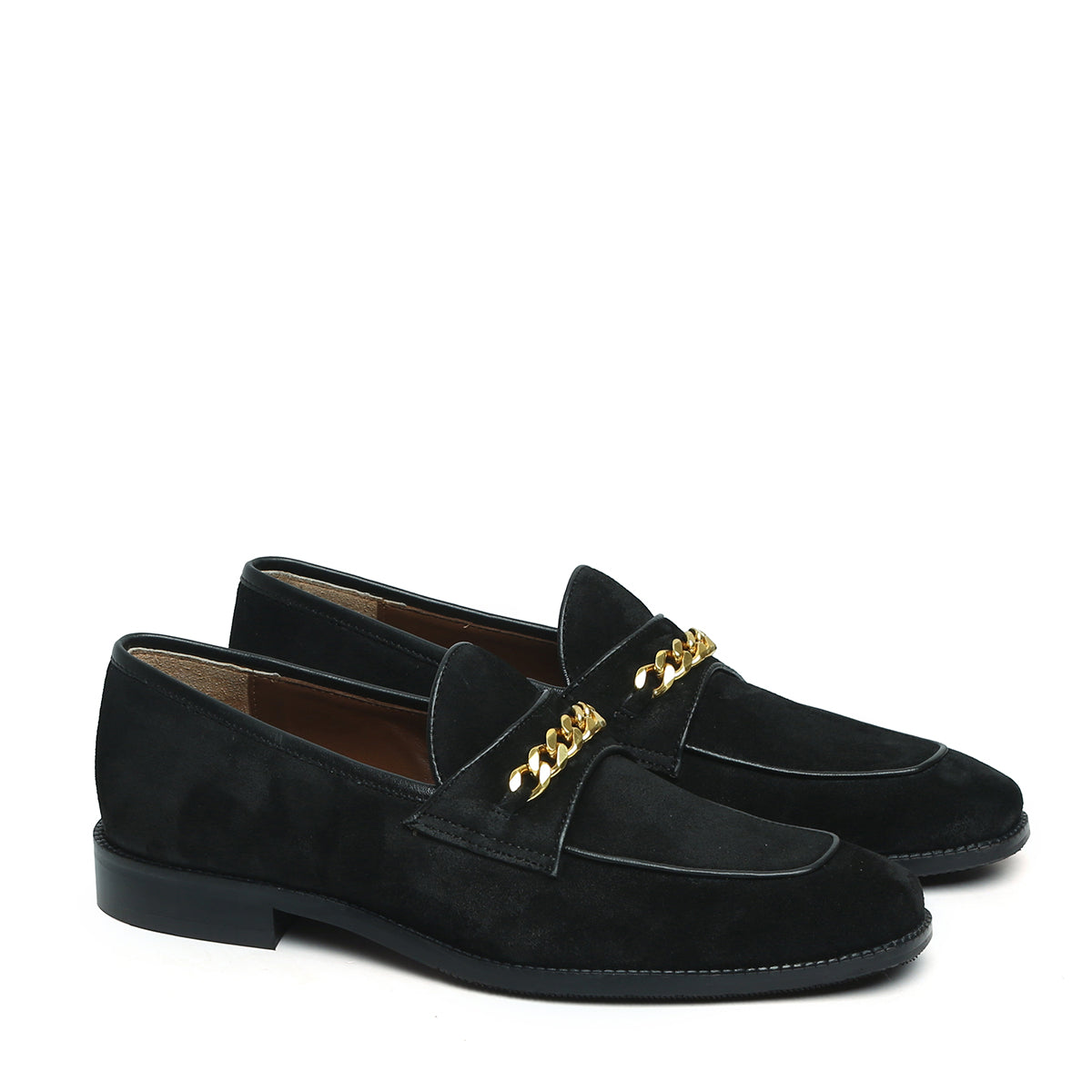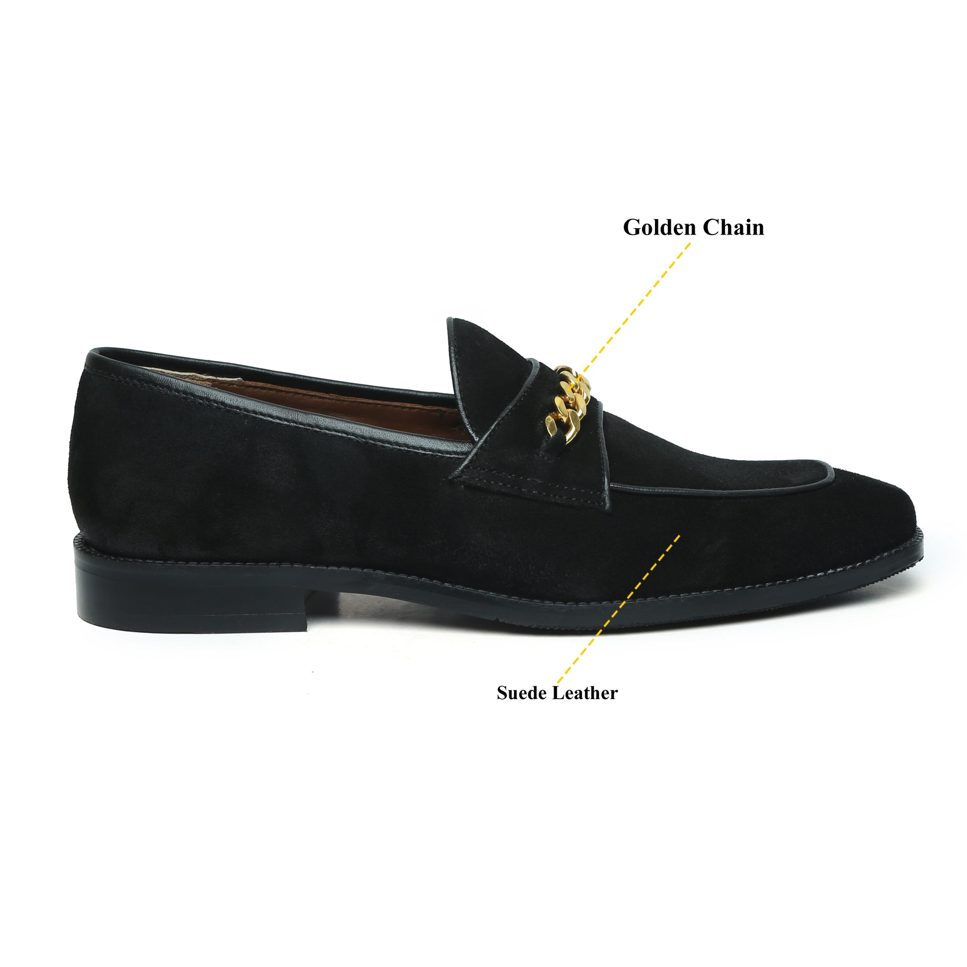 Black Suede Leather Penny Loafers with Golden Chain Embellishment