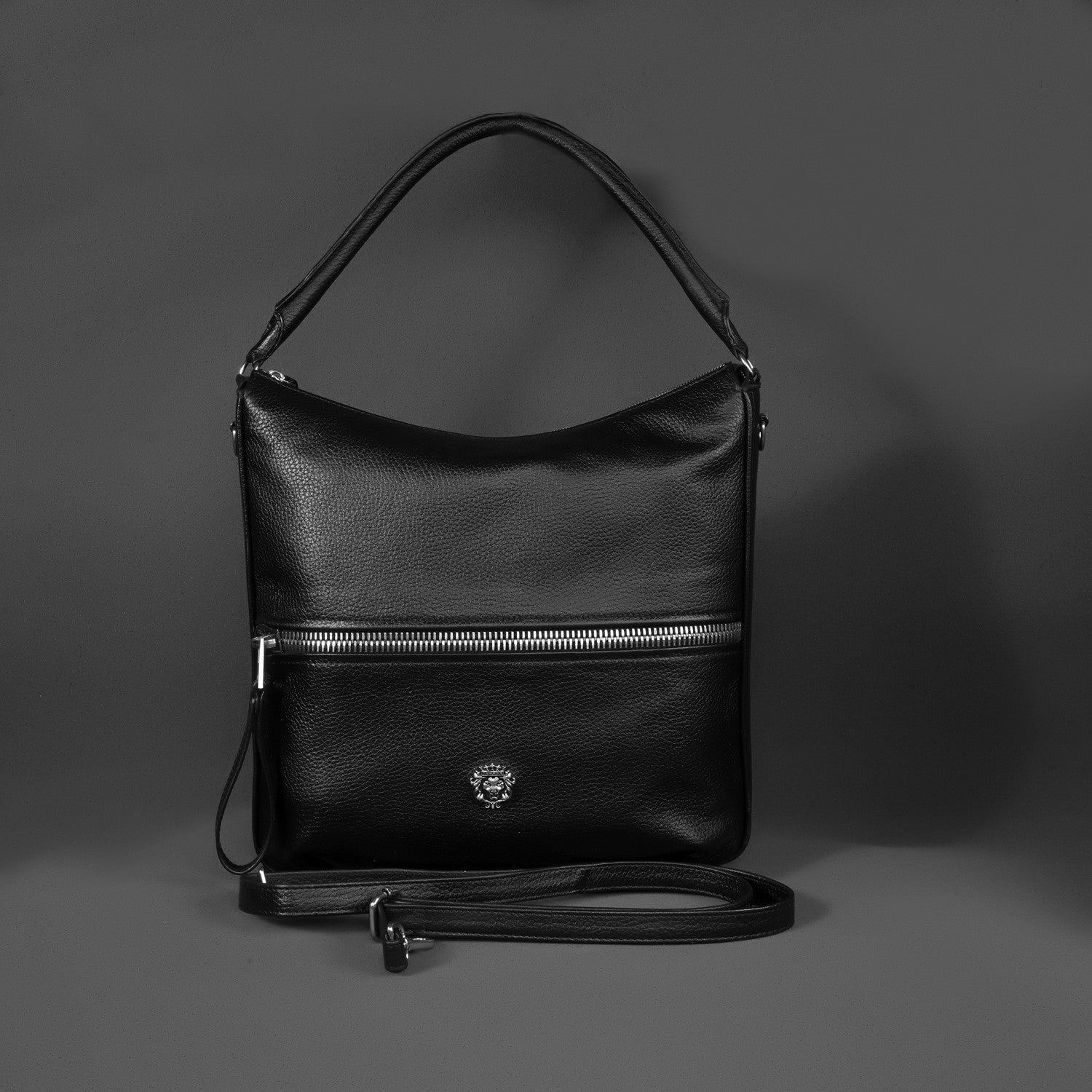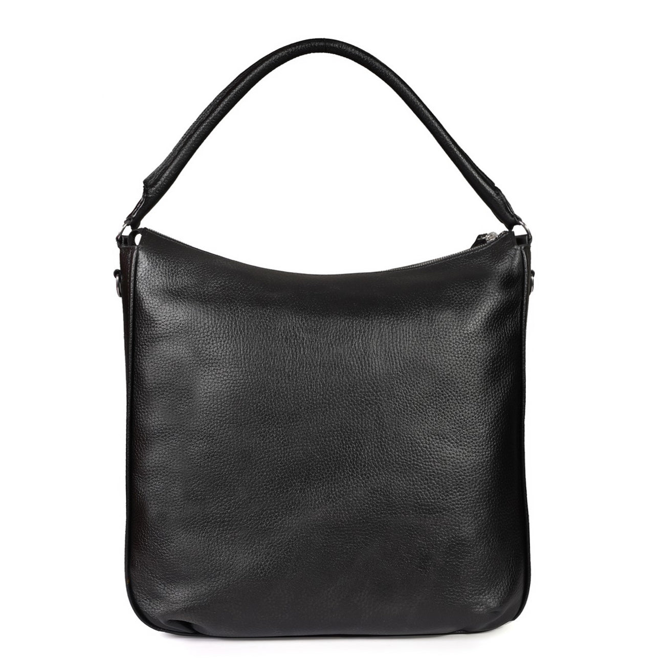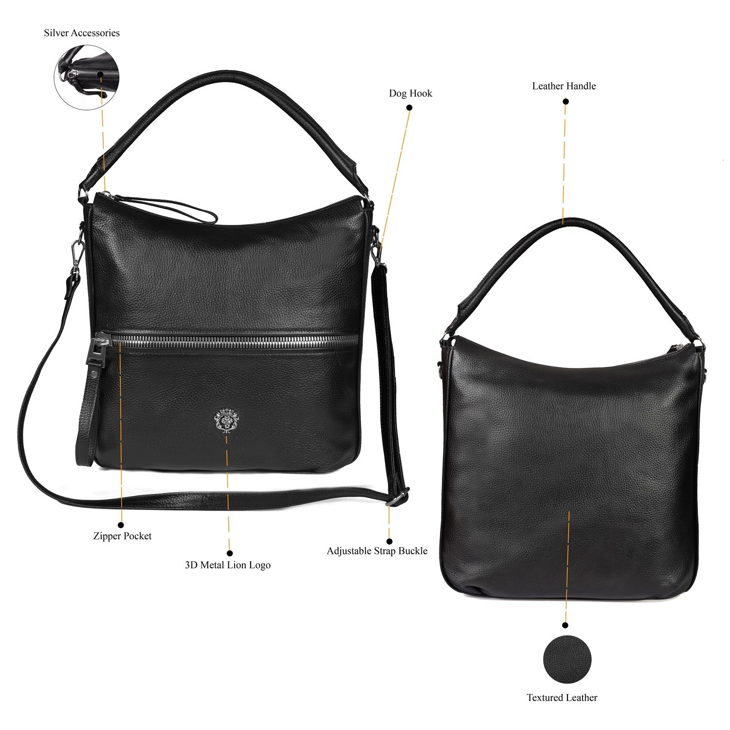 This black leather bag features a slouchy hobo silhouette with a textured leather finish, designed for versatile everyday carry. Key elements include dual top handles, an adjustable shoulder strap, and structured compartments for practicality.Adjustable strap with buckle closure allows customizable drop length for crossbody or shoulder wear. D-ring hooks secure the strap, paired with leather-wrapped handles for comfort.