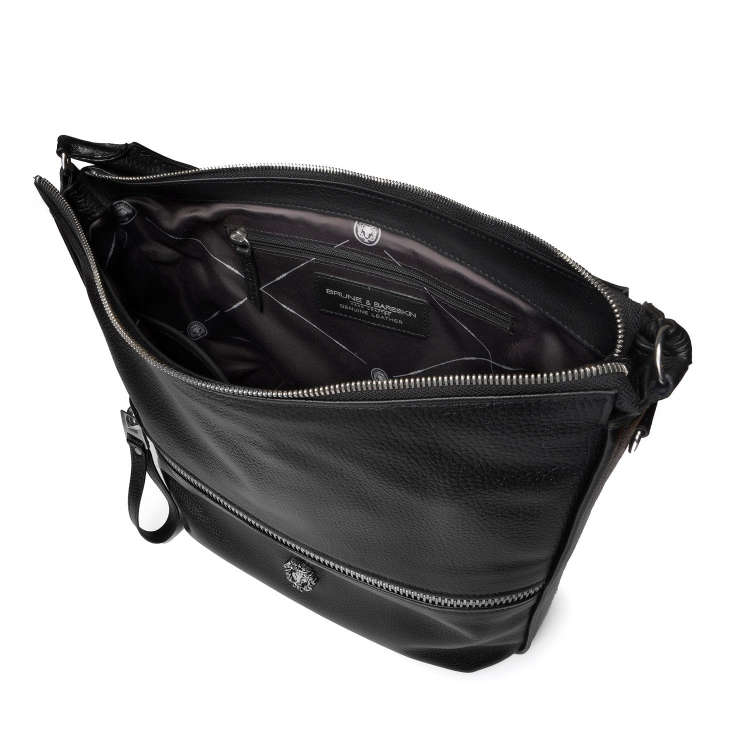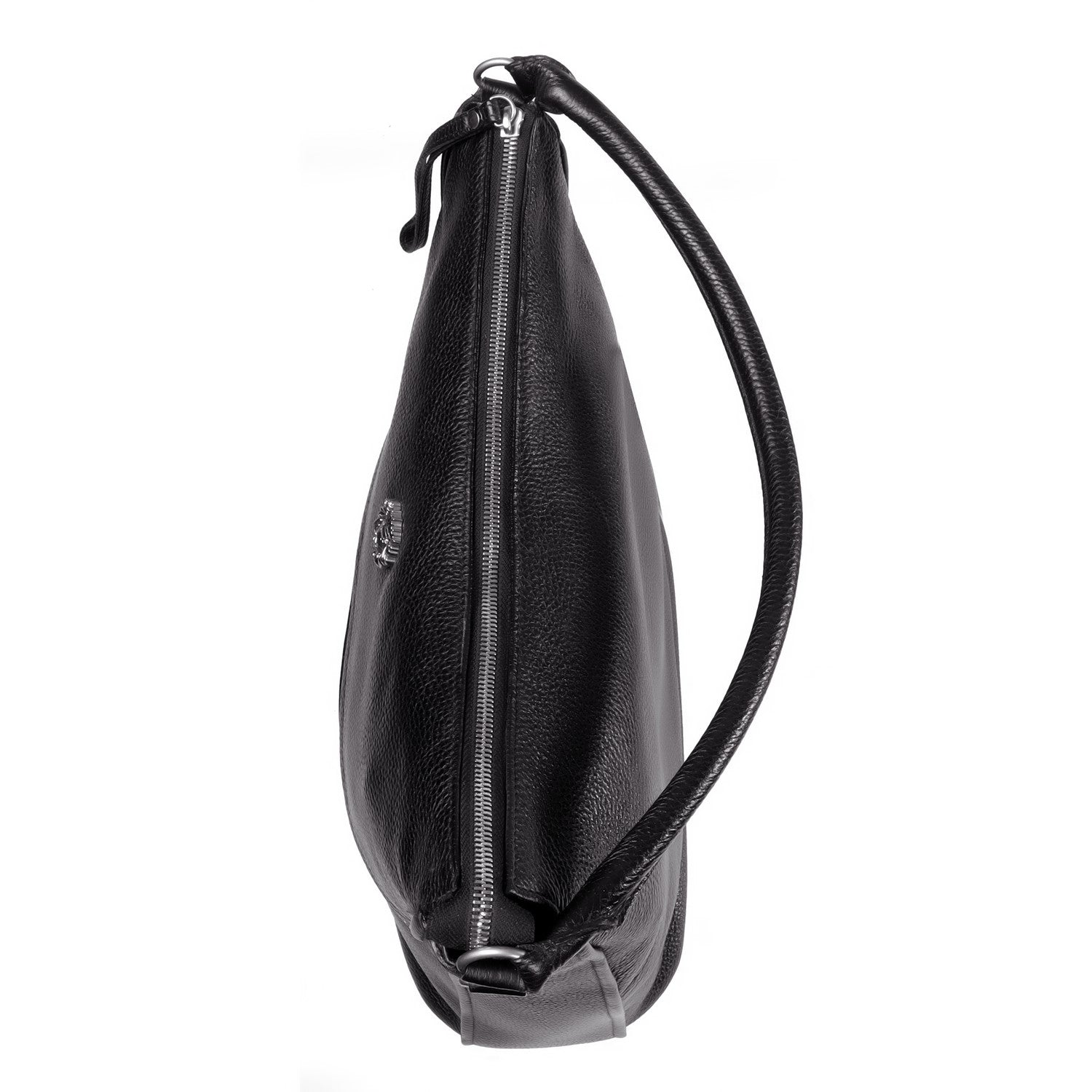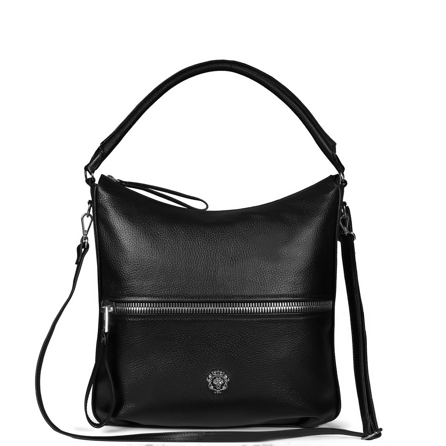 This black leather bag features a slouchy hobo silhouette with a textured leather finish, designed for versatile everyday carry. Key elements include dual top handles, an adjustable shoulder strap, and structured compartments for practicality.Adjustable strap with buckle closure allows customizable drop length for crossbody or shoulder wear. D-ring hooks secure the strap, paired with leather-wrapped handles for comfort.