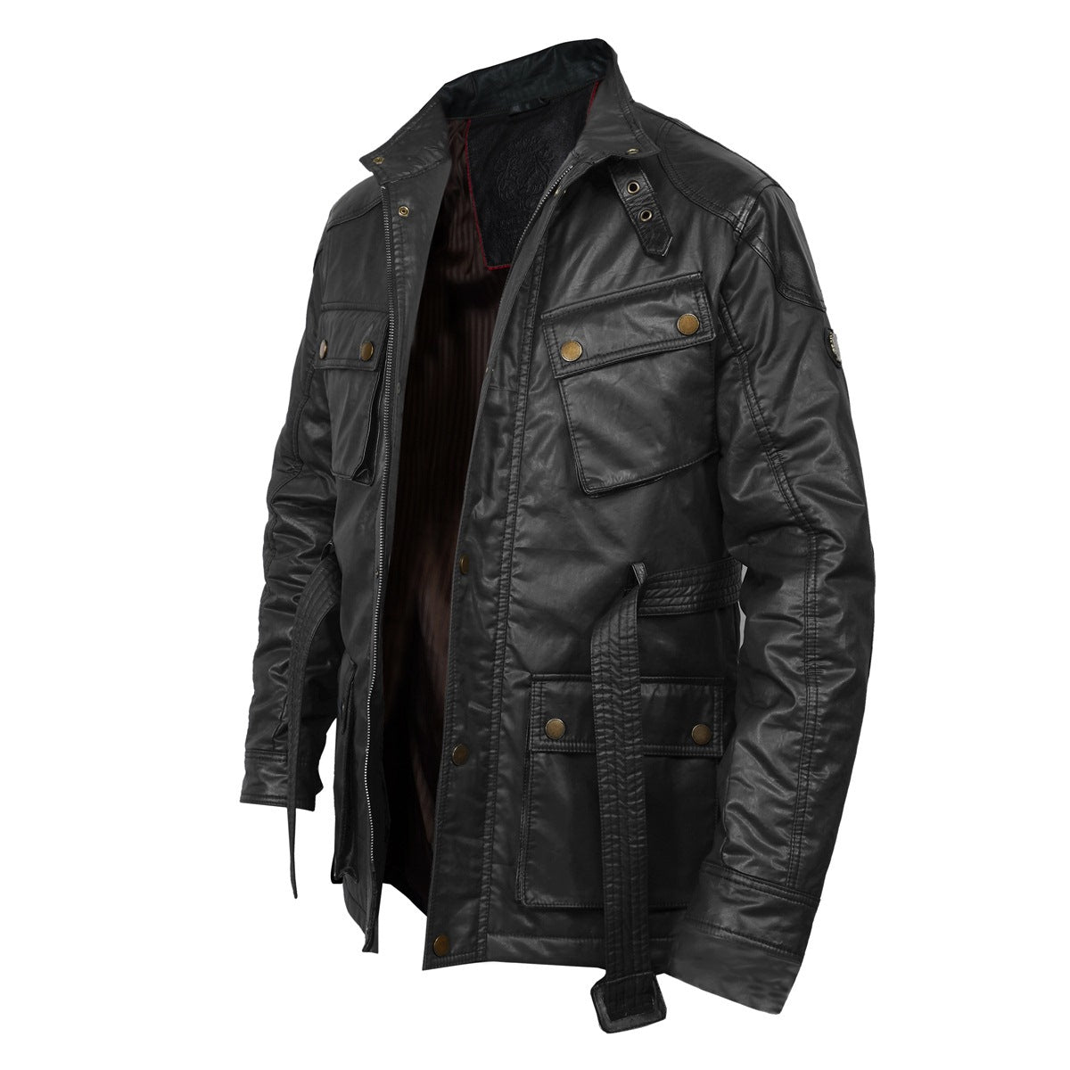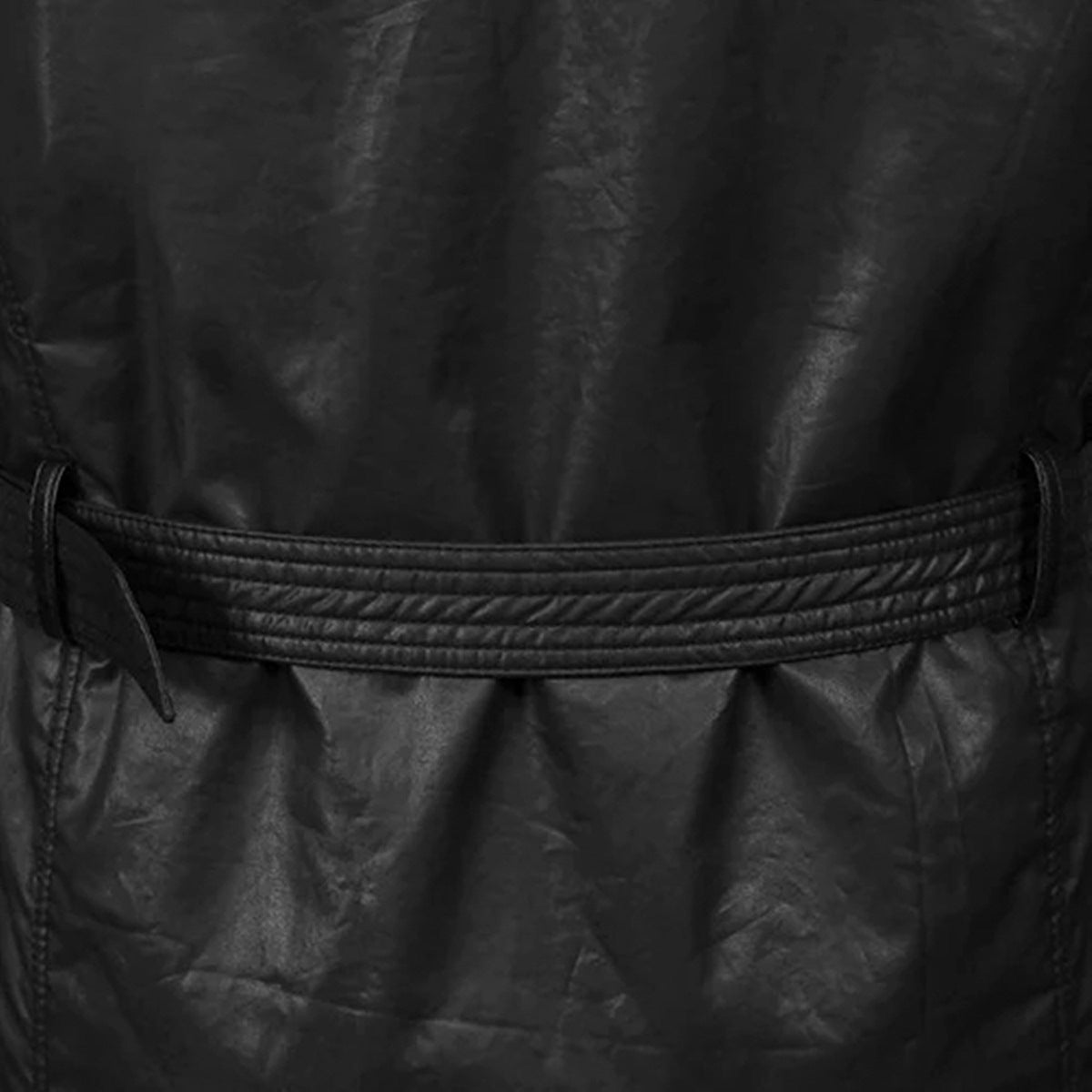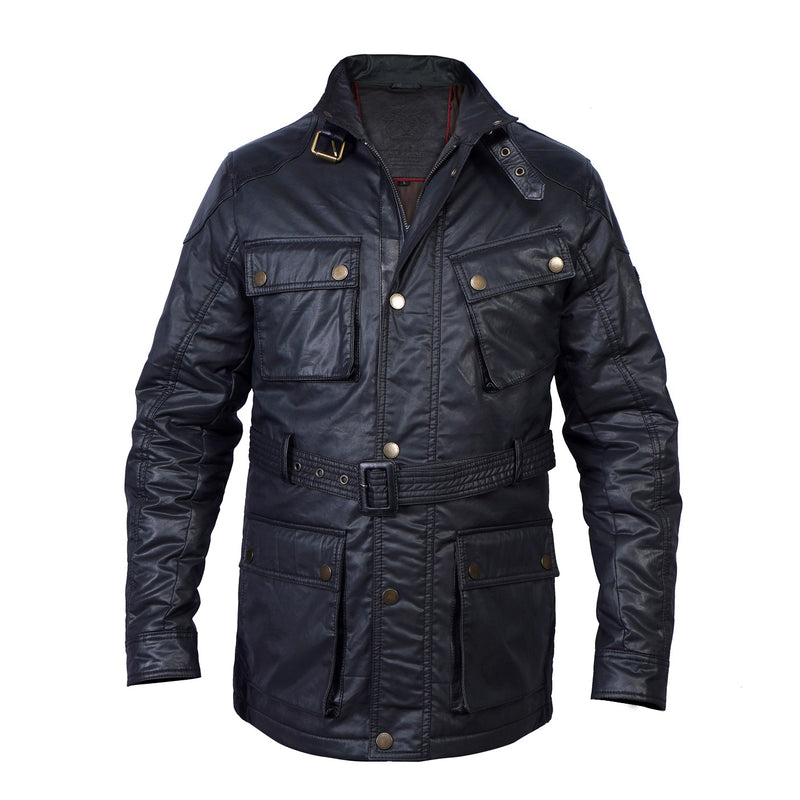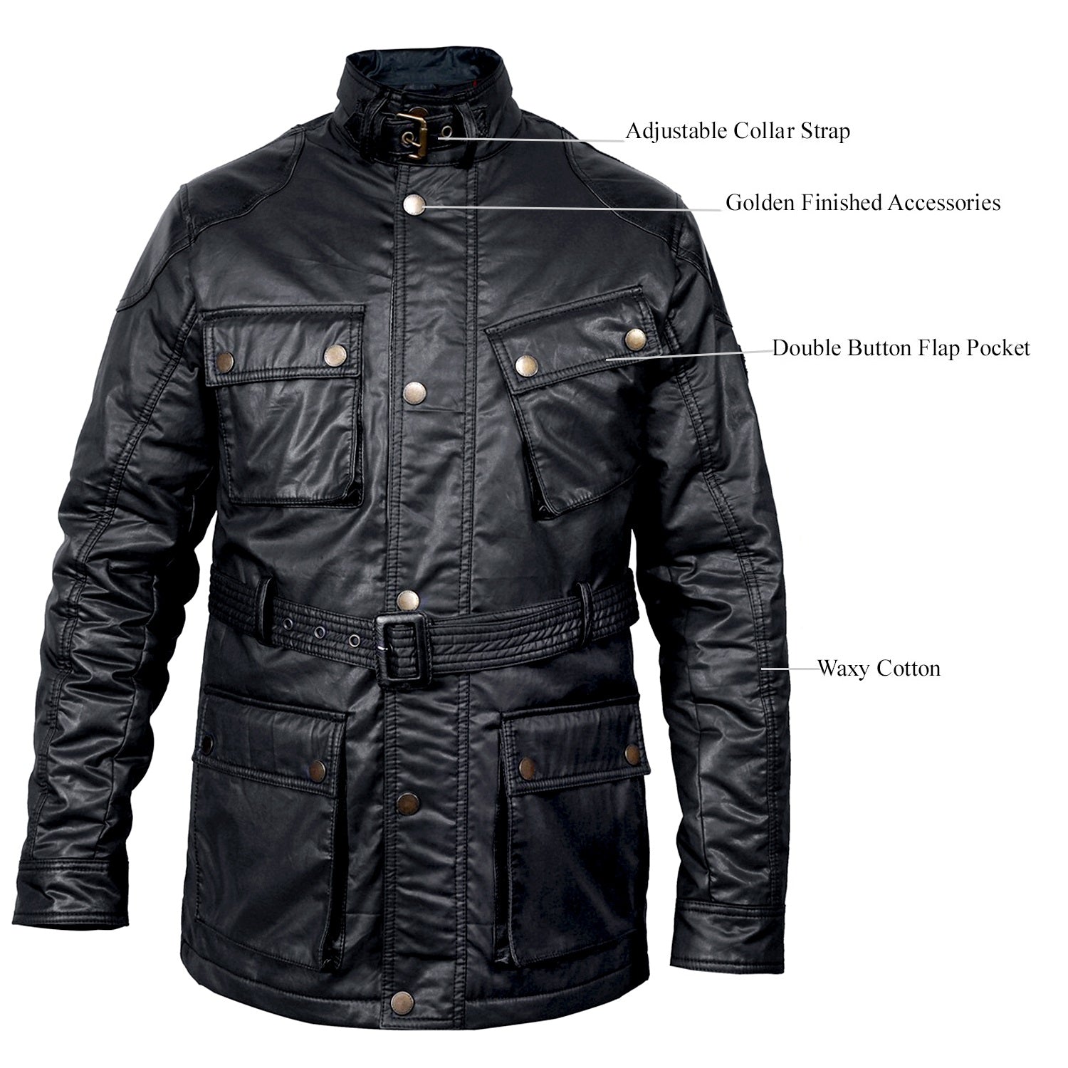 Introducing the Waxy Cotton Coat & safari jacket. Exuding impressive style and functionality, this handcrafted black jacket features a high-closing collar, multiple flap pockets, and an inside concealed zipper for added security. With a dual look of jacket and coat, it offers a belted waist and buckle strap for a customizable fit and plenty of storage options with zippered chest and hand pockets. Stay light in weight without compromising on quality and elevate your look with this black masterpiece.