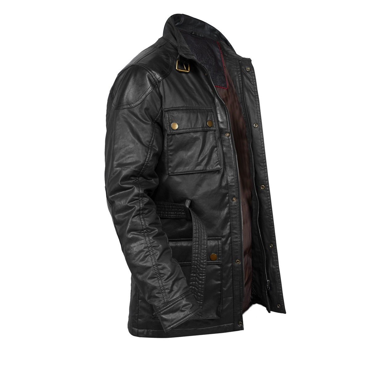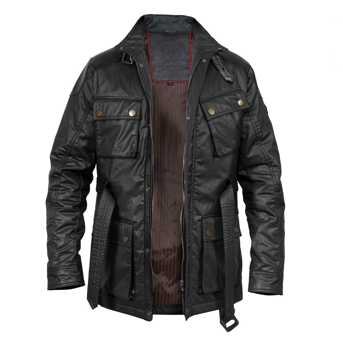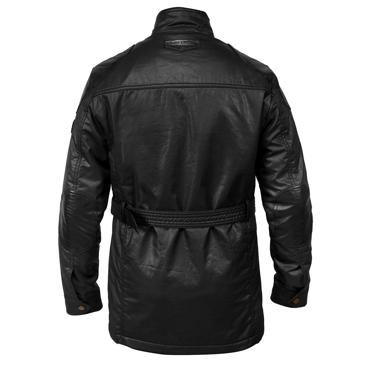 Introducing the Waxy Cotton Coat & safari jacket. Exuding impressive style and functionality, this handcrafted black jacket features a high-closing collar, multiple flap pockets, and an inside concealed zipper for added security. With a dual look of jacket and coat, it offers a belted waist and buckle strap for a customizable fit and plenty of storage options with zippered chest and hand pockets. Stay light in weight without compromising on quality and elevate your look with this black masterpiece.
