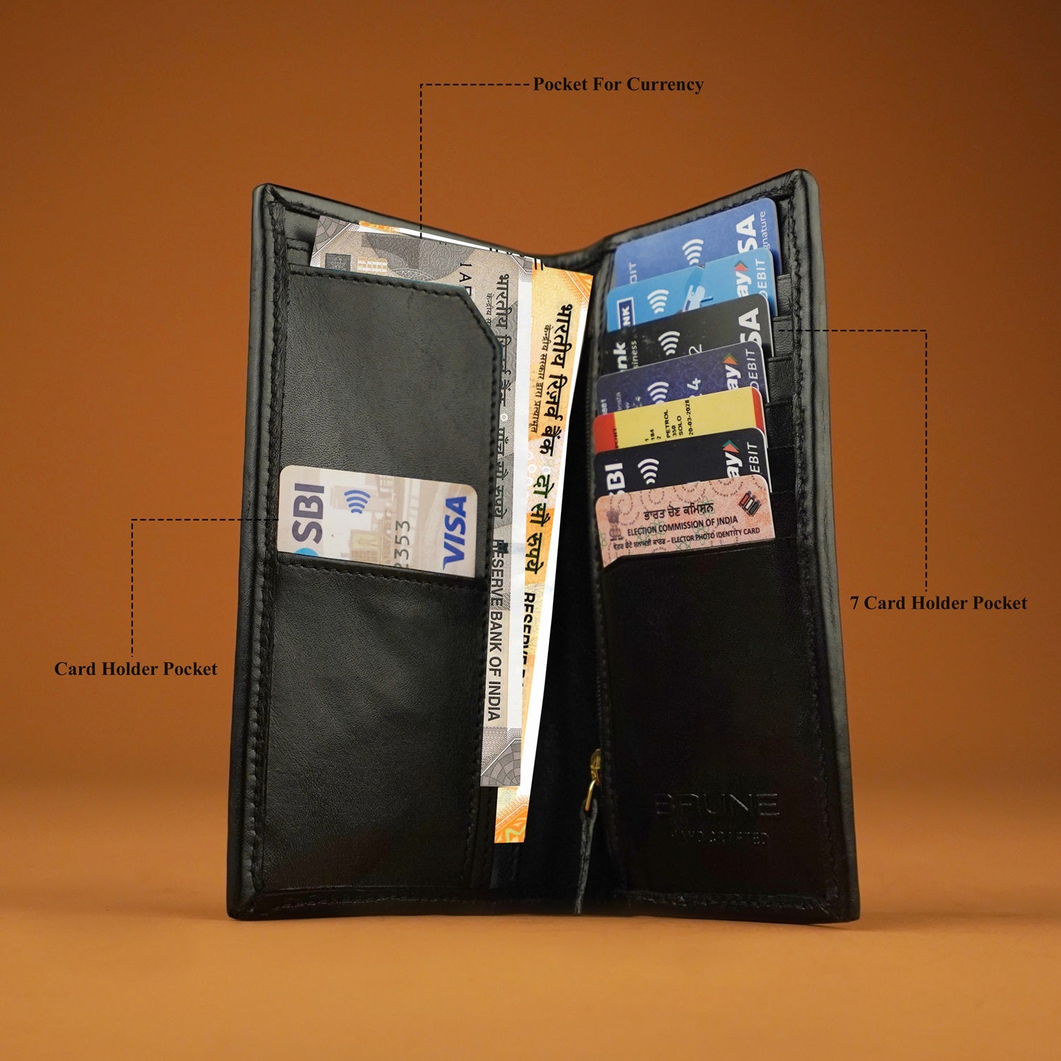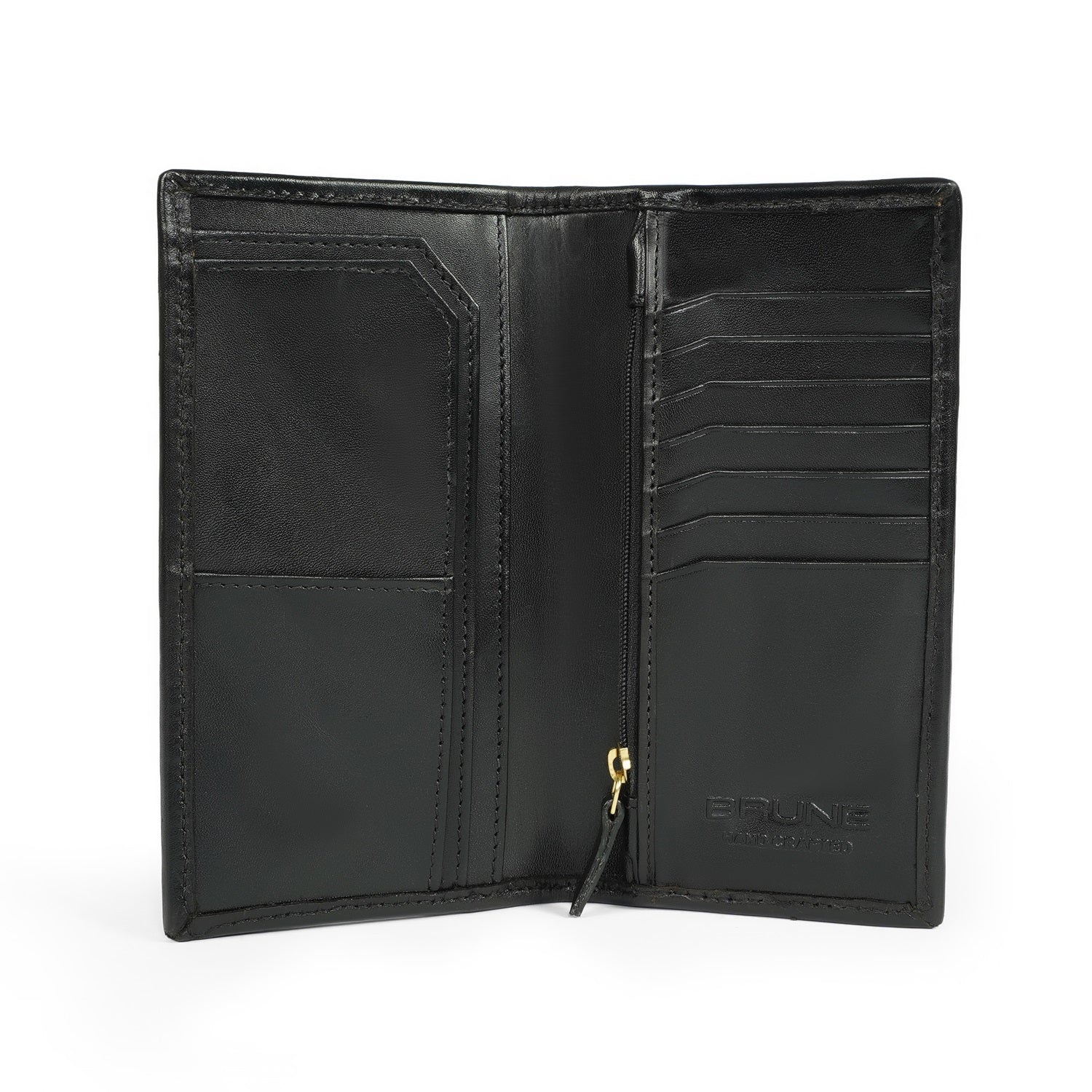 This bi-fold black Plain leather long wallet with concealed zip pocket looks very elegant. The BRUNE & BARESKIN signature metal Lion brand logo on the front enhances the style quotient. Bi-fold opening wallet features two main pockets along with small secure pocket on both sides. It has the total of 7 Card, 2 Long, 3 id card pockets, which makes it a perfect buy for today's generation. It has the smooth magnetic strap to keep it close and secure enough. It provides the style and storage with Patina regime leather shades. You can get it made in your favorite color shade with the name initials embossed.