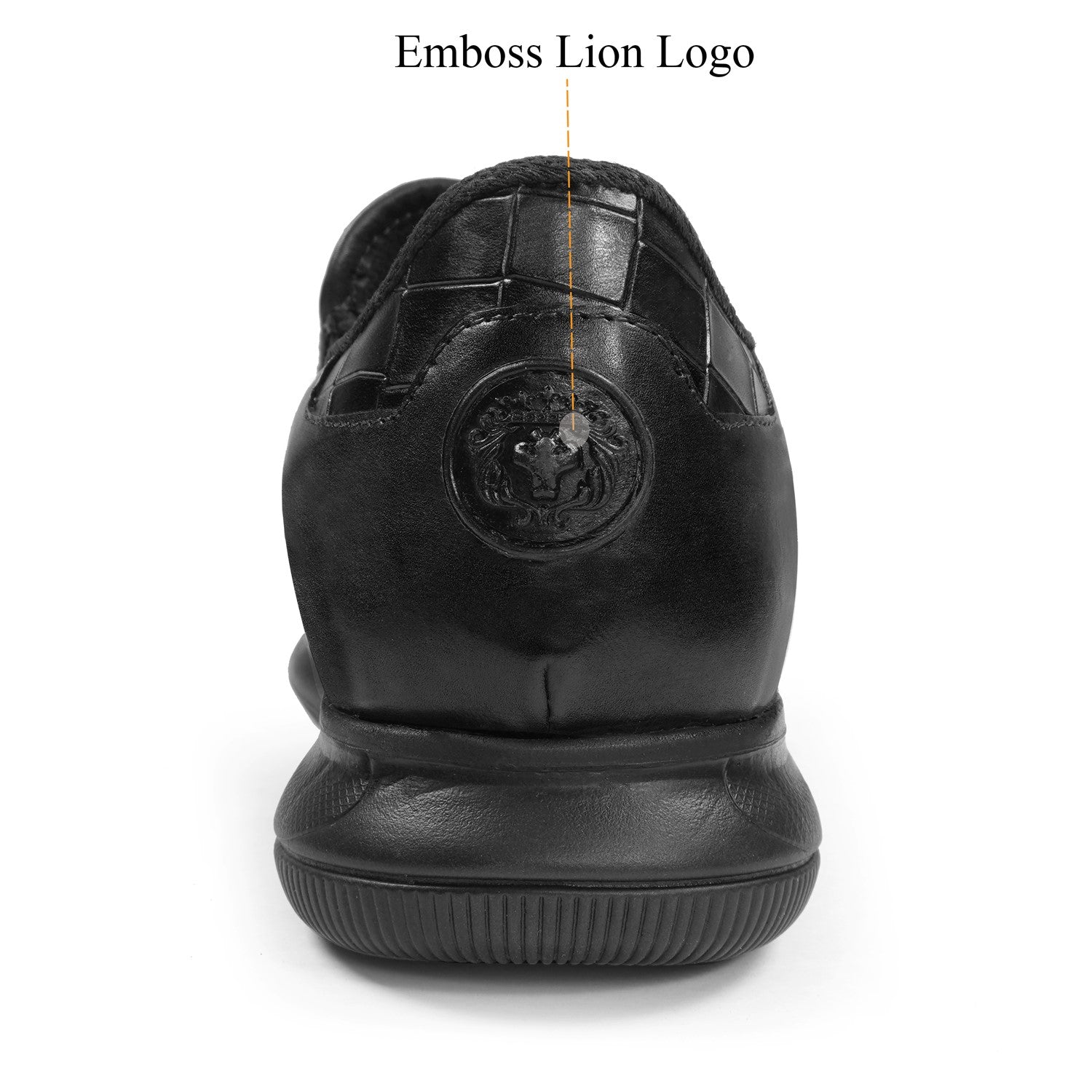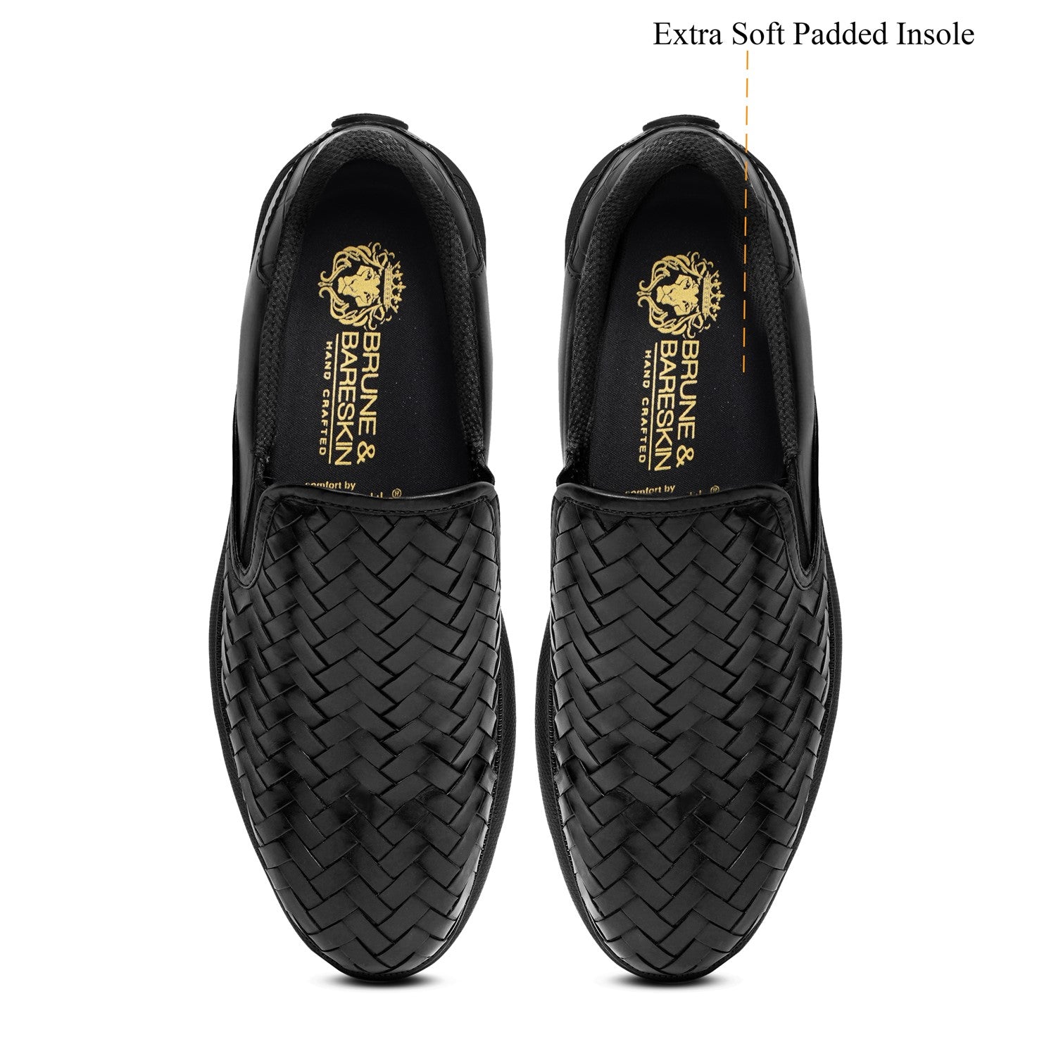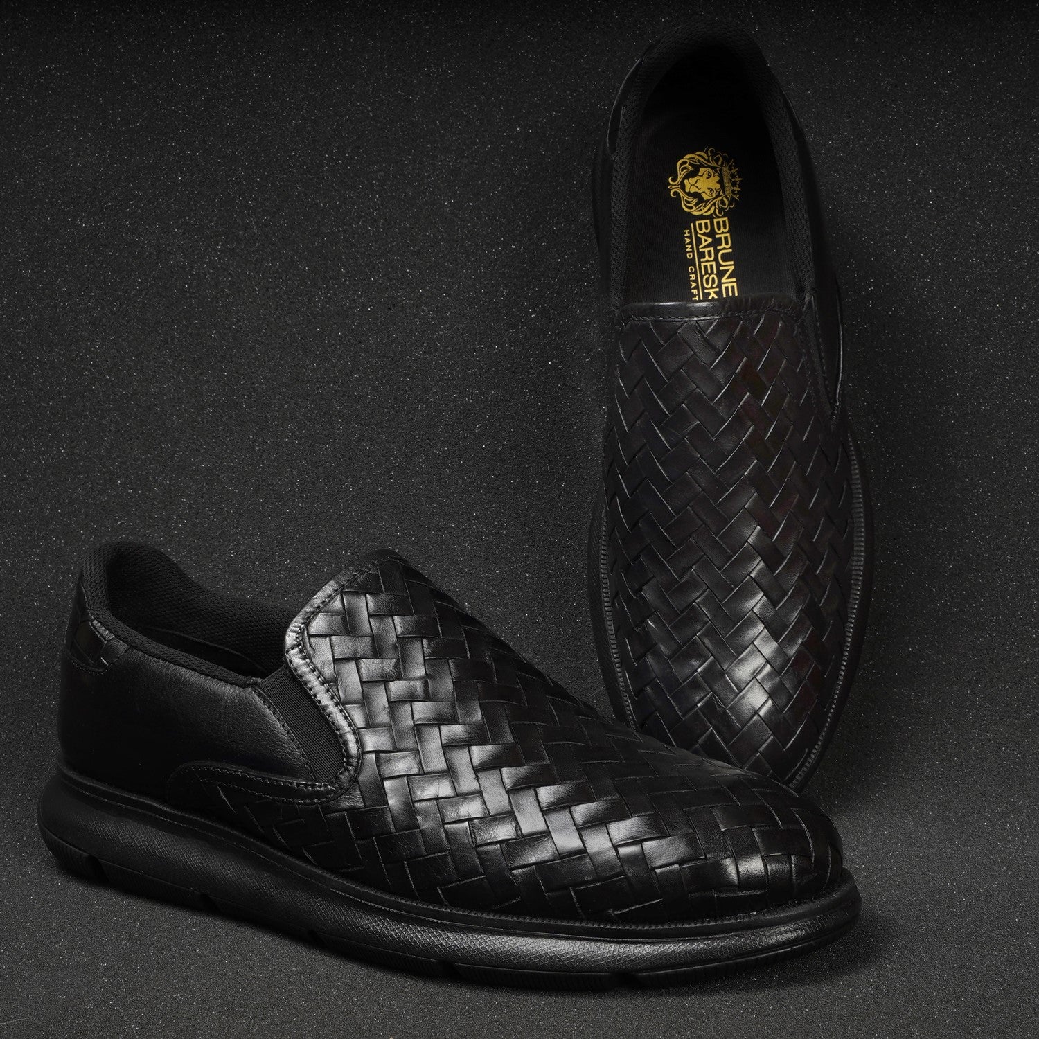 Get ready for ultimate comfort and style with these Brune & Bareskin low top black sneakers. Handmade with premium quality materials, these ultra-lightweight sneakers are not only stylish but also extra comfortable. Featuring a weaved leather vamp and croco textured shoe collar, these sneakers are perfect for any casual outfit. Plus, the subtle embossed lion logo and cushioned foot-bed add a touch of luxury. With an anti-skid patterned rubber sole, these sneakers are perfect for any activity.