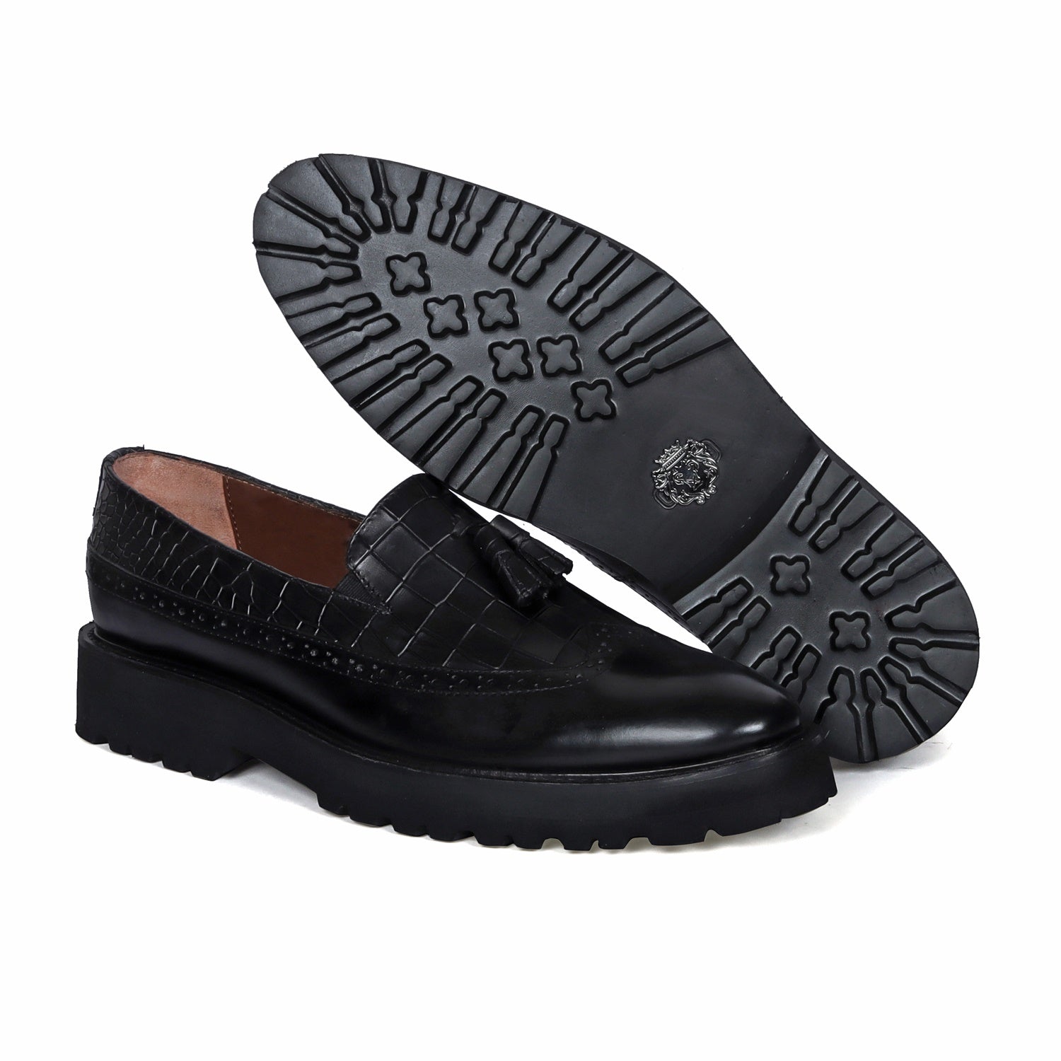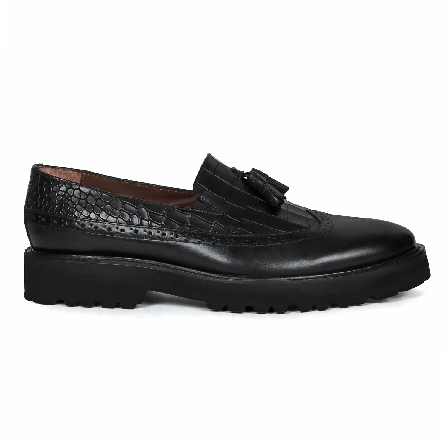 Black Tasseled Wingtip Punching Toe With Light weight Leather Lug Sole Croco Print Shoe By Brune & Bareskin