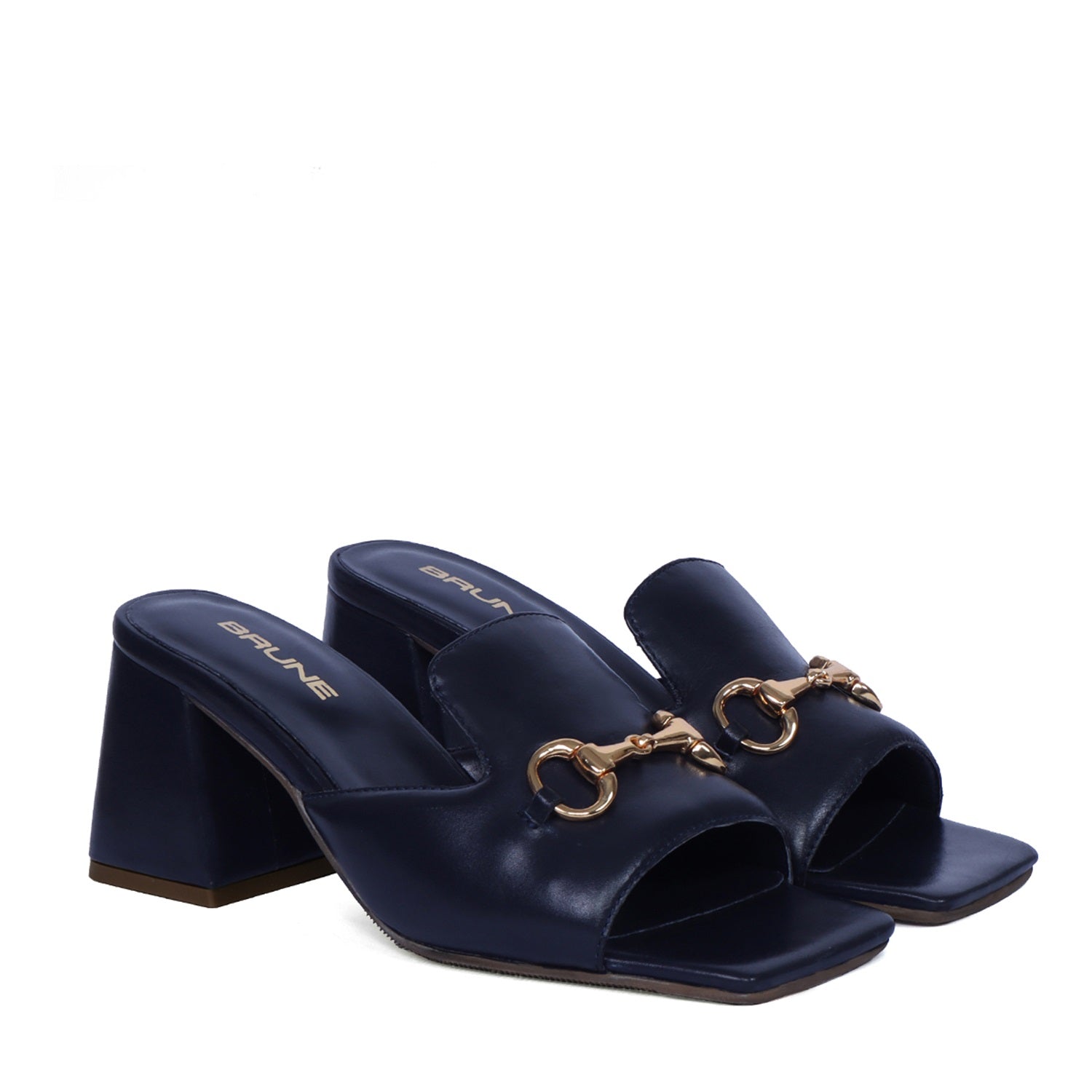 Add a classic twist to your look with this stunningly sophisticated Navy Blue Leather Ladies Sandal from Brune & Bareskin. Its timelessly elegant design features an open toe, long vamp, and golden horse-bit buckled embellishment that perfectly complements the blocked heel. Crafted from premium leather, this slider sandal offers premium comfort with its rubber sole. Refresh your wardrobe with this timelessly fashionable shoe.