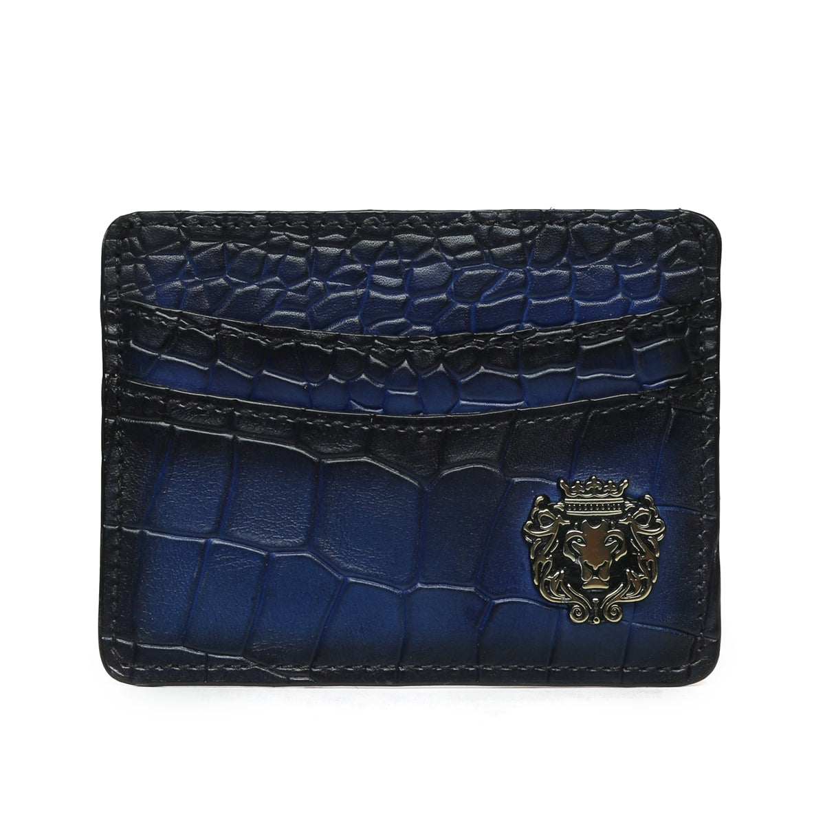 Blue Croco Deep Cut Leather With Golden Lion Logo Card Holder By Brune