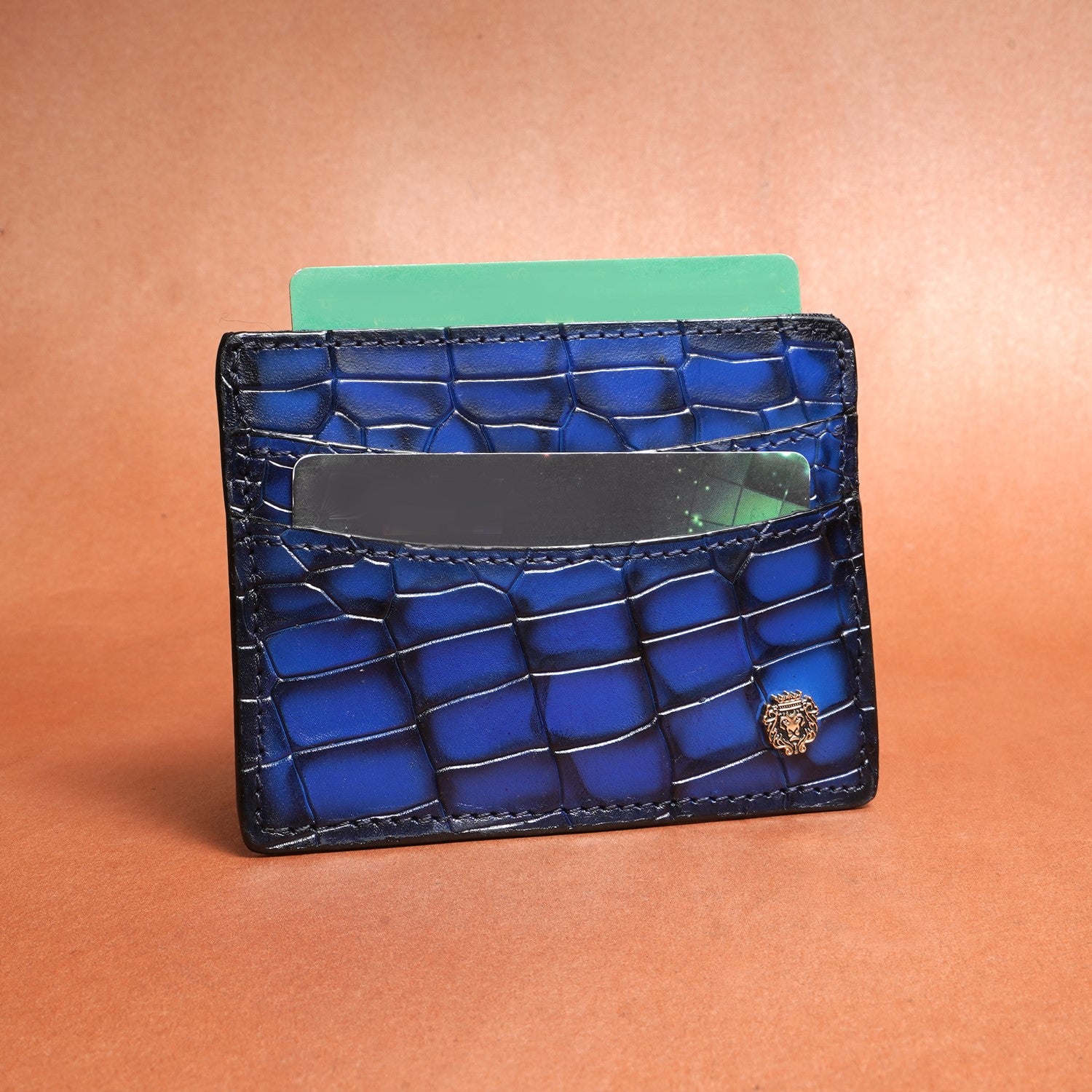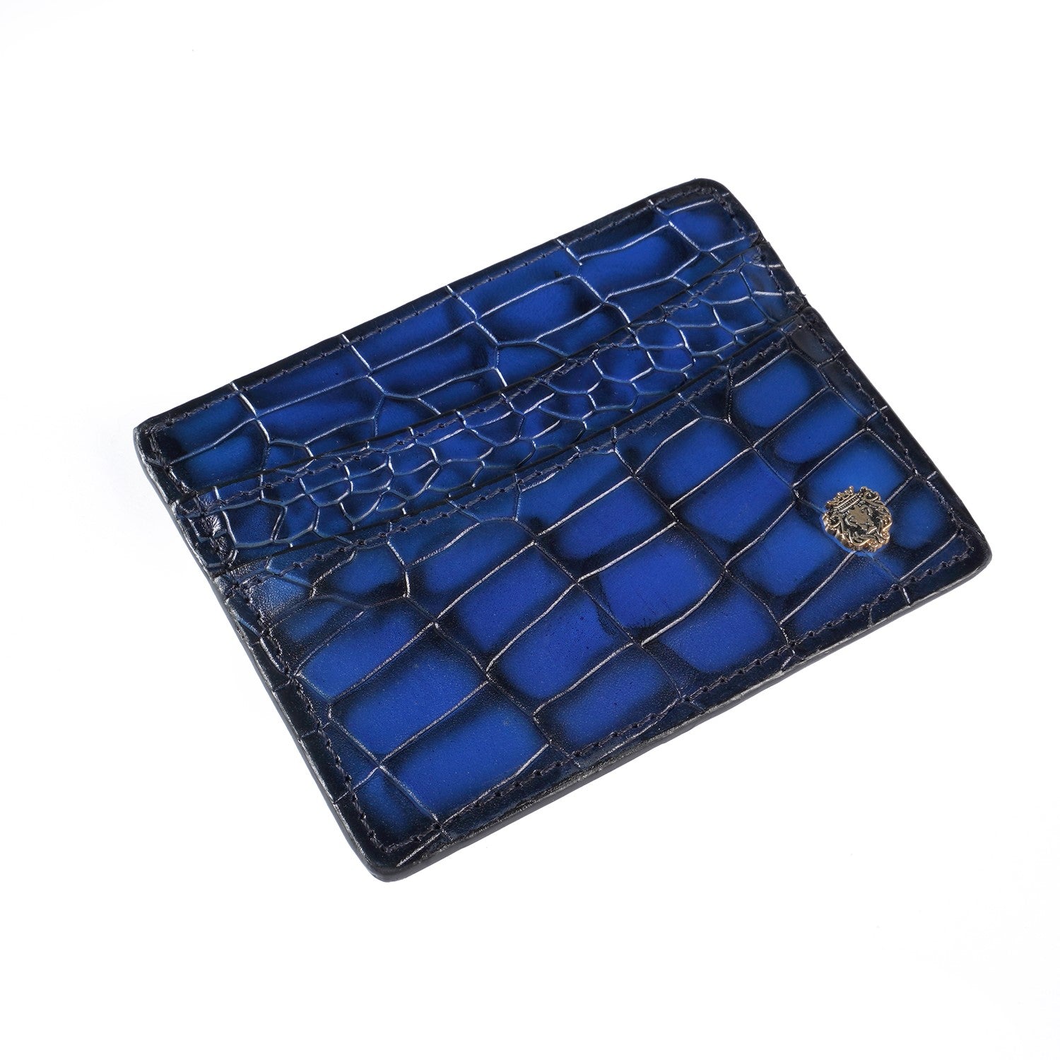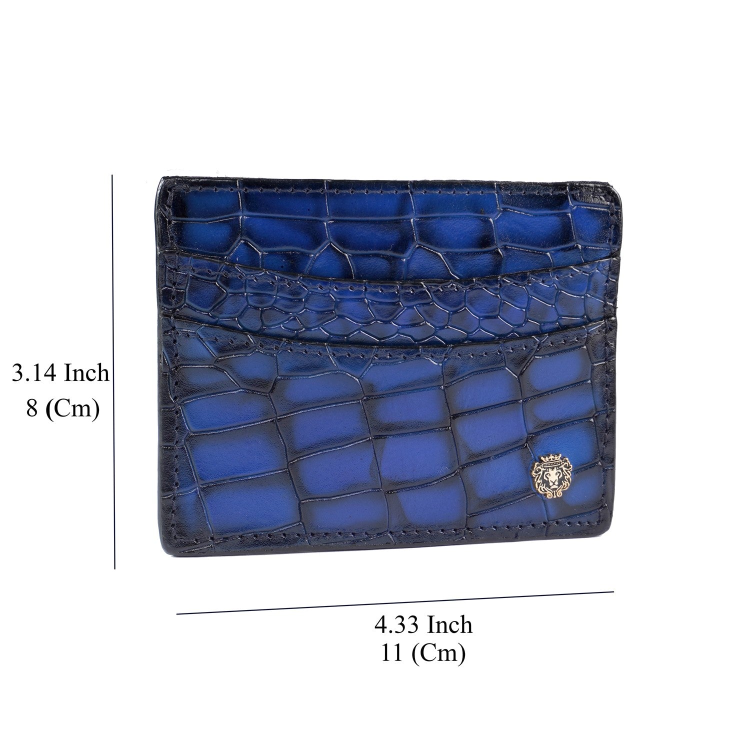 Blue Croco Deep Cut Leather With Small Golden Lion Logo Card Holder