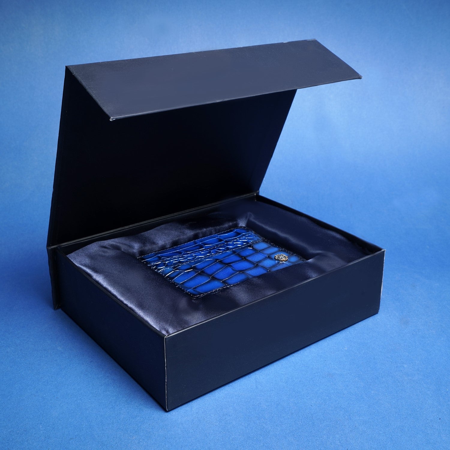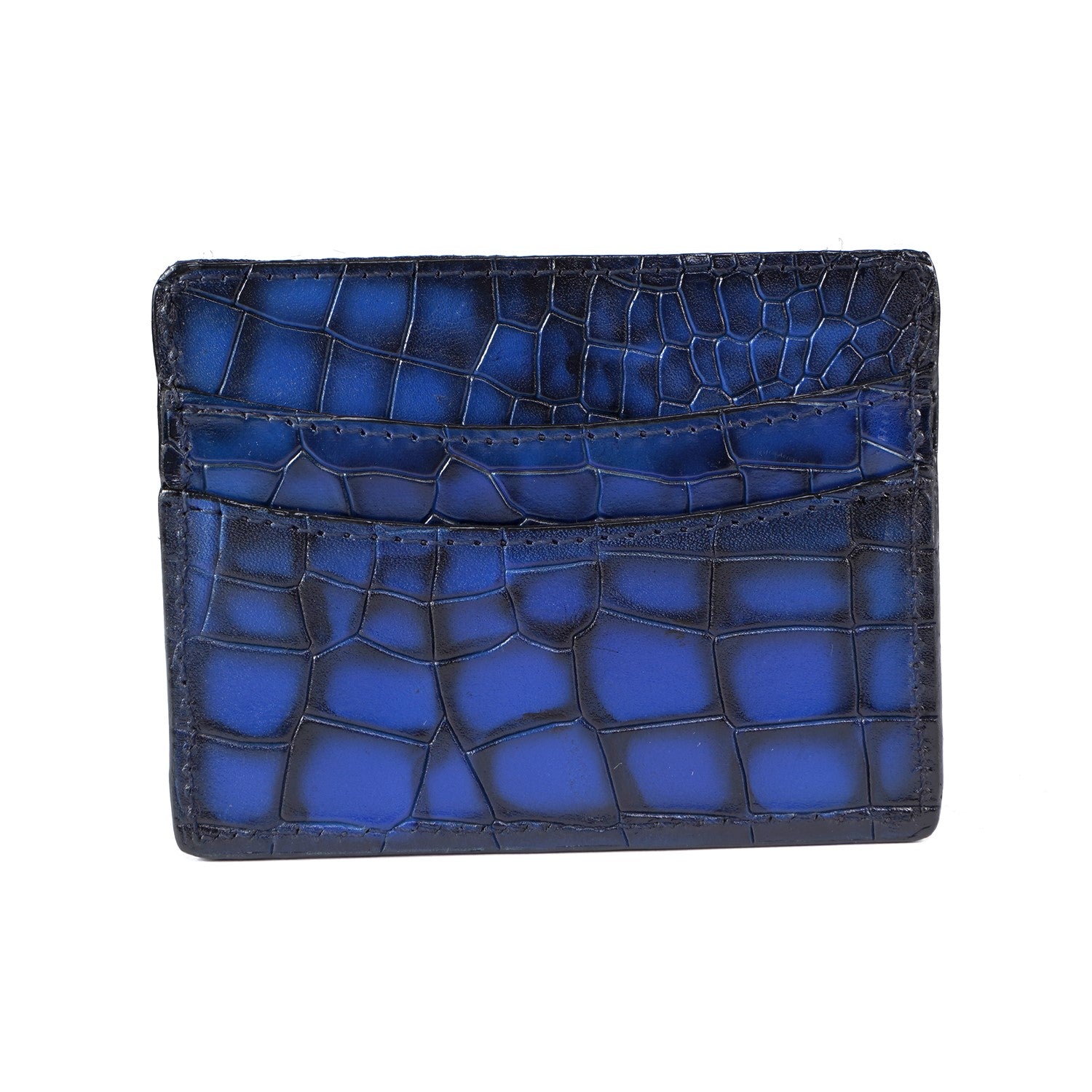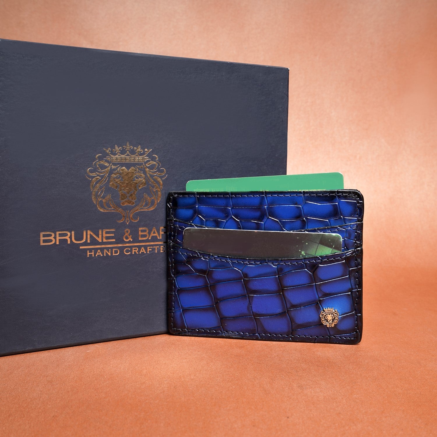 Blue Croco Deep Cut Leather With Small Golden Lion Logo Card Holder