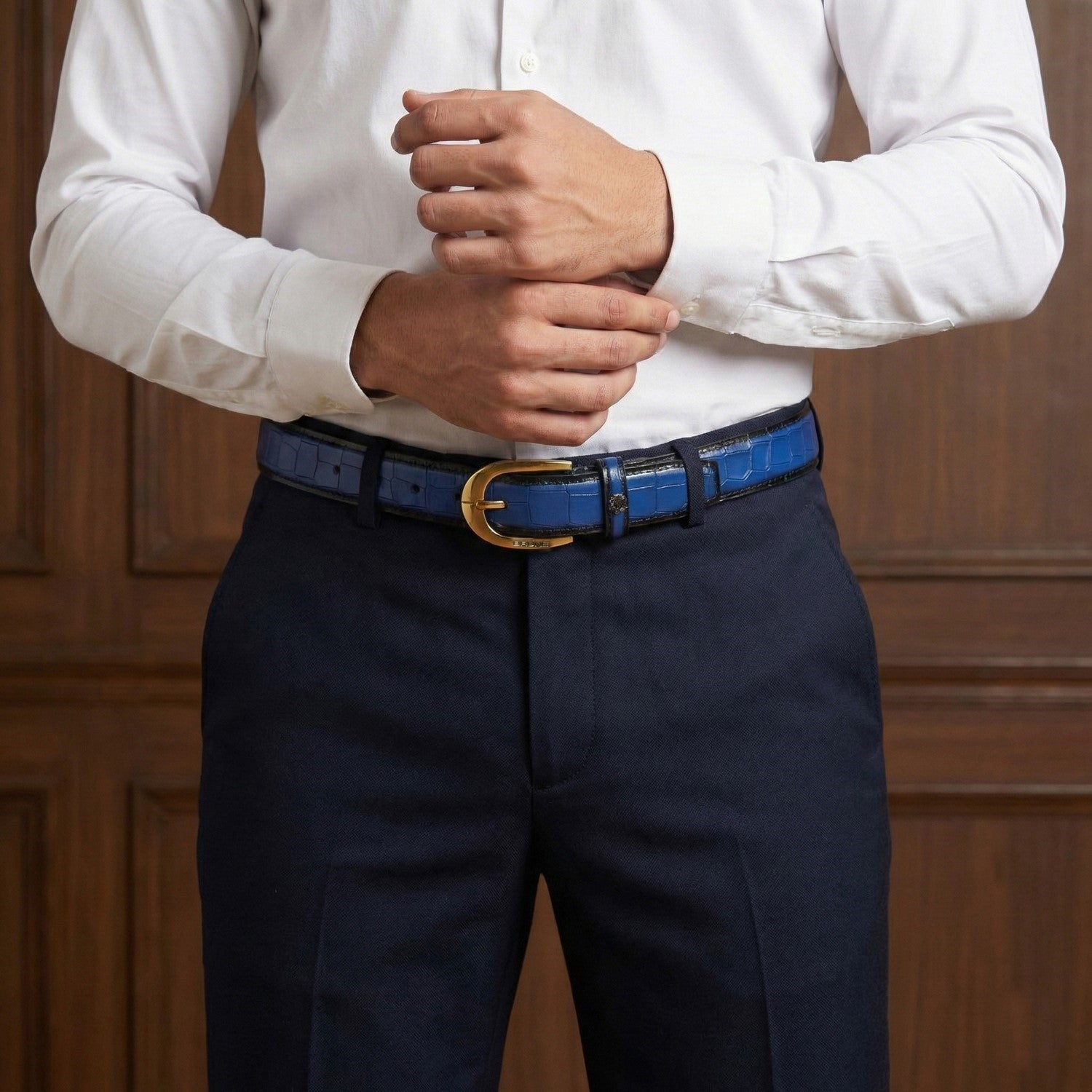 Blue Croco Embossed Men's Belt with Golden Oval Shape Buckle