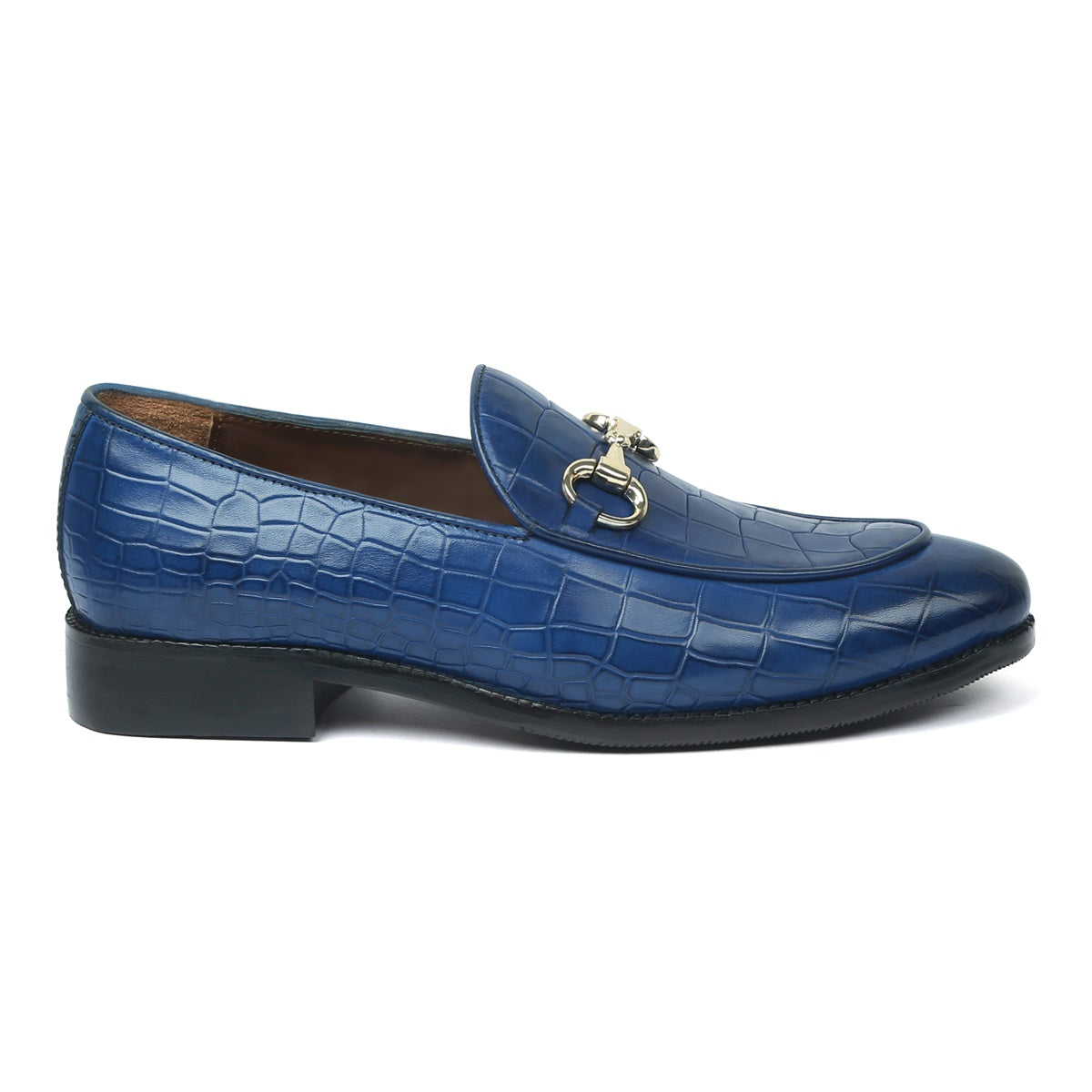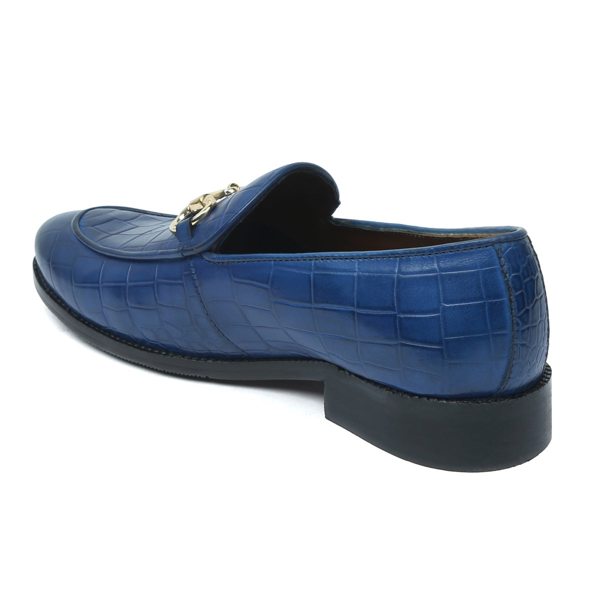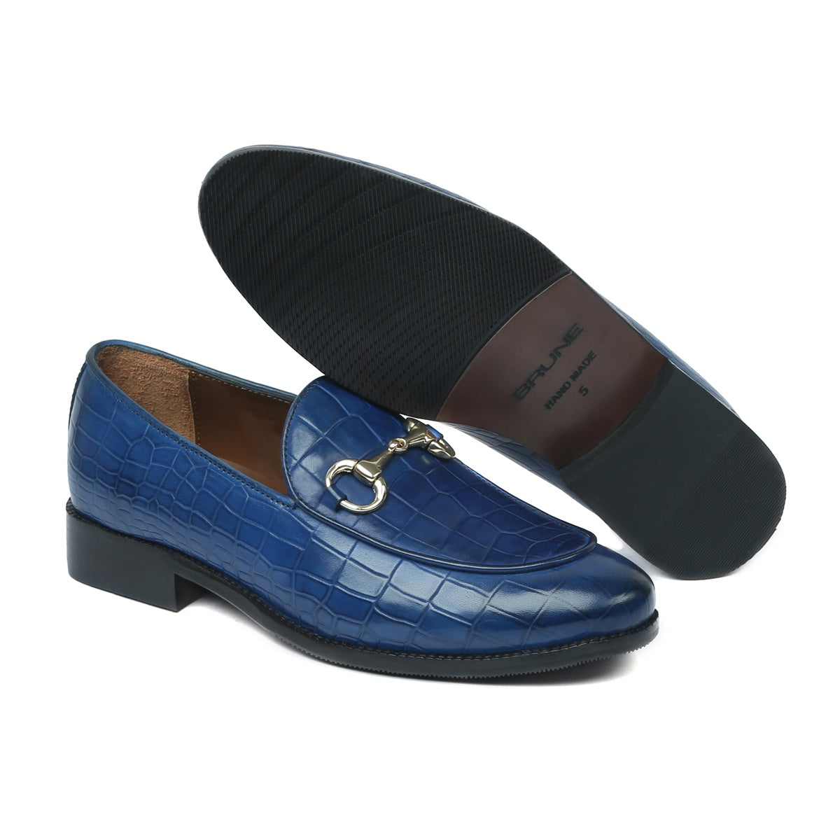 Make your everyday special with these classy men's loafers. It is the best shoe category for any men's closet. Loafers remain favorite style of shoes, as they are convenient to use and spell minimum fuss. Blue Deep Cut Croco Leather shoe looks lavishing with metal horse bit on it. And when they are made of exemplary fitting and finish as that of the Brand Brune & Bareskin, you can be sure that the shoes are nothing short of excellence. These blue leather shoes, with perfectly round apron toe design have a very rich appearance. This is a must have pair in your footwear collection.