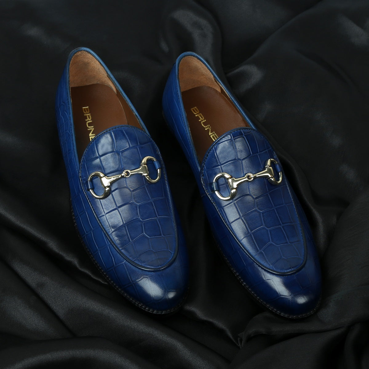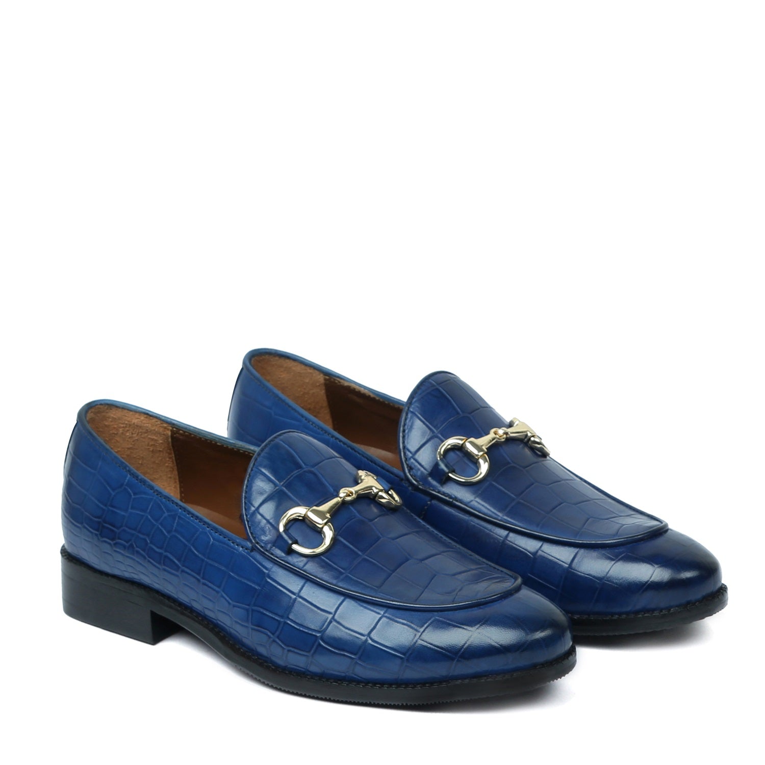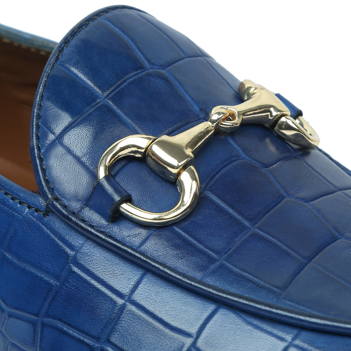 Make your everyday special with these classy men's loafers. It is the best shoe category for any men's closet. Loafers remain favorite style of shoes, as they are convenient to use and spell minimum fuss. Blue Deep Cut Croco Leather shoe looks lavishing with metal horse bit on it. And when they are made of exemplary fitting and finish as that of the Brand Brune & Bareskin, you can be sure that the shoes are nothing short of excellence. These blue leather shoes, with perfectly round apron toe design have a very rich appearance. This is a must have pair in your footwear collection.
