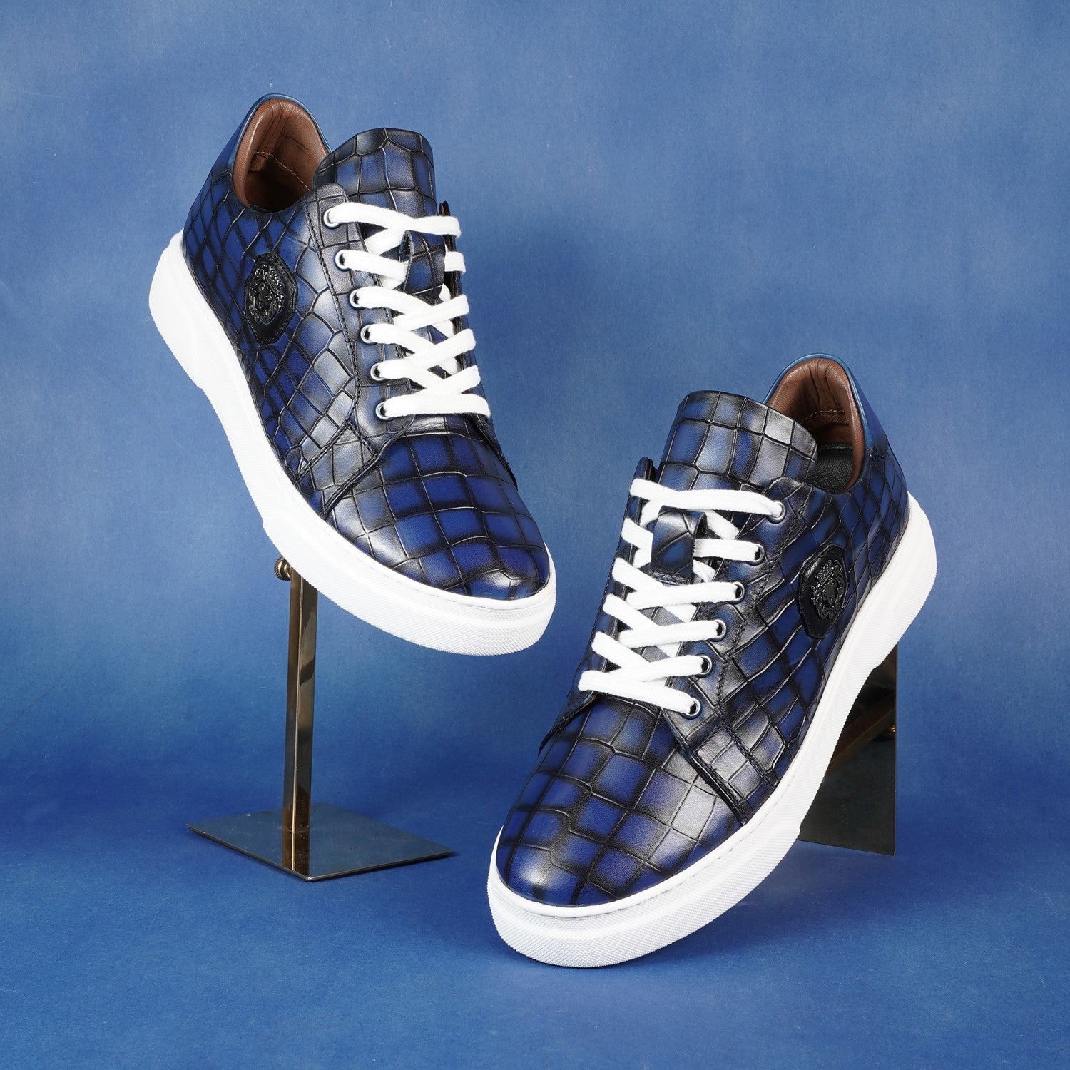 Blue and White are some of the most elegant color combinations and if, it is in Deep Cut Croco full grain leather then nothing like it. This Blue hand-colored smokey patina finish leather sneakers are made to provide you comfort and style. It is entirely handcrafted from precisely selected highest quality materials. The artistic smokey finish is achieved by our artisans with hand painting using the patina regime. The lace-up design provides a snug fit and extra padding on the collar provides day-long comfort. The color can also be customized further with your matching apparel.