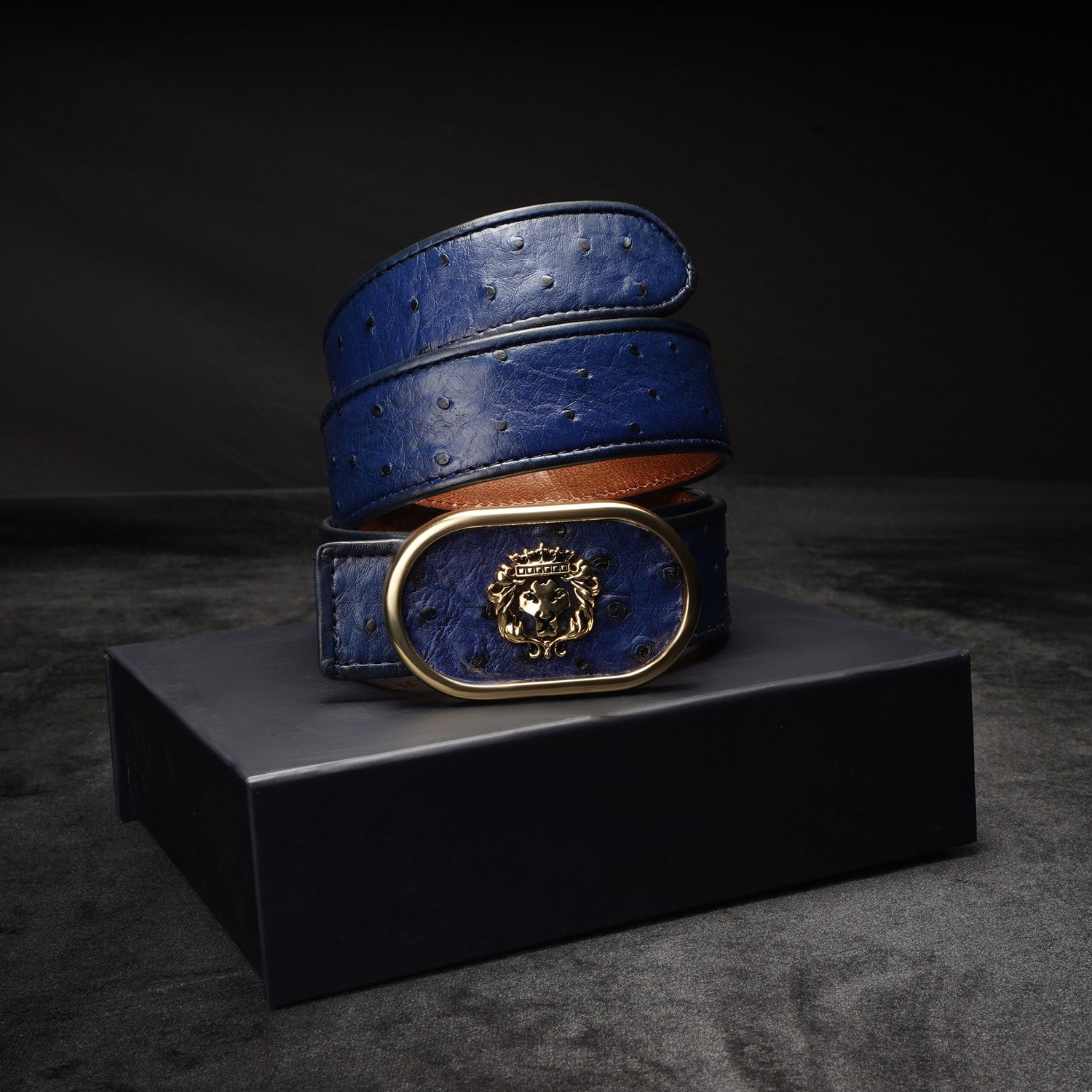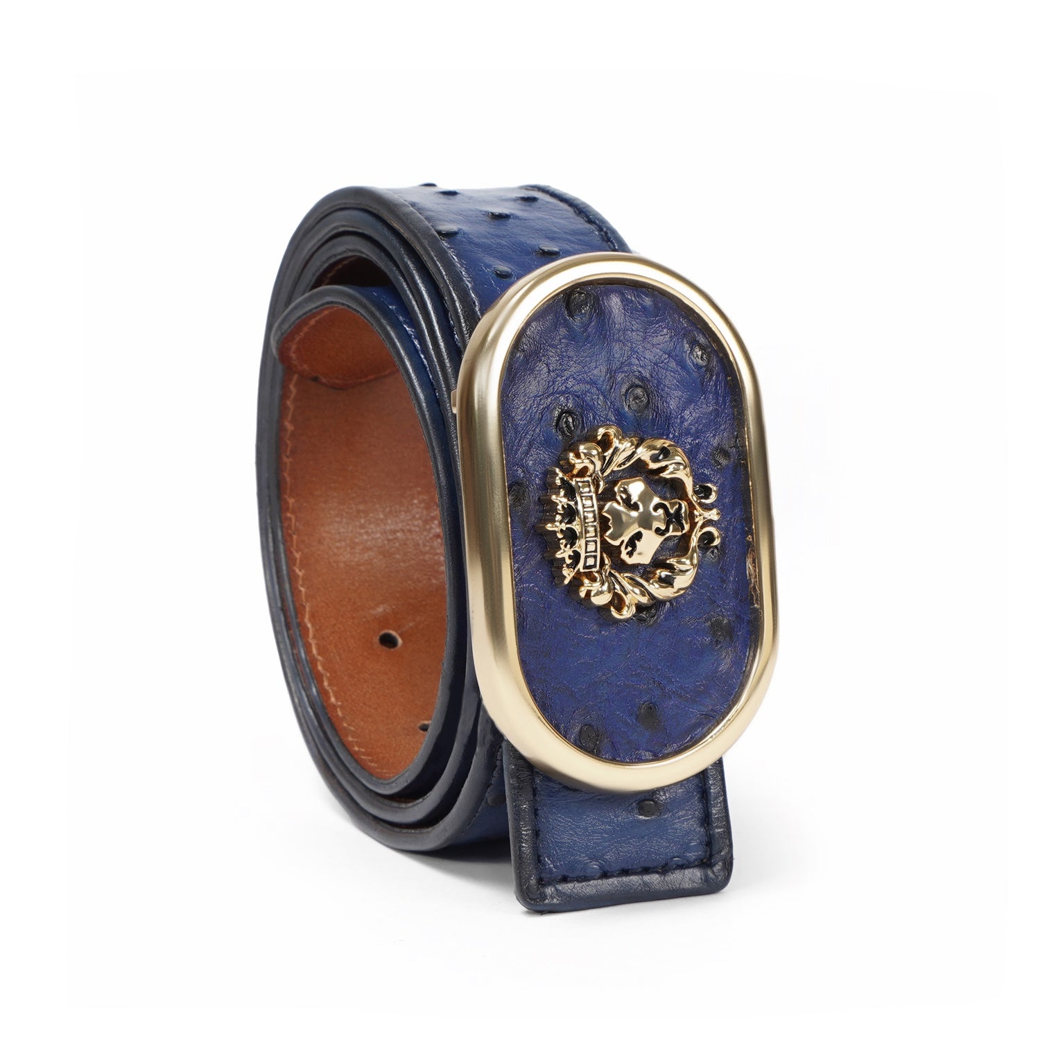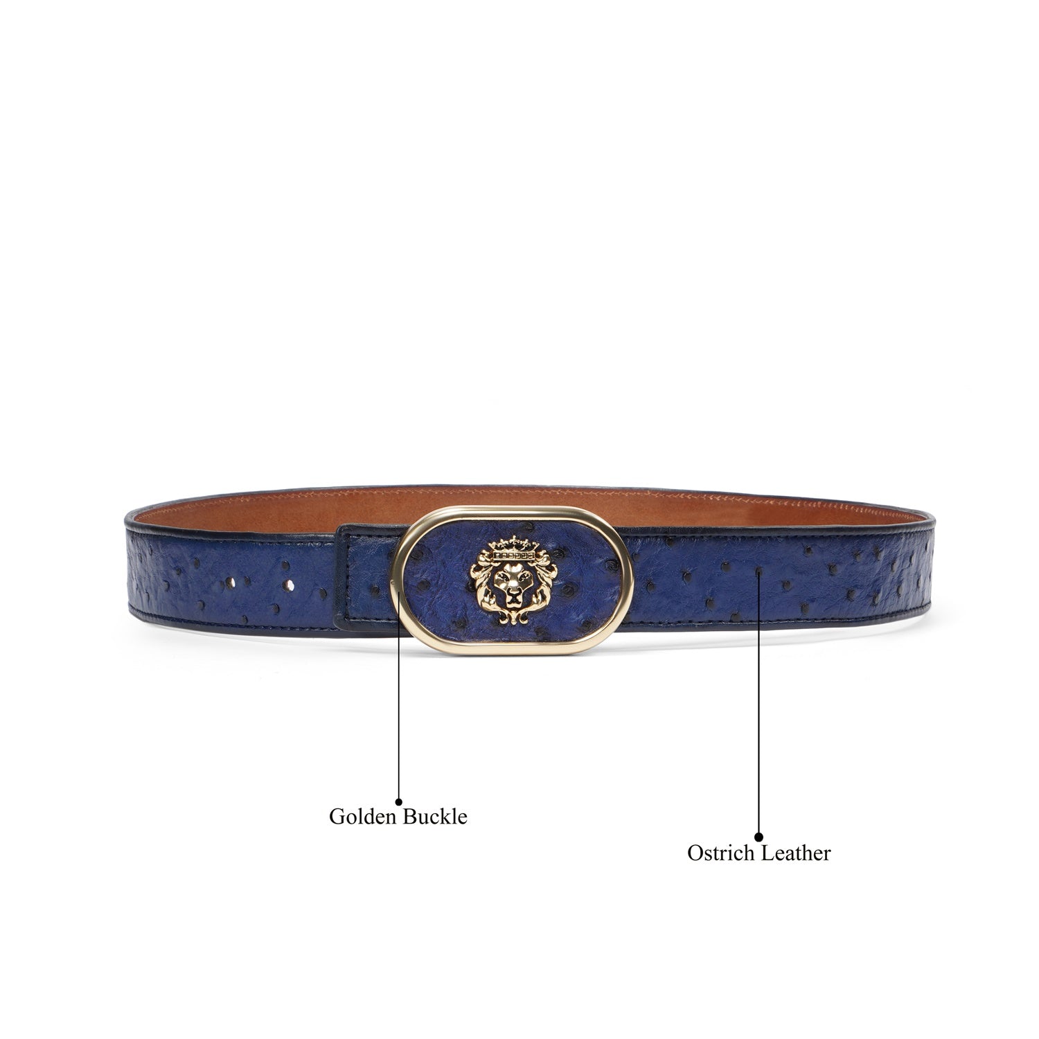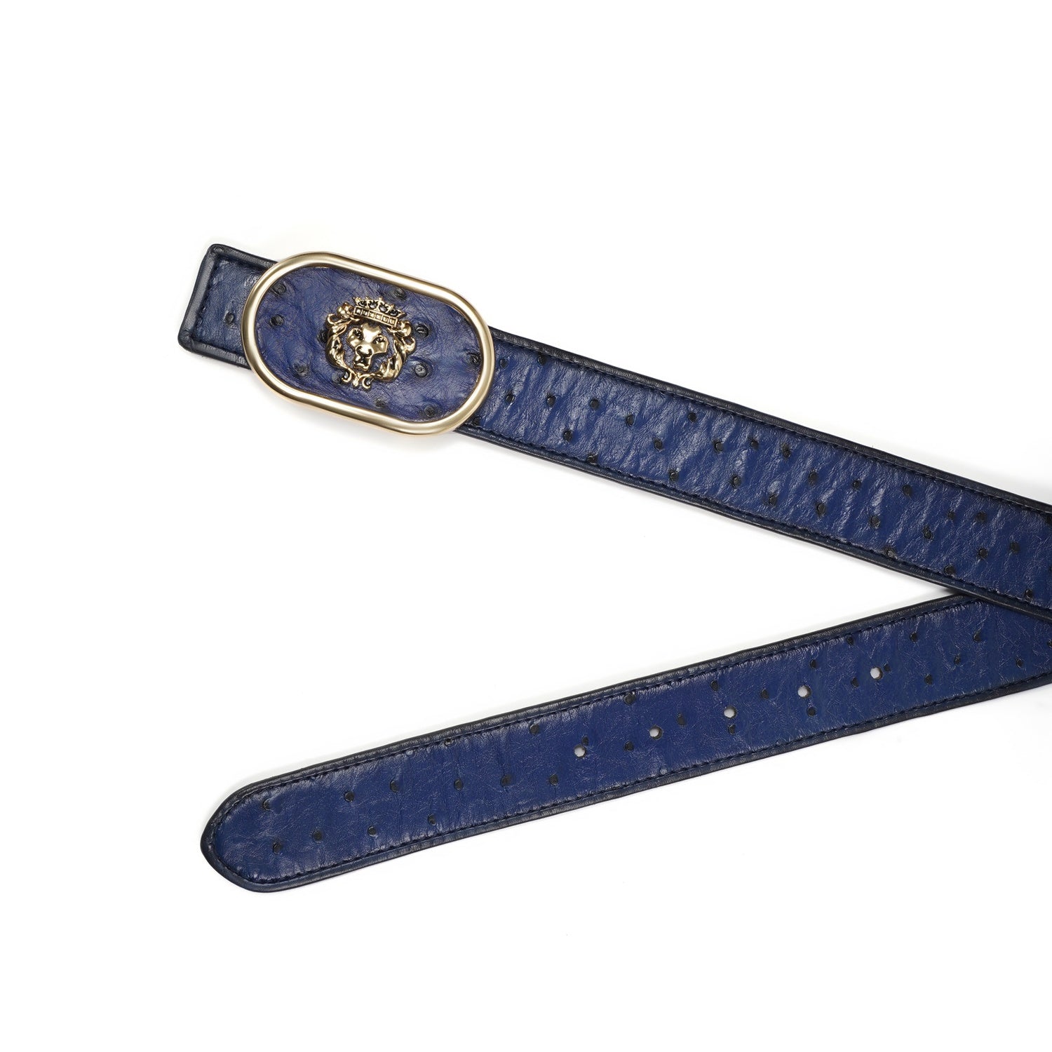 Blue Exotic Ostrich Leather Belt with Golden Lion Buckle