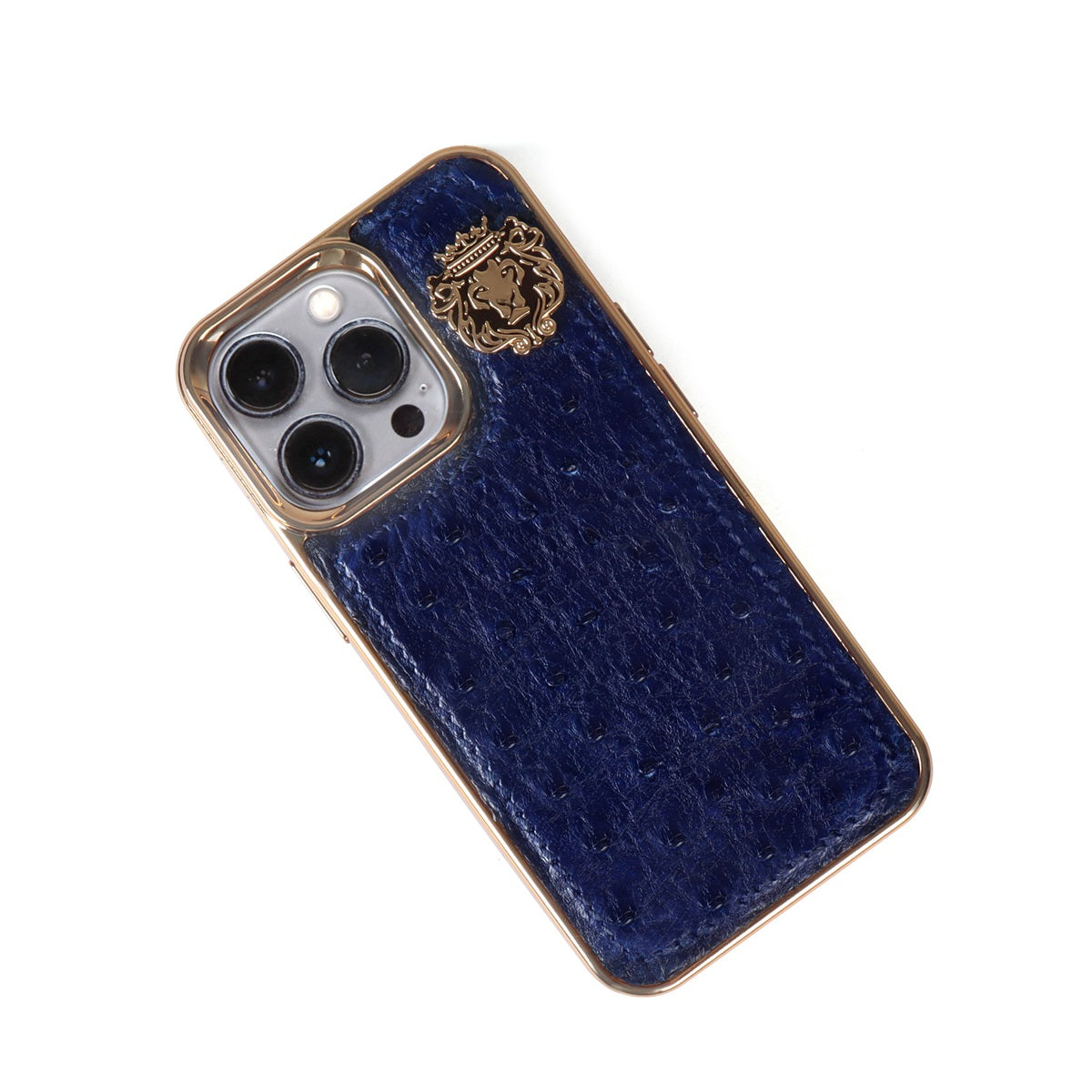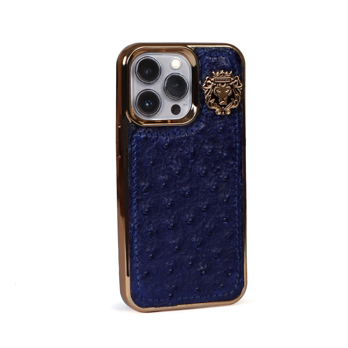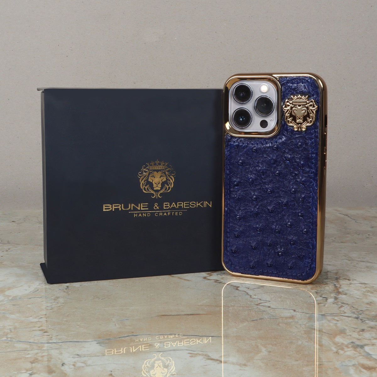 The latest Blue Real Ostrich leather Golden Rim Concept iPhone case is unique. This Time Brune & Bareskin has come up with more ease to your accessory, it's an elegant mobile cover in Ostrich leather. This special Ostrich leather mobile cover specially made for Apple iPhone 13 Series gives you a complete elegant look. You would love to carry your phone in this cover. The quality of ostrich leather cover ranks high on durability and style factors. Golden Rim Cover provides great protection to your phone and make your phone stand out in the crowd by enhancing its looks. This Mobile Cover will protect your Phone from Dust, Scratches and stains. It will give your phone an outstanding look. The Golden metal lion logo leaves a remarkable mark of style. The hand stitched around the border provides more rigidity elite look to it. 100% authentic ostrich leather mobile cover you would love to have. The high veg tanned genuine leather will surely serve you for a very long time.