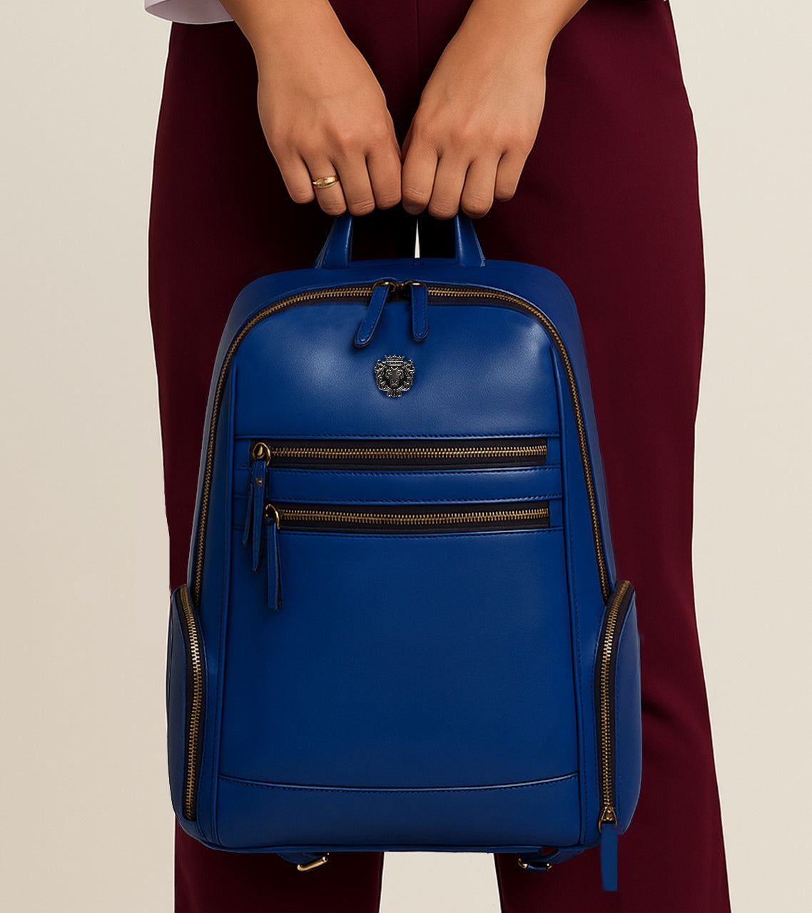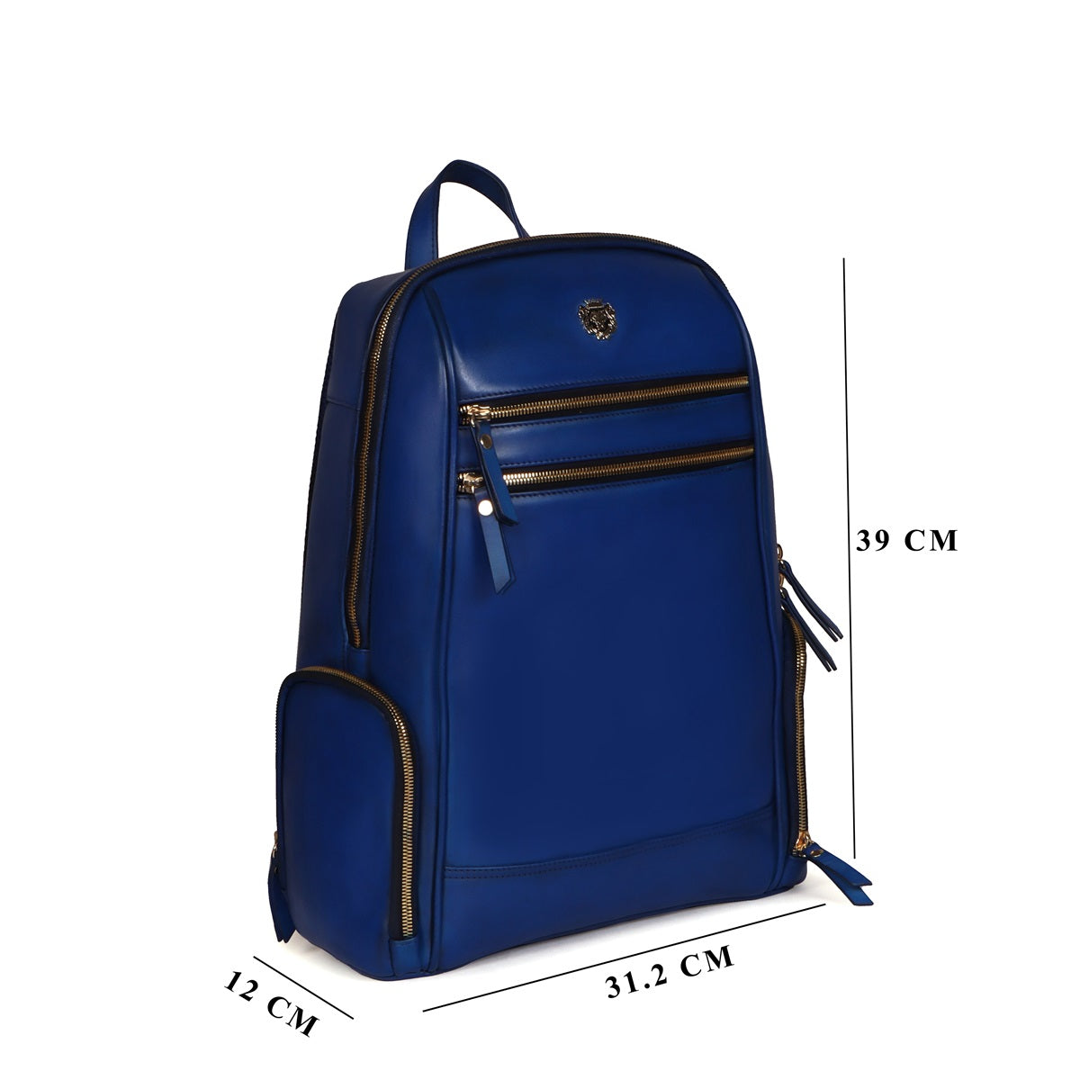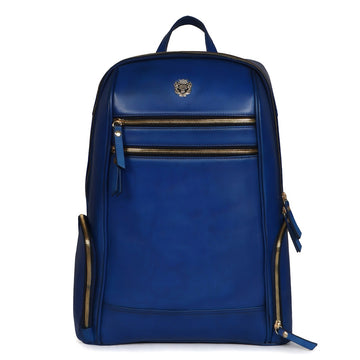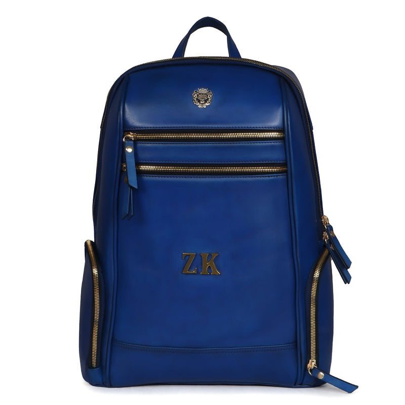 Blue Italian Leather Multi-Pockets Metal Lion Logo Women's Backpack