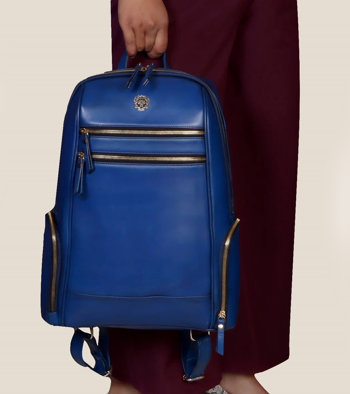 This stylish leather backpack by BRUNE & BARESKIN is an amazing travel accessory. This sleek Italian leather backpack is a perfect buy for the girls who want the style game on point. It features the signature Brune & Bareskin Metal Lion logo on the front. The multi-step pockets are there to carry the essentials for you. It has two side pockets and one main pocket at the front along with two mini pockets at the top. Its elegant look ensures to keep the every eye on you. This is a perfect accessory for a perfect airport look. Lion Logo & Different color is enhancing royalty of the products. The precisely created size makes it easy to go in flights as check-in luggage bag. Padded straps and back make it very comfortable while carrying on shoulders. You can click on CUSTOMIZE NOW Button (Just above the "ADD TO CART" button) & fill out the form to submit your customization requirements. Or you can reach us by Call, Email, WhatsApp, and DM.
