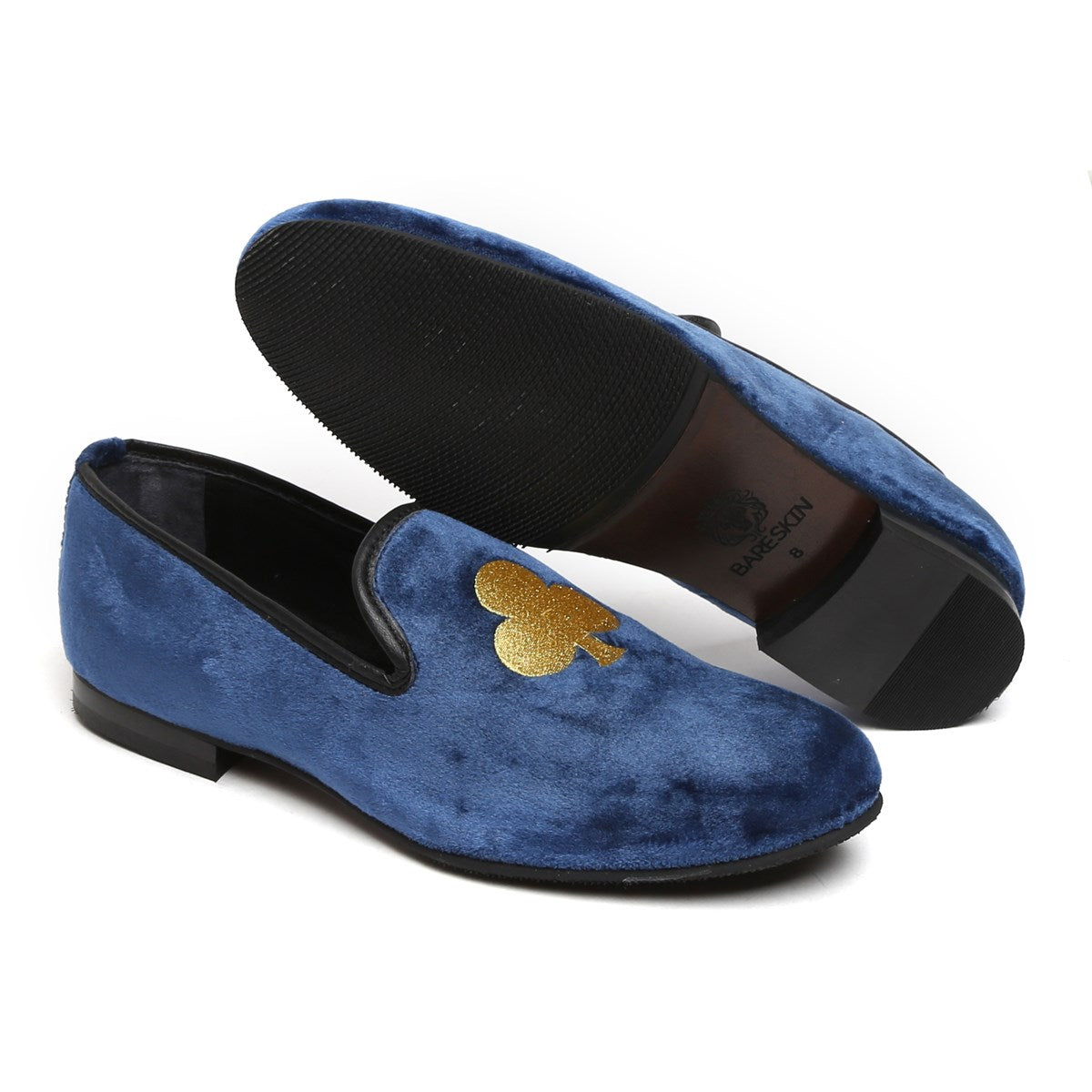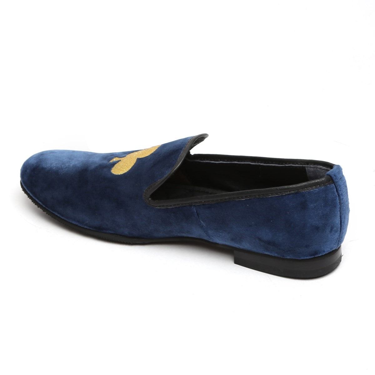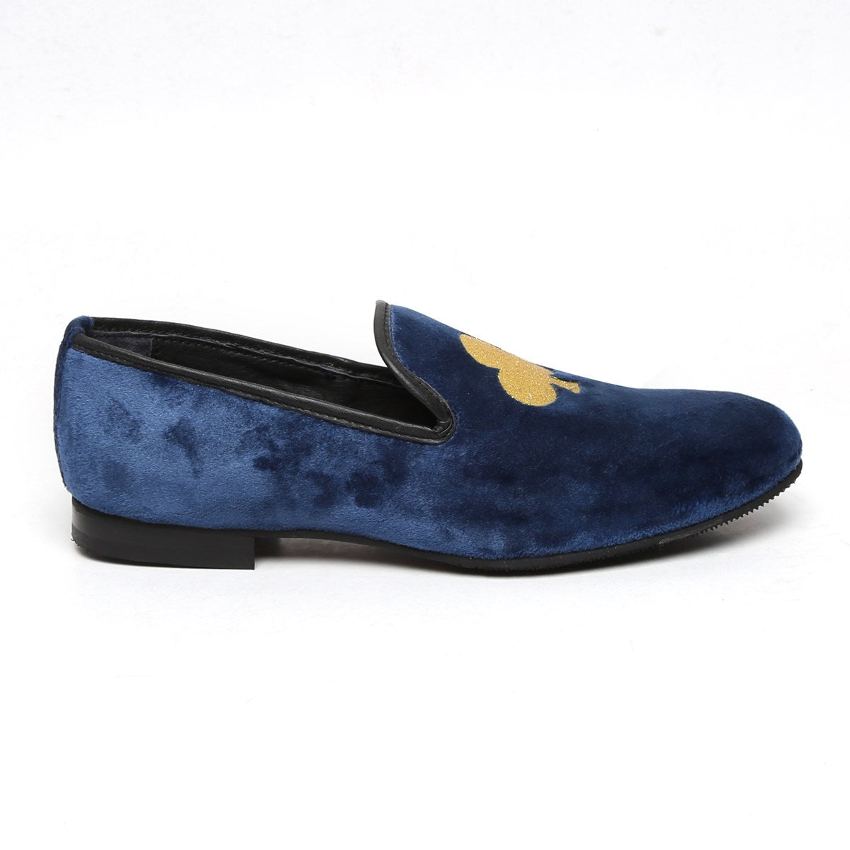 An elegant pair of Blue slip on shoes is a must-have for every well dressed man. This smooth Leather/Velvet Blue Slip-on with Poker special Golden Embroidery Moccasin offered by Brune & Bareskin gives an elite style and debonair look. It coms with an extra cushioning insole to give super softness/lightness to the feet that wears these Brune & Bareskin slip on shoes. This will be an amazing addition to your collection. This shoe comes with a special dust bag for velvet shoes and Indian climate.