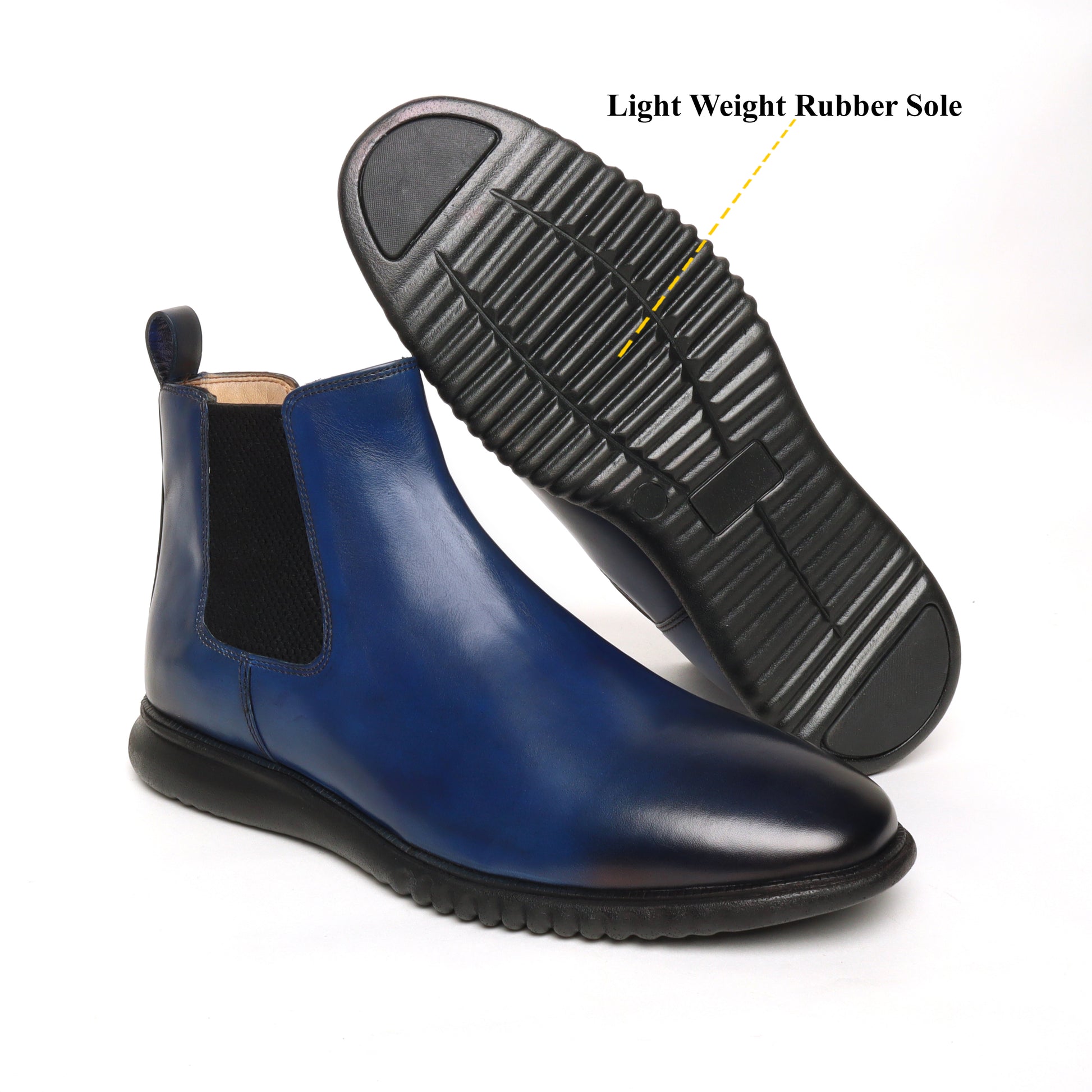 This high-ankle length blue leather Chelsea boot is one of a kind for your wardrobe. The weight of the shoe is less then 500 gms with Flat sole. The memory foam insole provides a super comfy walk all day long.