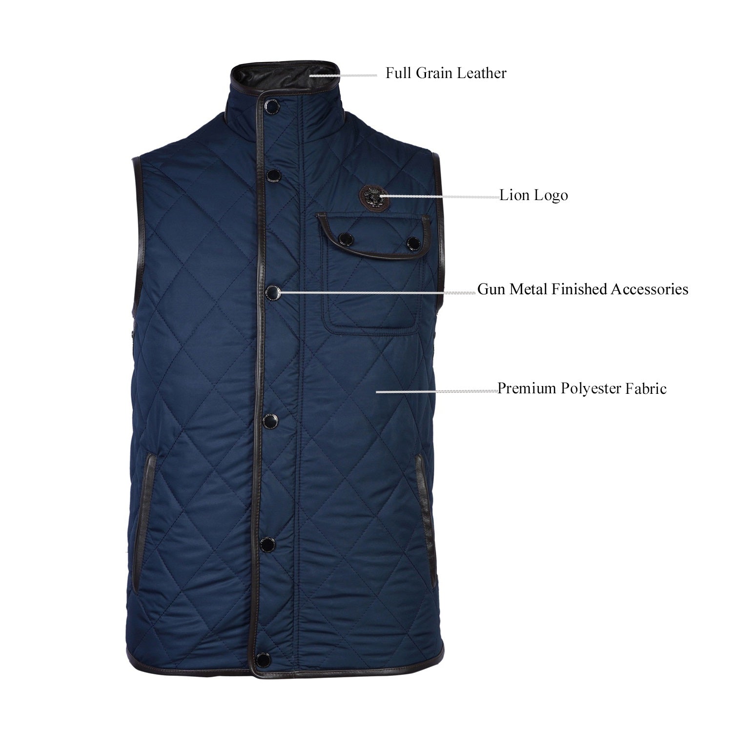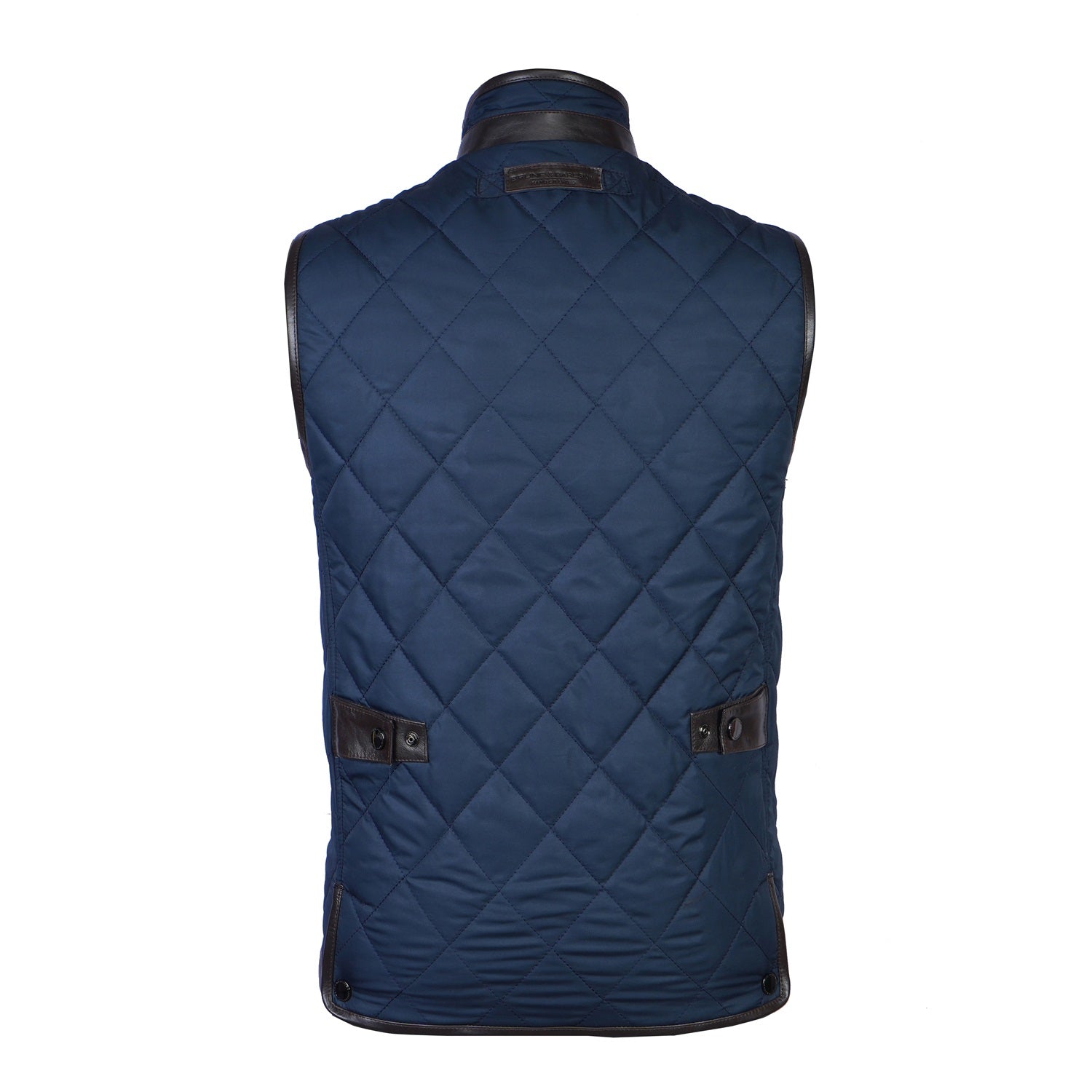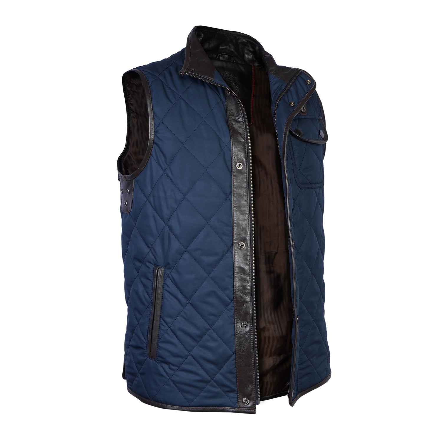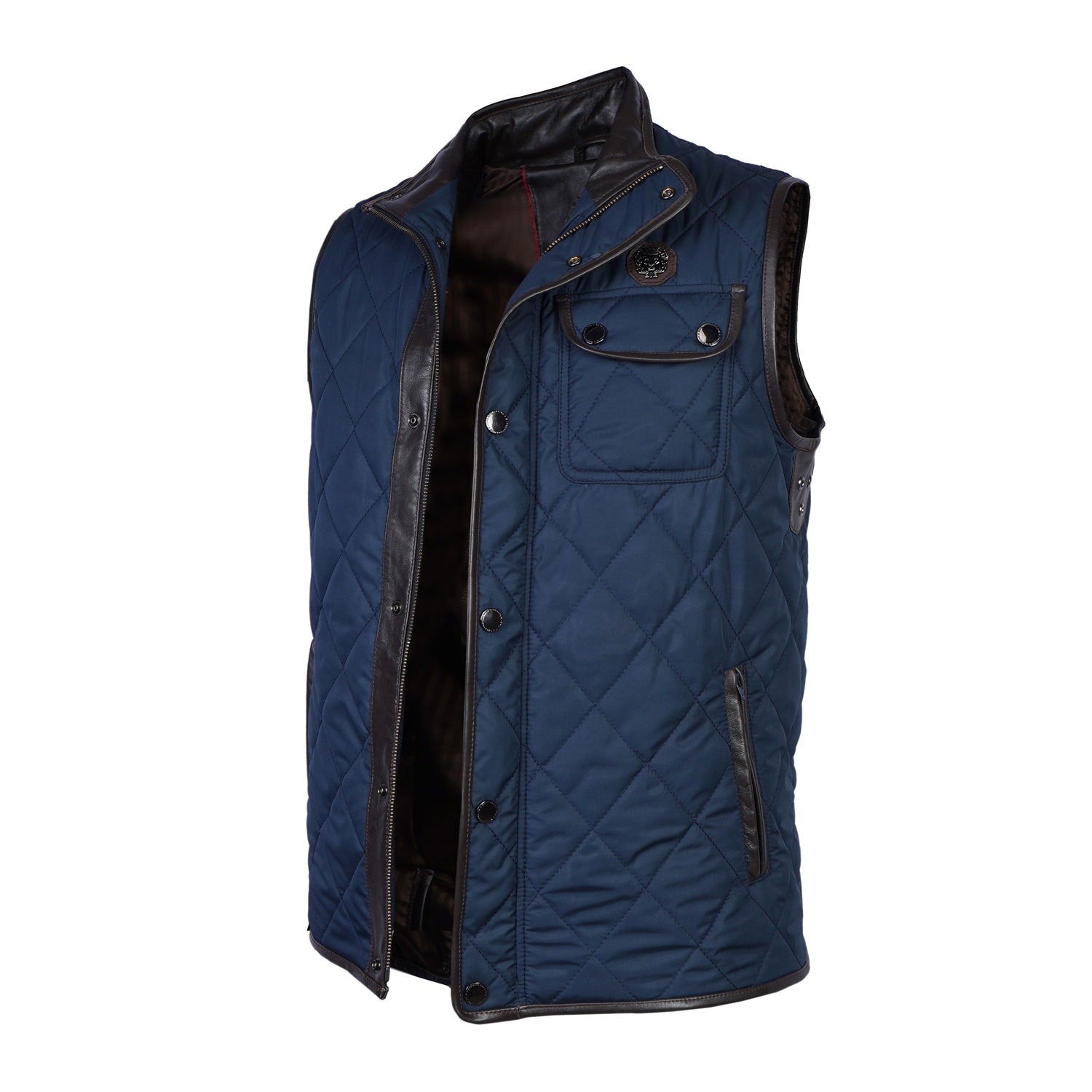 Look sophisticated and exclusive with this quilted, luxurious puffer vest. This men's puffer vest from Brune & Bareskin is perfect for any outdoor adventure. With its blue color, diamond stitched pattern, and contrasting leather trims, this vest looks great, plus it's water-resistant and warm. It also features a stand-up style collar with front buttoned over hidden zipper closure, one Chest Pocket, two front waist pocket with an additional side entry pocket. Conquer every challenge with style.