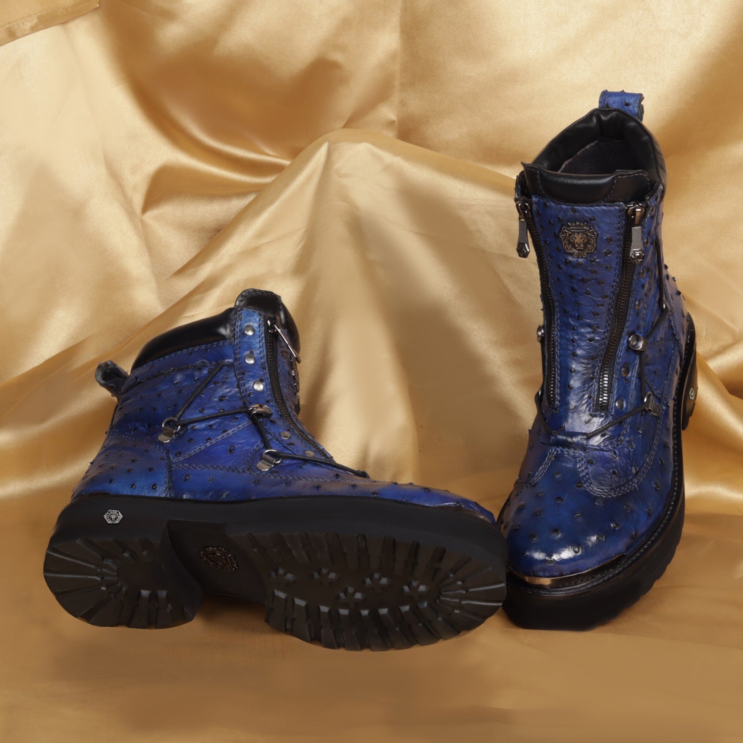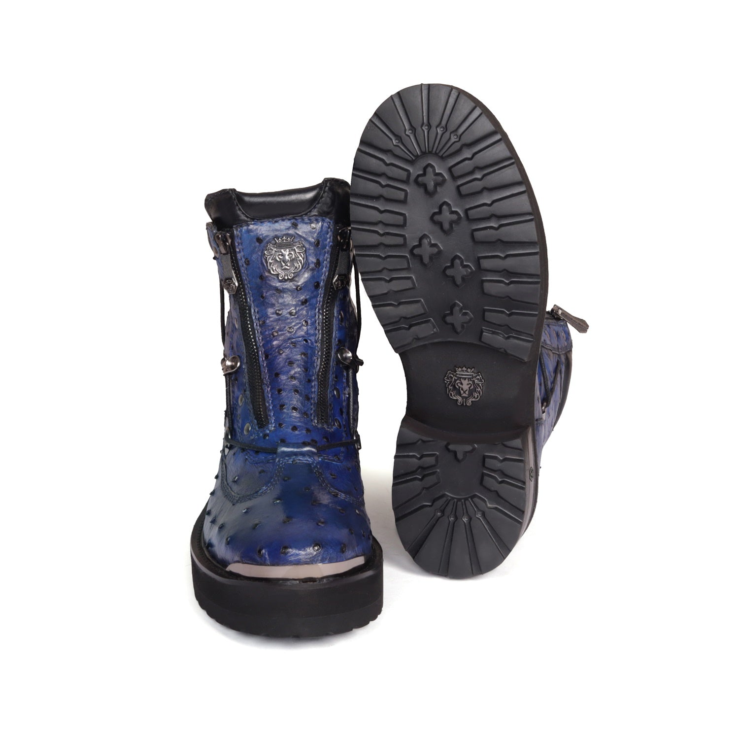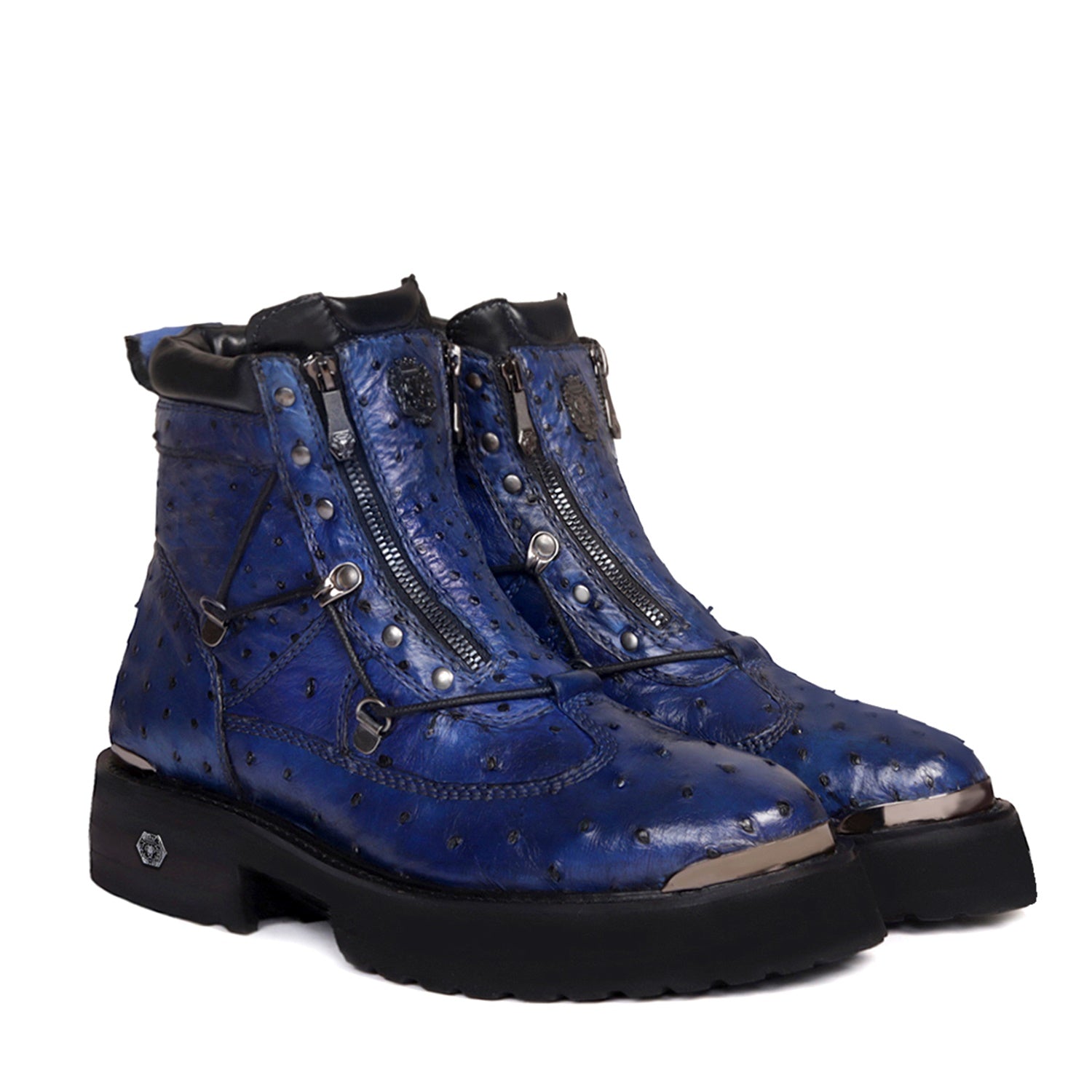 Chunky Boot in Real Ostrich Blue Leather With Metal Plate