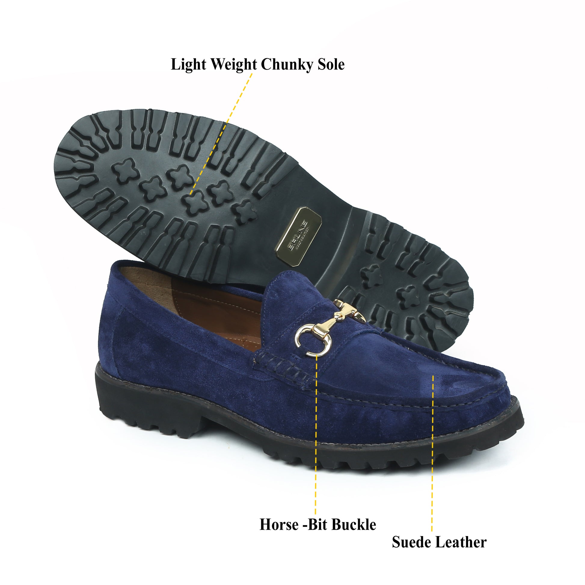 Chunky Sole Blue Loafers in Suede Leather With Horse-bit Buckle