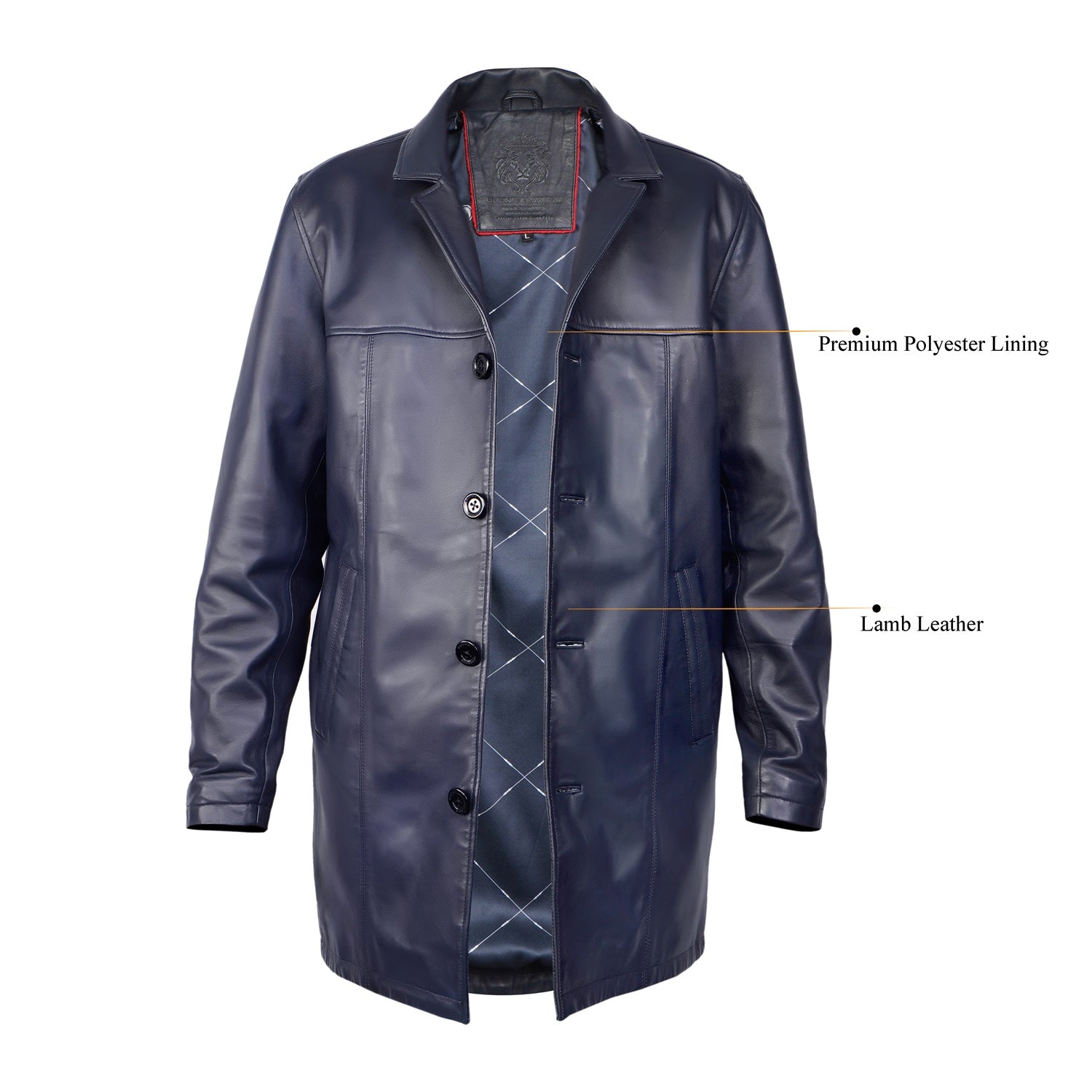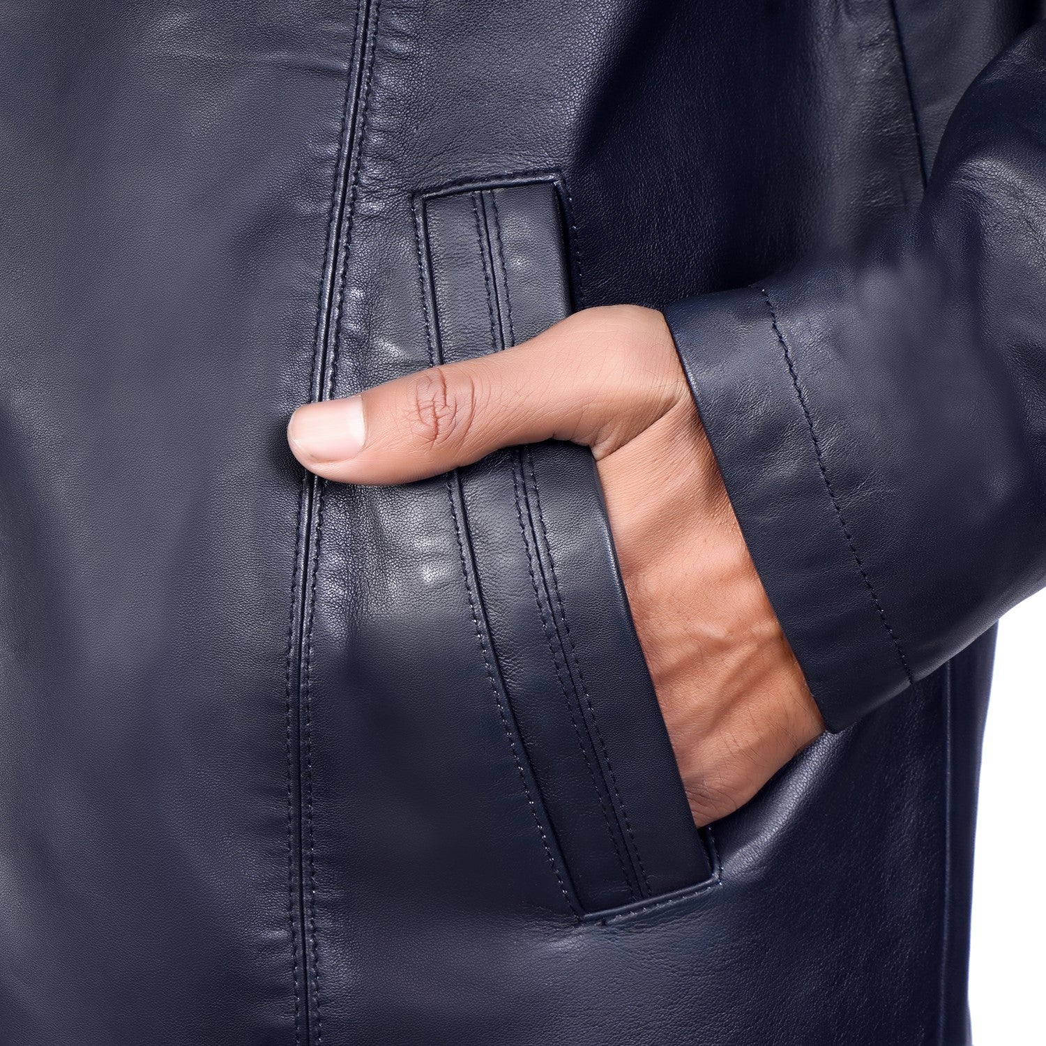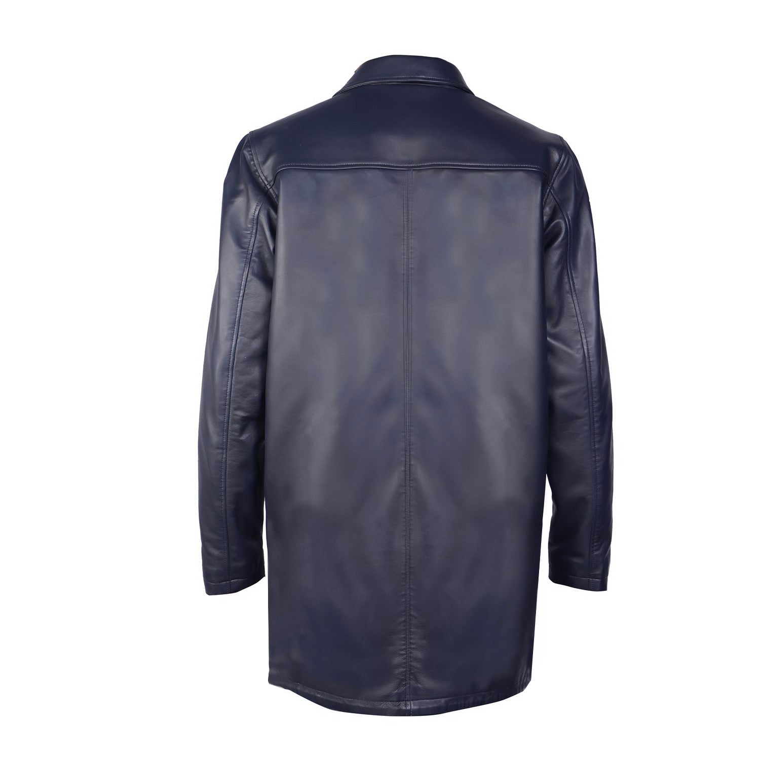 Premium Long Blue Leather Jacket with Shirt-Style Collar