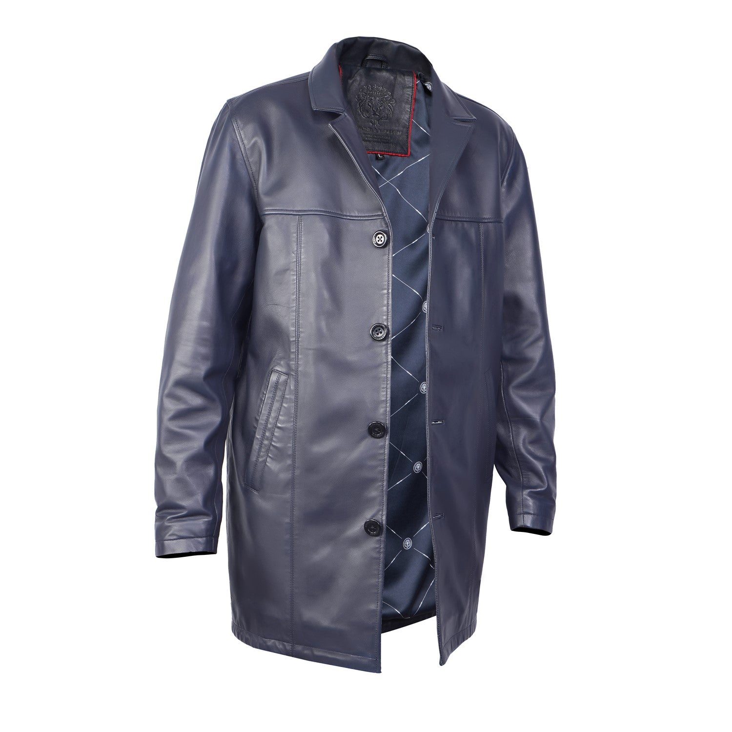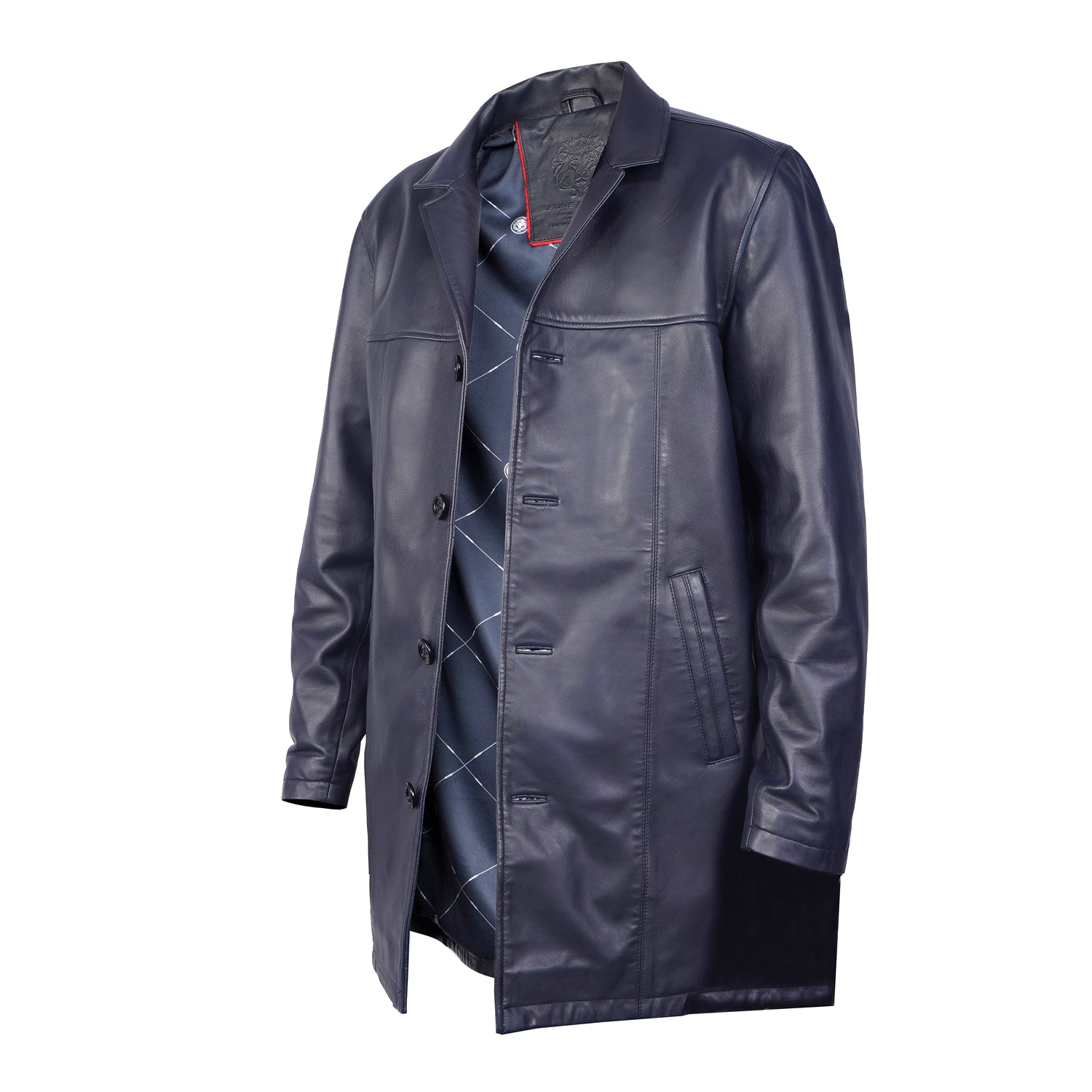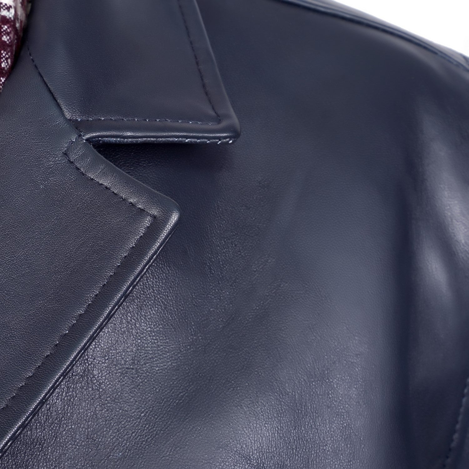 Premium Long Blue Leather Jacket with Shirt-Style Collar