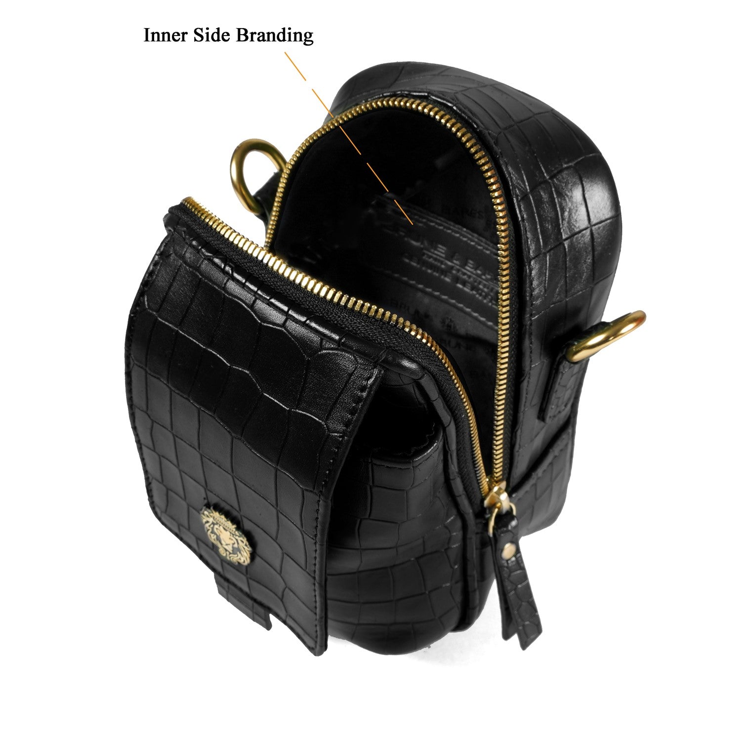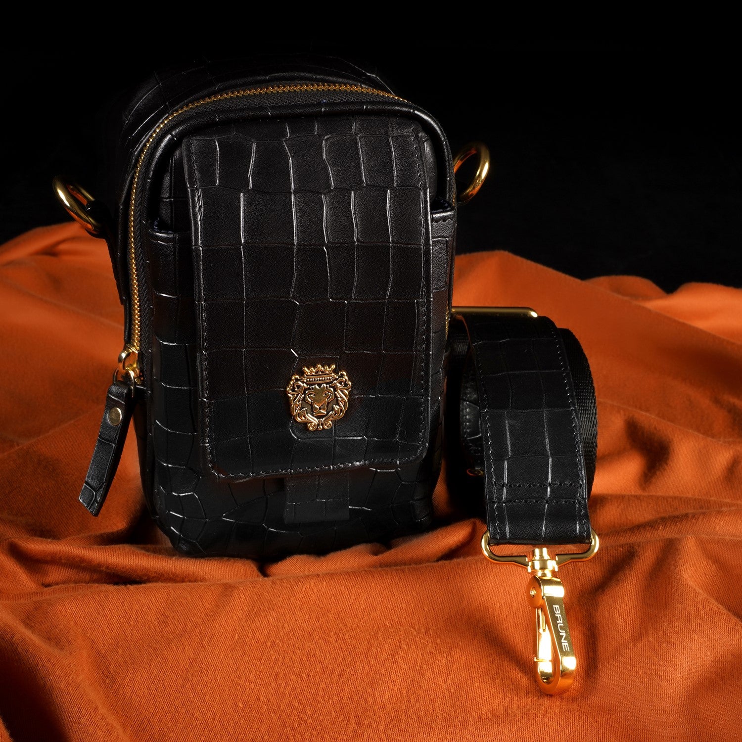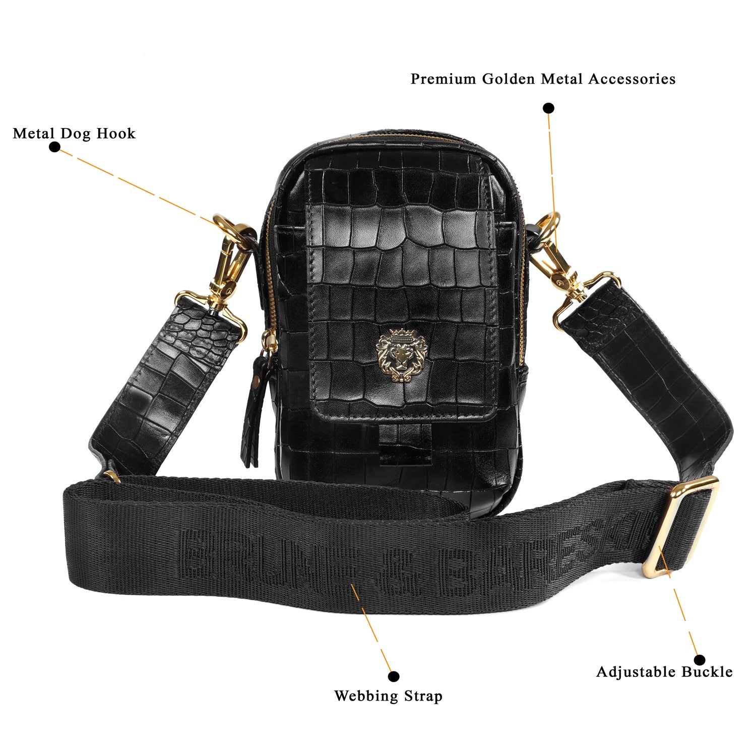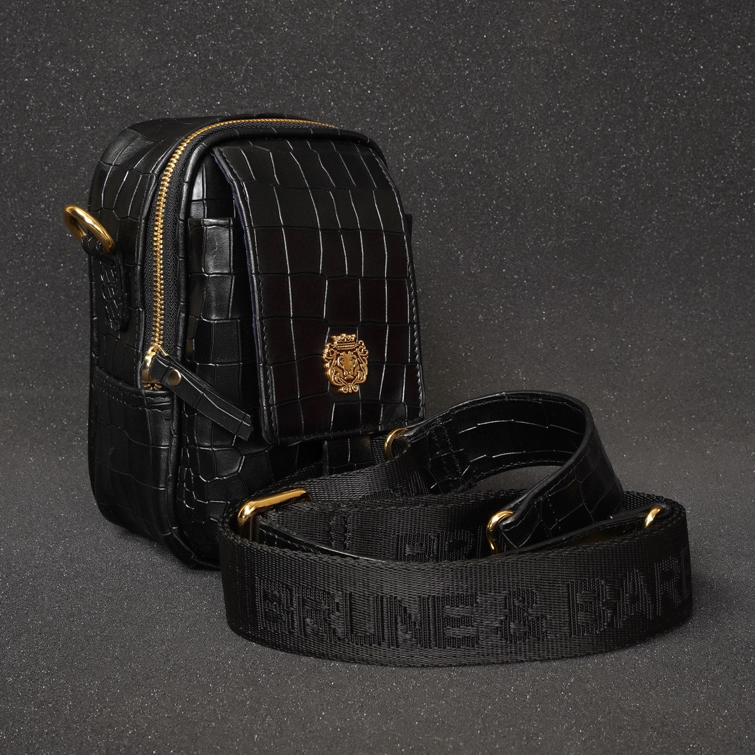 Carry your essentials in style with Brune & Bareskin's Branded Strap Black Cross-Body Bag. Crafted from premium quality, deep cut Croco embossed leather, this durable bag features a burnished effect and a detachable dog hook strap. Perfect for travel or everyday use, its classic flap-over zipper closure and gold finish Metal Lion Brand logo add a touch of sophistication.