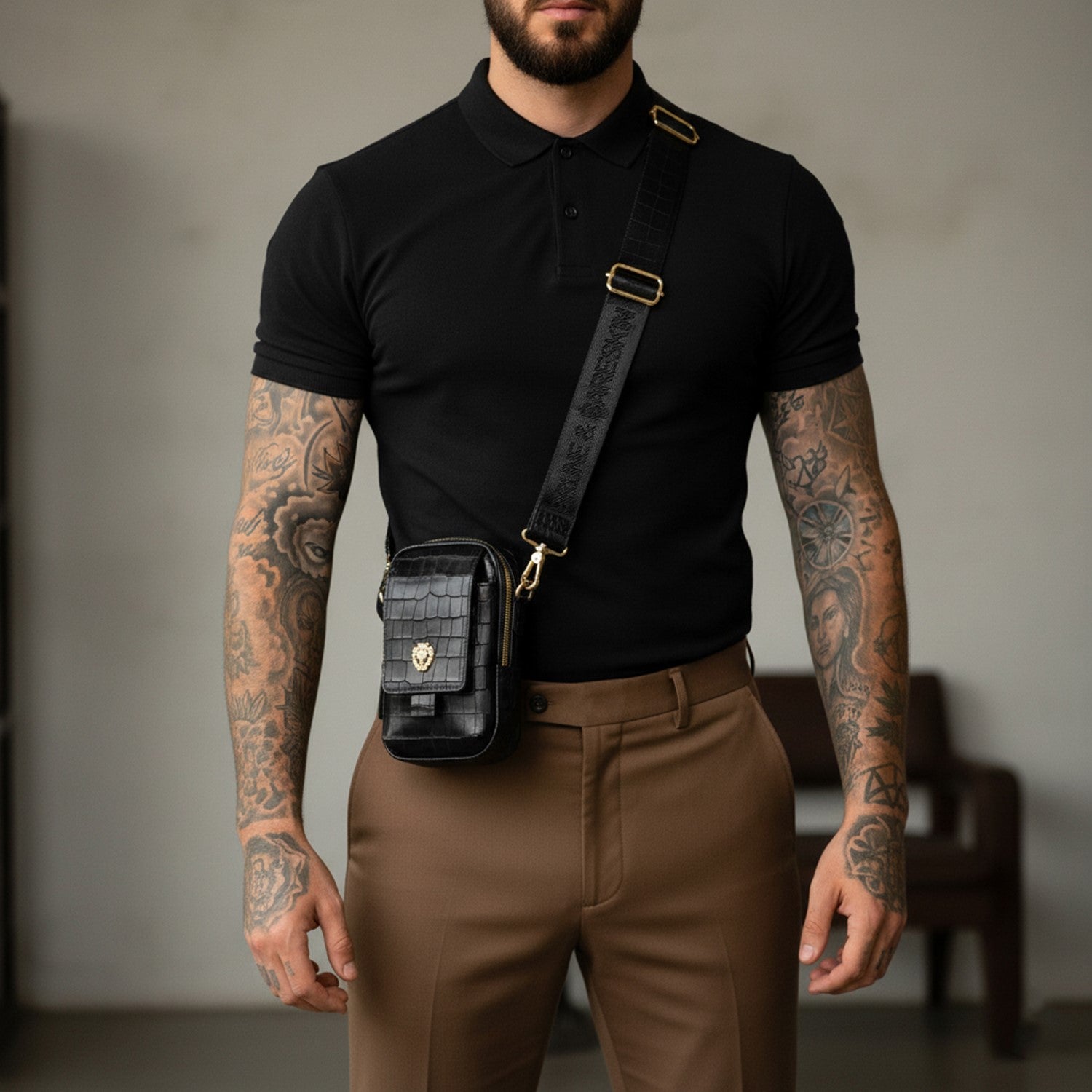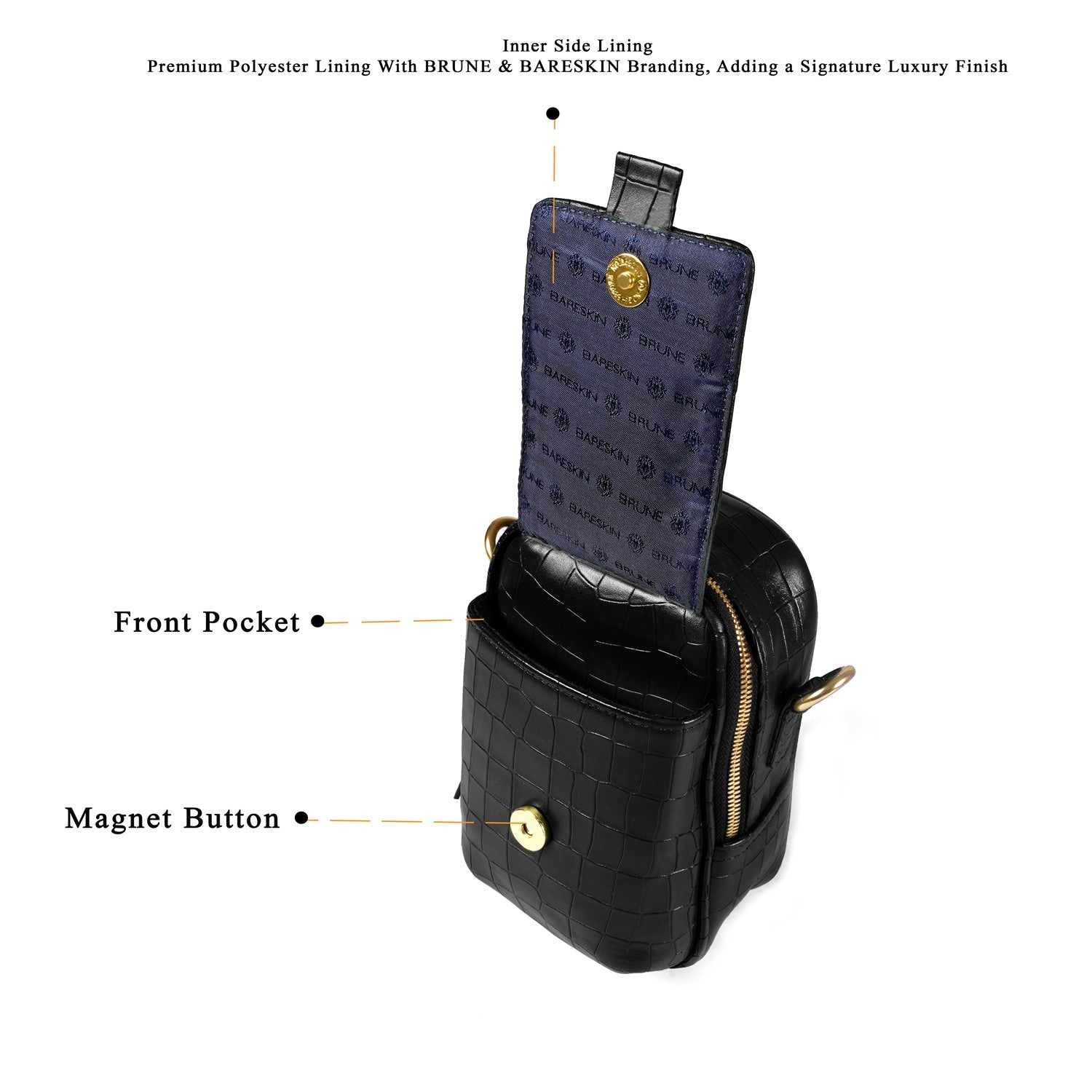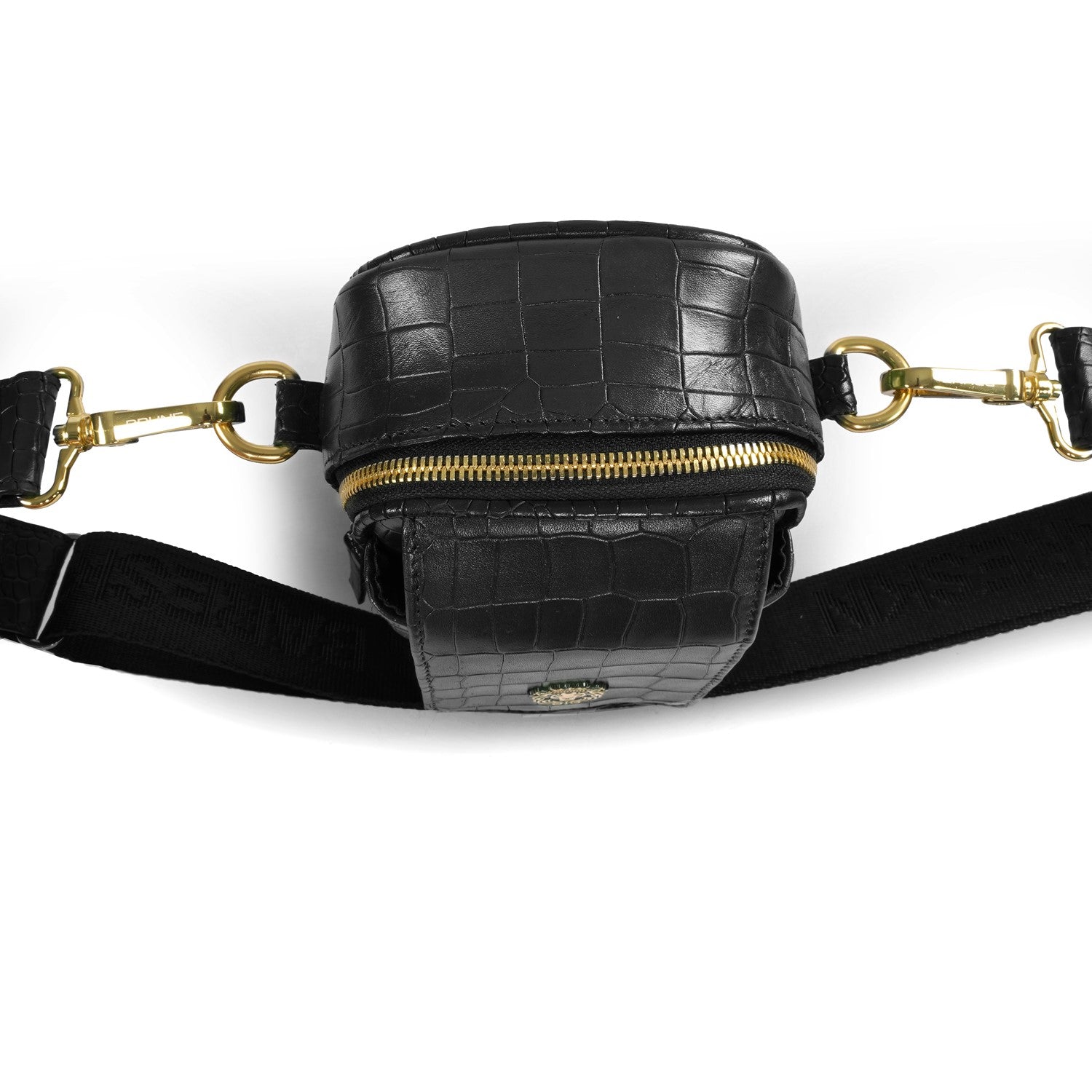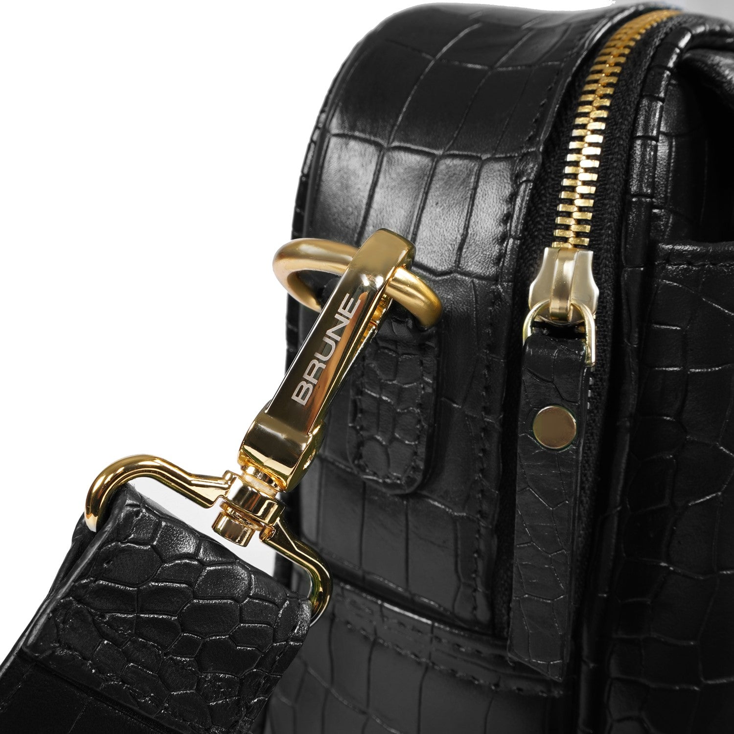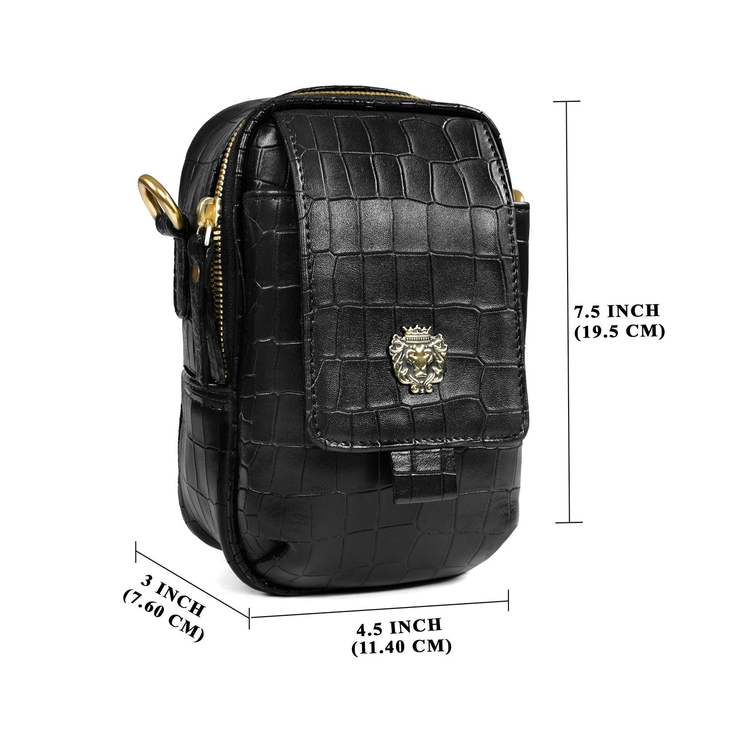 Carry your essentials in style with Brune & Bareskin's Branded Strap Black Cross-Body Bag. Crafted from premium quality, deep cut Croco embossed leather, this durable bag features a burnished effect and a detachable dog hook strap. Perfect for travel or everyday use, its classic flap-over zipper closure and gold finish Metal Lion Brand logo add a touch of sophistication.