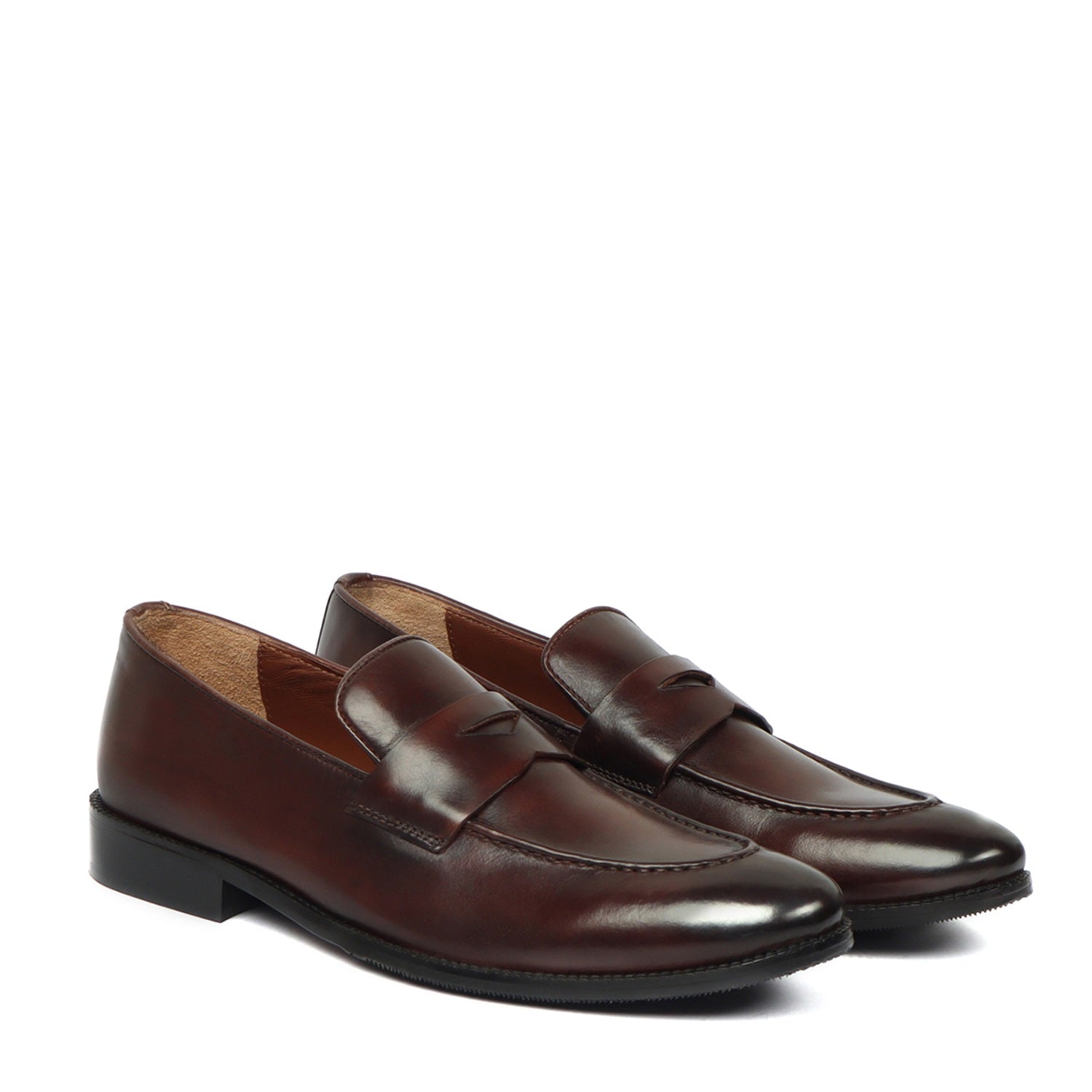 Dark Brown Burnished Leather Penny Loafers with Triangular Cut-Strap By Brune & Bareskin