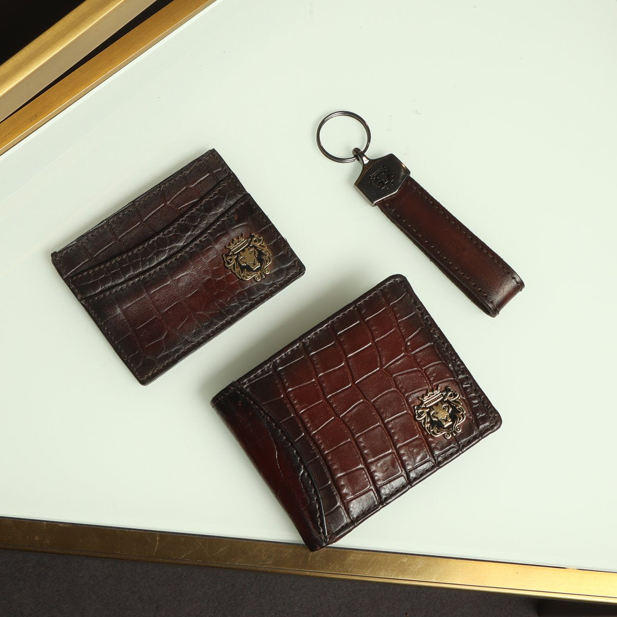 Brown Combo Croco Print Leather Wallet, Card Holder and Stylish Key Chain By Brune & Bareskin
