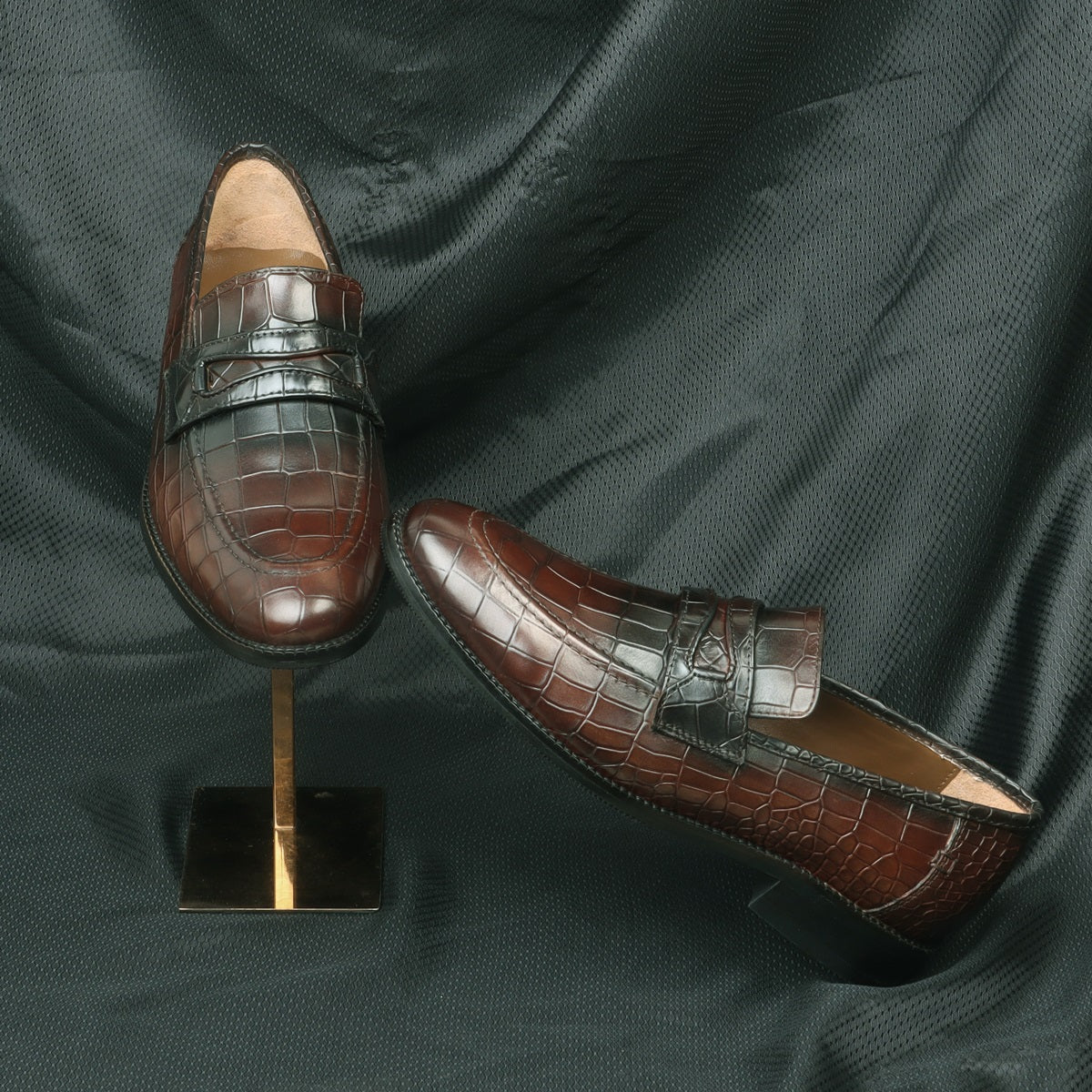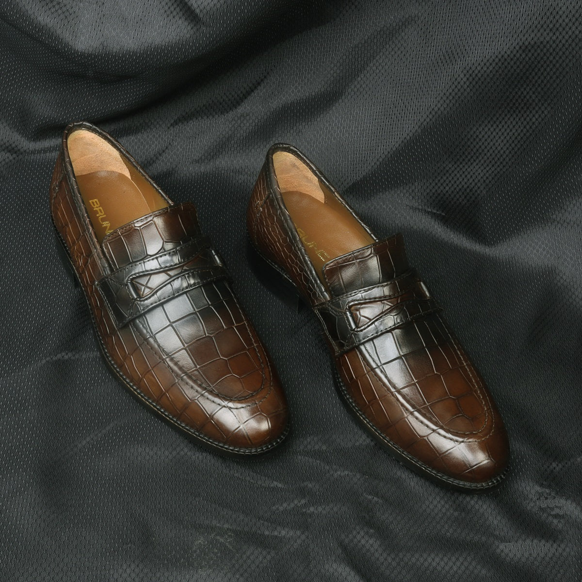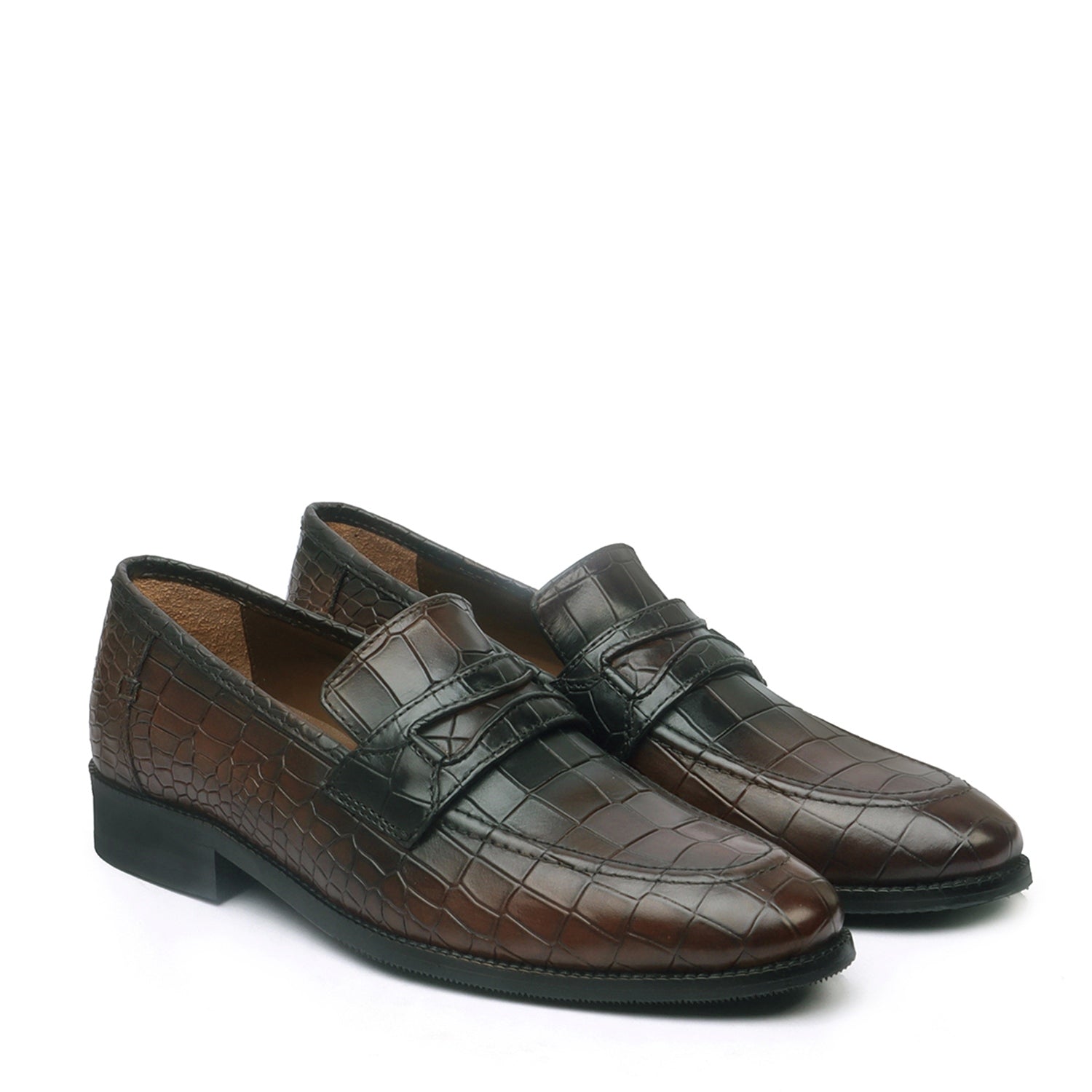 This pair of snug-fit, loafers shoes in astonishing Croco print leather is ideal for everyday wear to the office or for meetings with clients. The round apron toe adds an element of perfect style while the rounded and narrow heel ensures a snug fit as well as foot balance. The patina finish provides an artistic elegance to it. When you choose to wear branded, shoes by BRUNE & BARESKIN, you are sure to get more than a few glances coming your way. The contrasting rubber sole enhances the overall presentation of the shoe. Flaunt your fashion style in this pair of hand-painted leather shoes for your first one-to-one with your boss, and come away leaving an unforgettable impression.