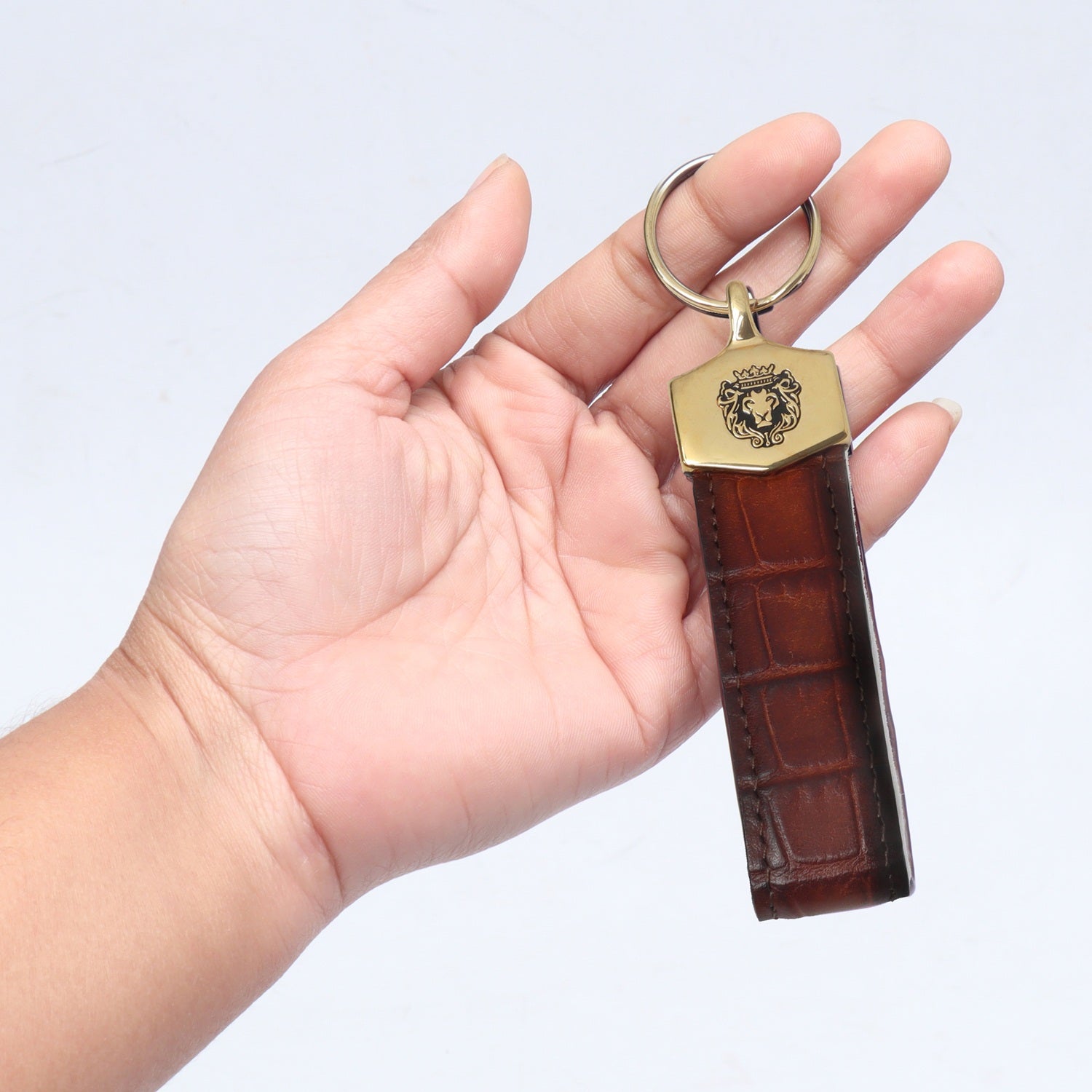 This elegant croco print leather keychain is a stylish travel accessory. The brown color leather enhances looks very chic. The gold finish fittings compliments its overall color. Brune & Bareskin signature lion logo on the center looks very chic. You can also get it customized especially for you with your name initials and favorite color.