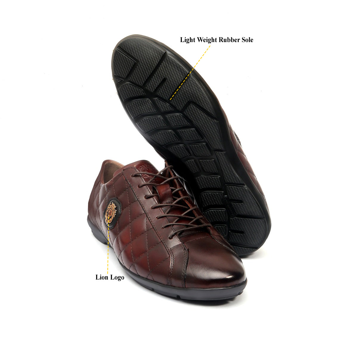 Look sporty and smart by wearing these Brune & Bareskin Brown Leather Diamond Stitched Sneakers Shoes. The metal BRUNE & BARESKIN Lion logo enhances its elegance. These Diamond Stitched sneakers have a 100% Genuine Leather upper which is crafted very precisely. The lightweight patterned Rubber Sole provided the all day long wearability. Team these shoes with casual attires of your choice to look astonishing.
